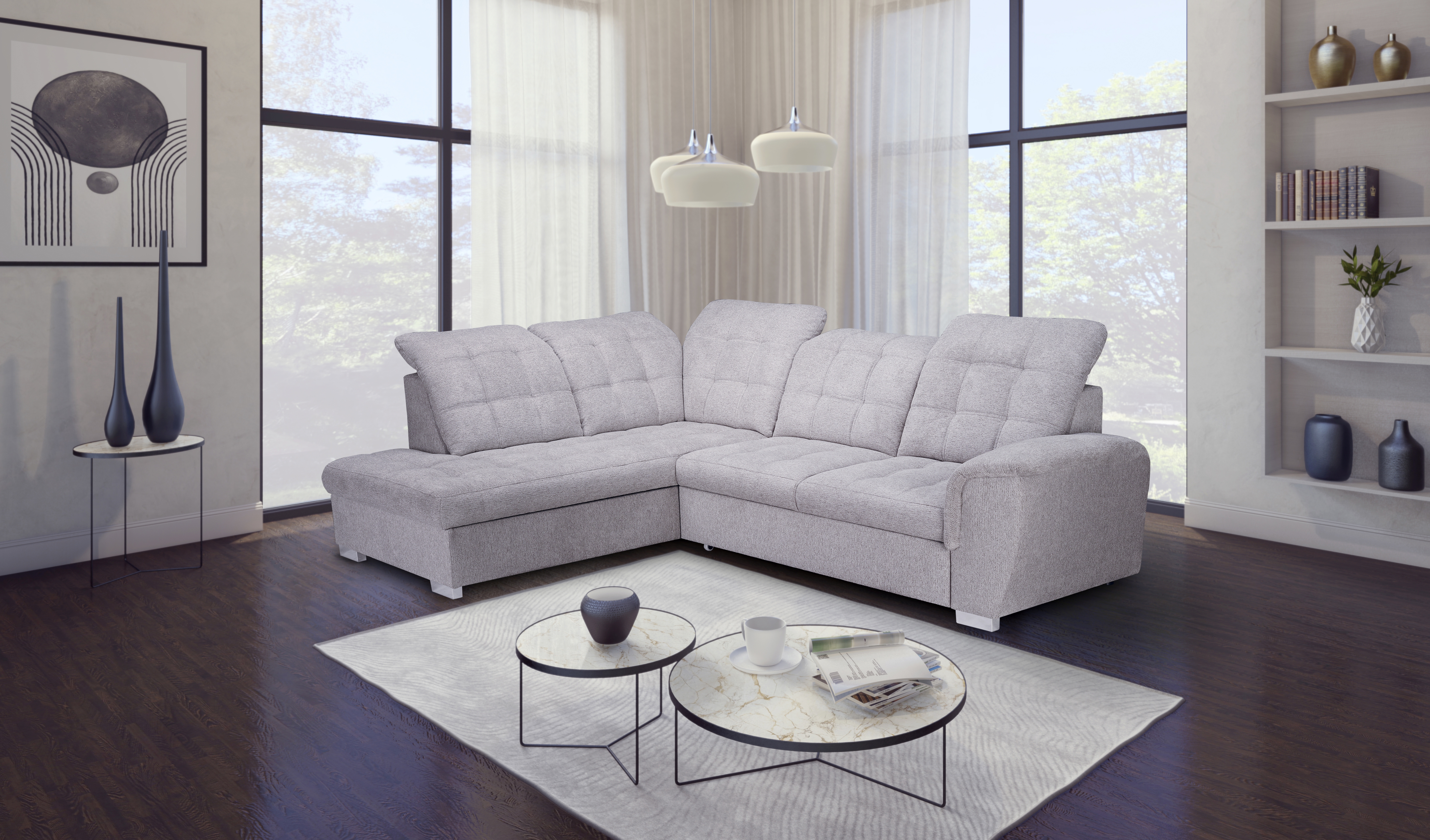 | Ausstattung Polster: | Kopfstützen, Ottomane links, inkl. Bettkasten | ||