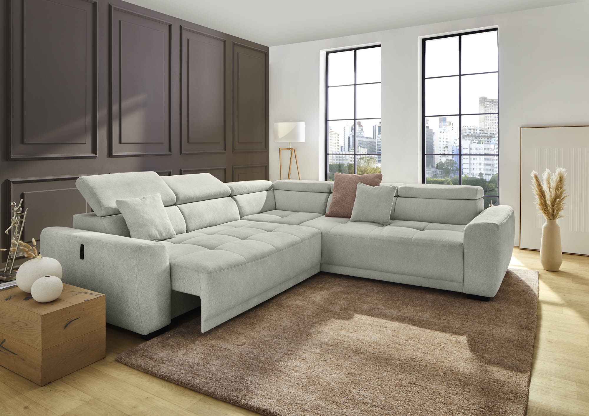 Diese moderne Polsterecke in Hellgrau bietet praktischen Komfort für den Alltag und überzeugt mit durchdachter Funktionalität. Dank der weichen Schaumpolsterung mit Wellenunterfederung sitzen Sie bequem – auch über längere Zeit. Technische Extras wie ein elektromotorischer Sitzvorzug, integrierte USB-Ladeanschlüsse (Typ A & C) und eine induktive Ladefläche machen das Ecksofa besonders alltagstauglich. Sechs verstellbare Kopfteile, Zierkissen und ein Fluppy-Kissen sorgen für zusätzlichen Komfort. Die Polsterecke kann je nach Raumaufteilung links oder rechts montiert werden – ideal für flexible Wohnkonzepte mit begrenztem Budget.