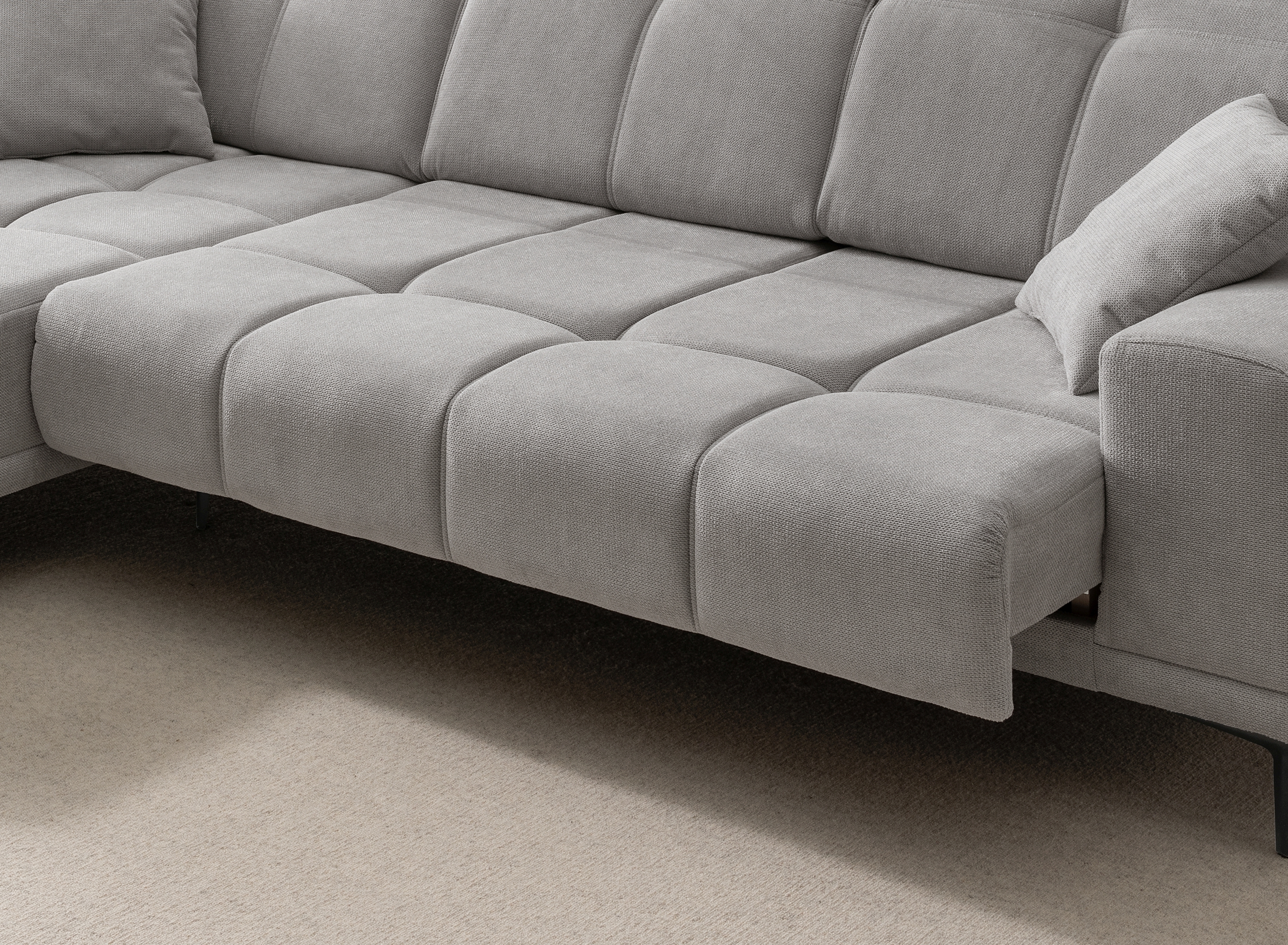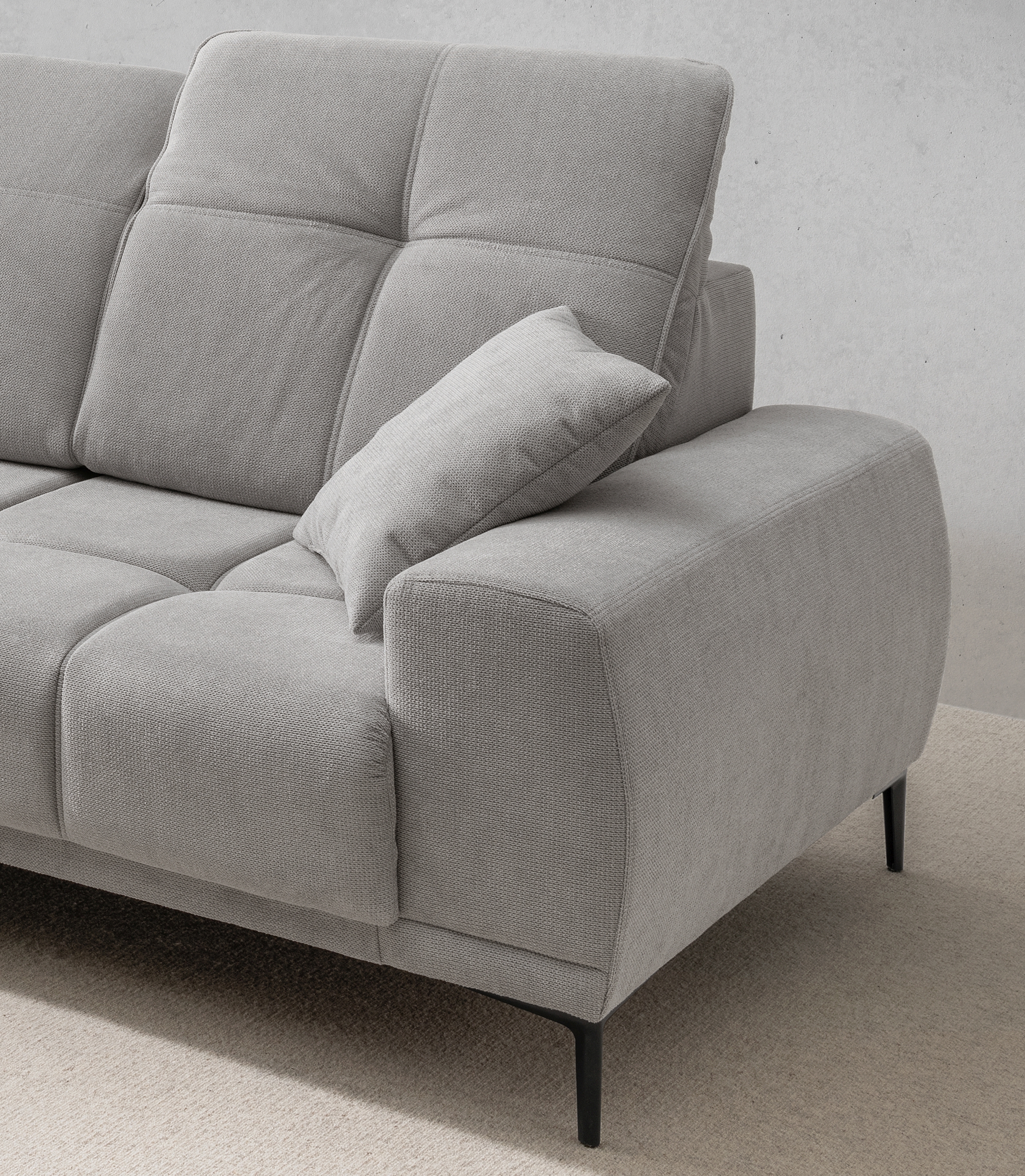 Diese moderne Polsterecke vereint Komfort und Funktionalität für den täglichen Gebrauch. Der strapazierfähige Stoffbezug in Grau ist pflegeleicht und passt in viele Wohnstile. Die Kombination aus Wellenunterfederung und Komfortschaum sorgt für bequemes Sitzen. Praktische Funktionen wie ein elektrischer Sitzvorschub und verstellbare Kopfteile bieten zusätzlichen Komfort. Der Rücken ist vollständig mit Echtstoff bezogen, wodurch das Sofa auch frei im Raum aufgestellt werden kann. Die robusten schwarzen Metallfüße sorgen für Stabilität. Ideal für alle, die funktionale Polstermöbel zum fairen Preis suchen.