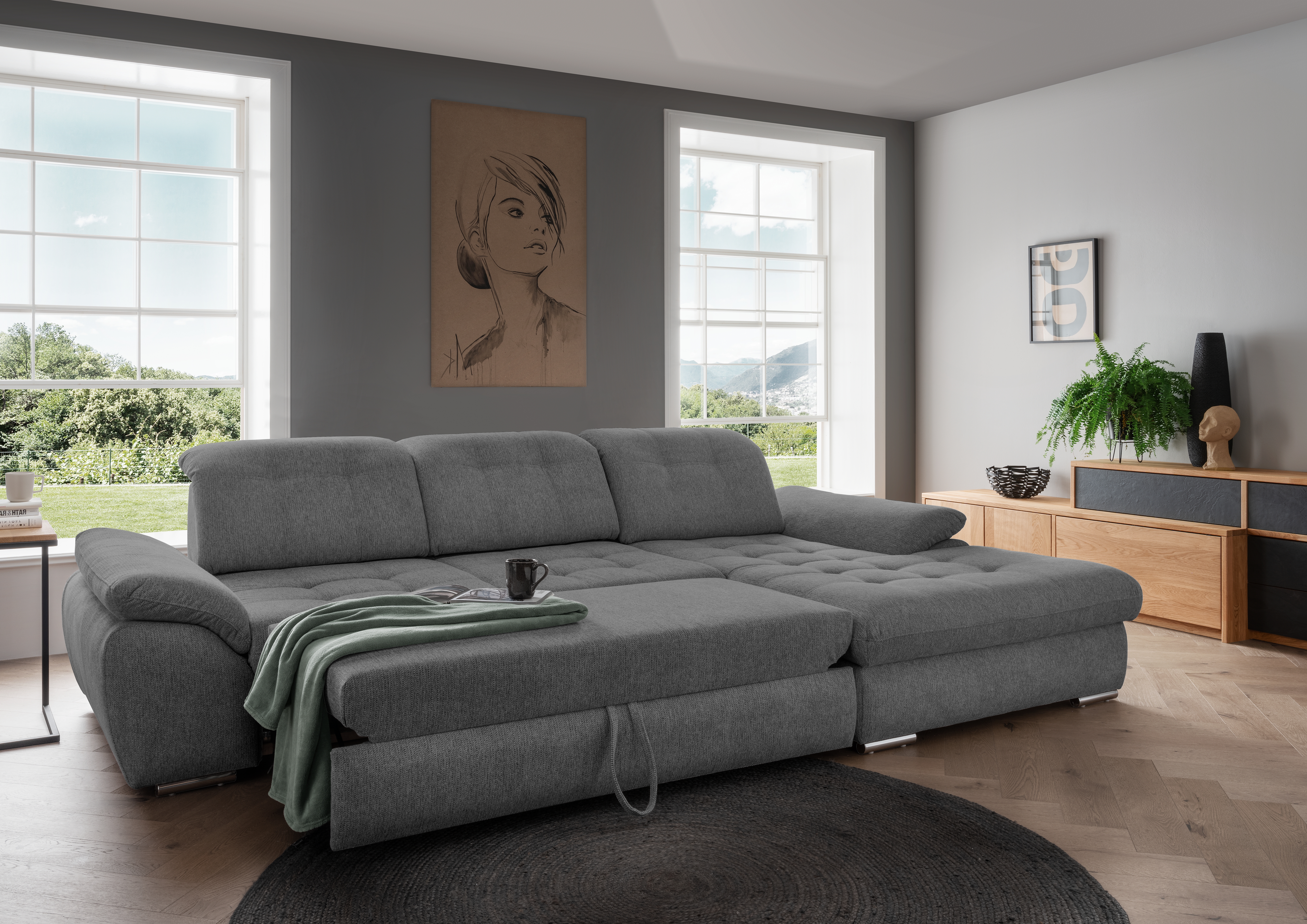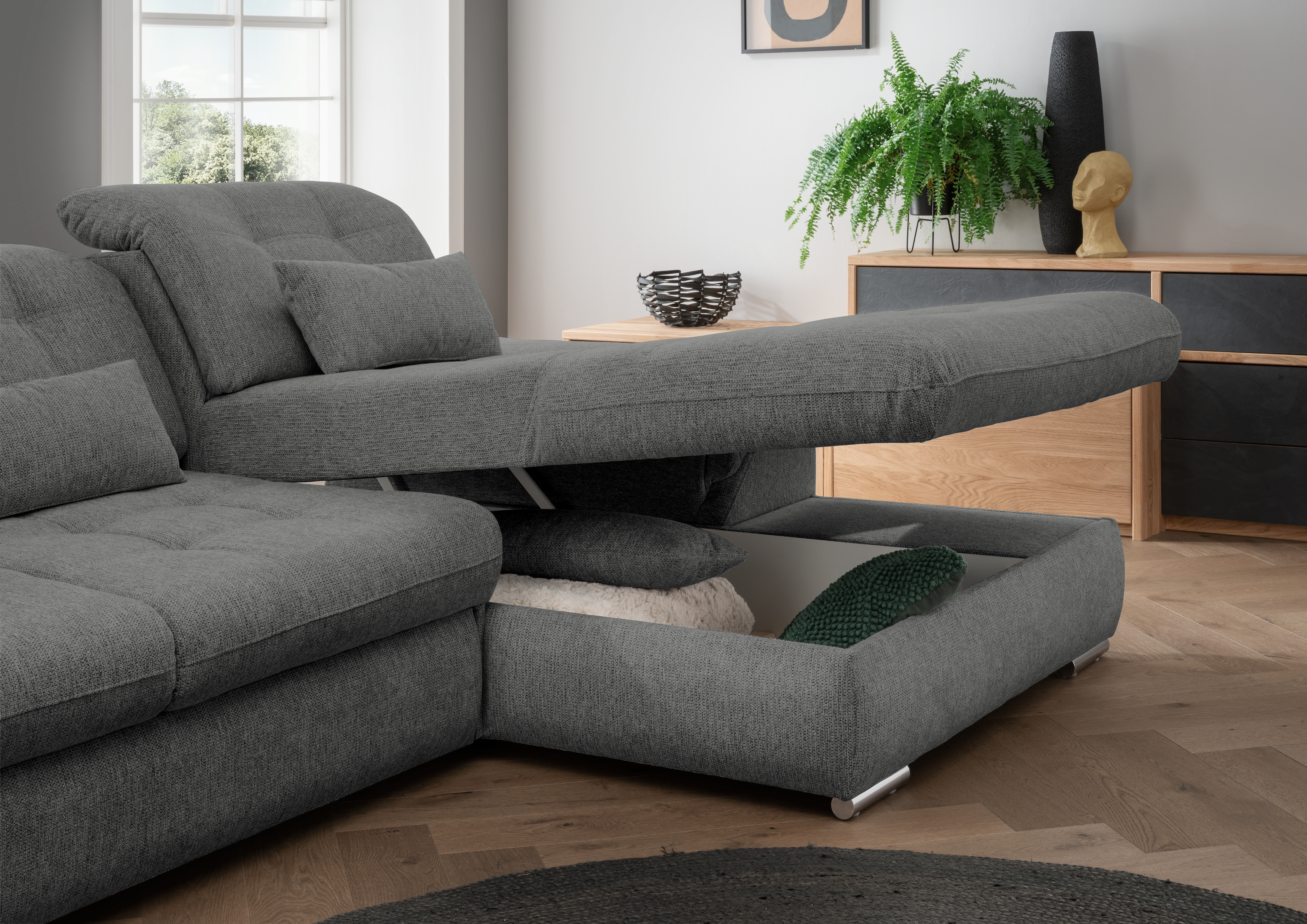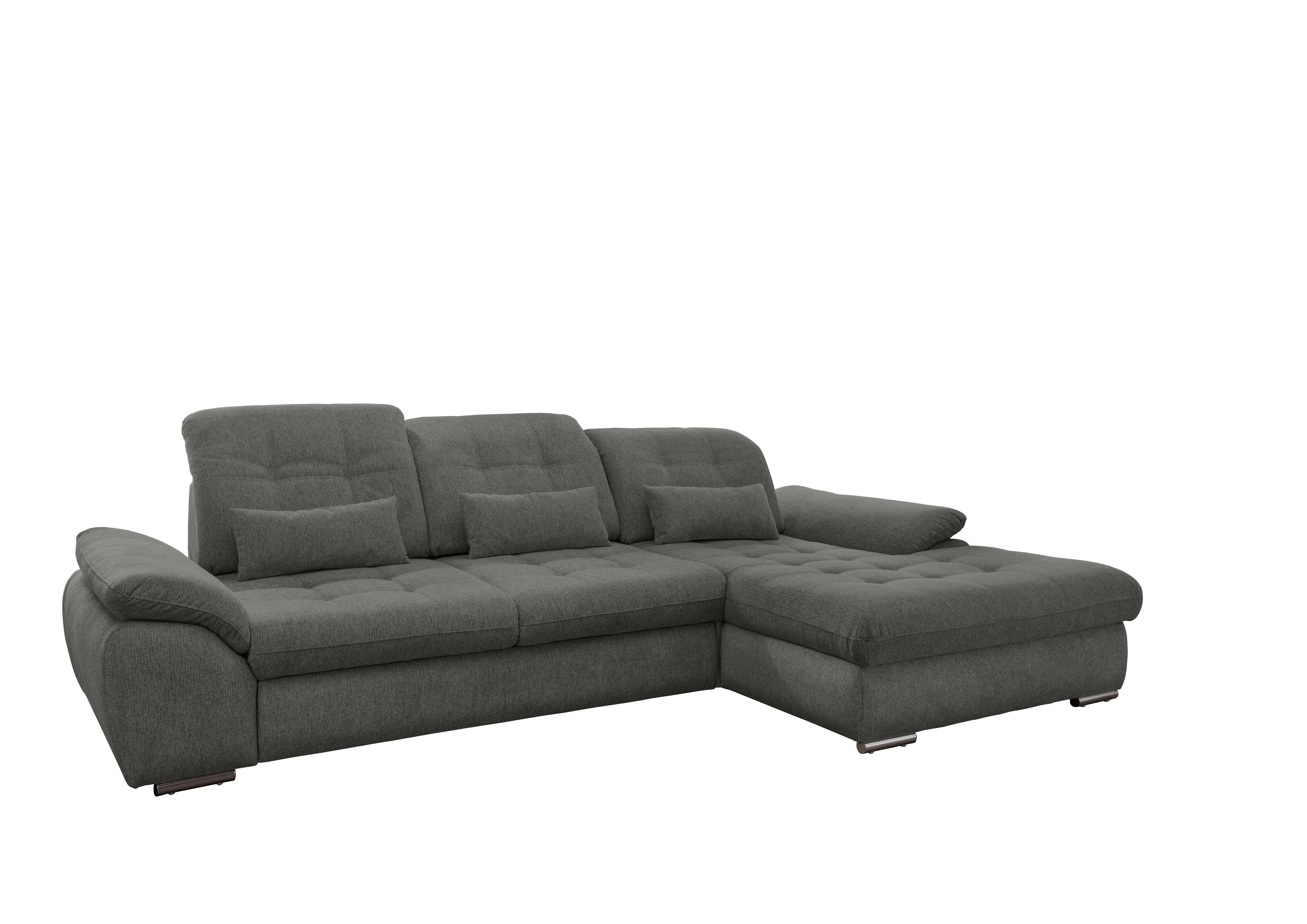 | Ausstattung Polster: | Kopfstützen, Ottomane rechts, Rücken echt, Sitzvorzug manuell, inkl. Bettkasten, inkl. Kissen | ||