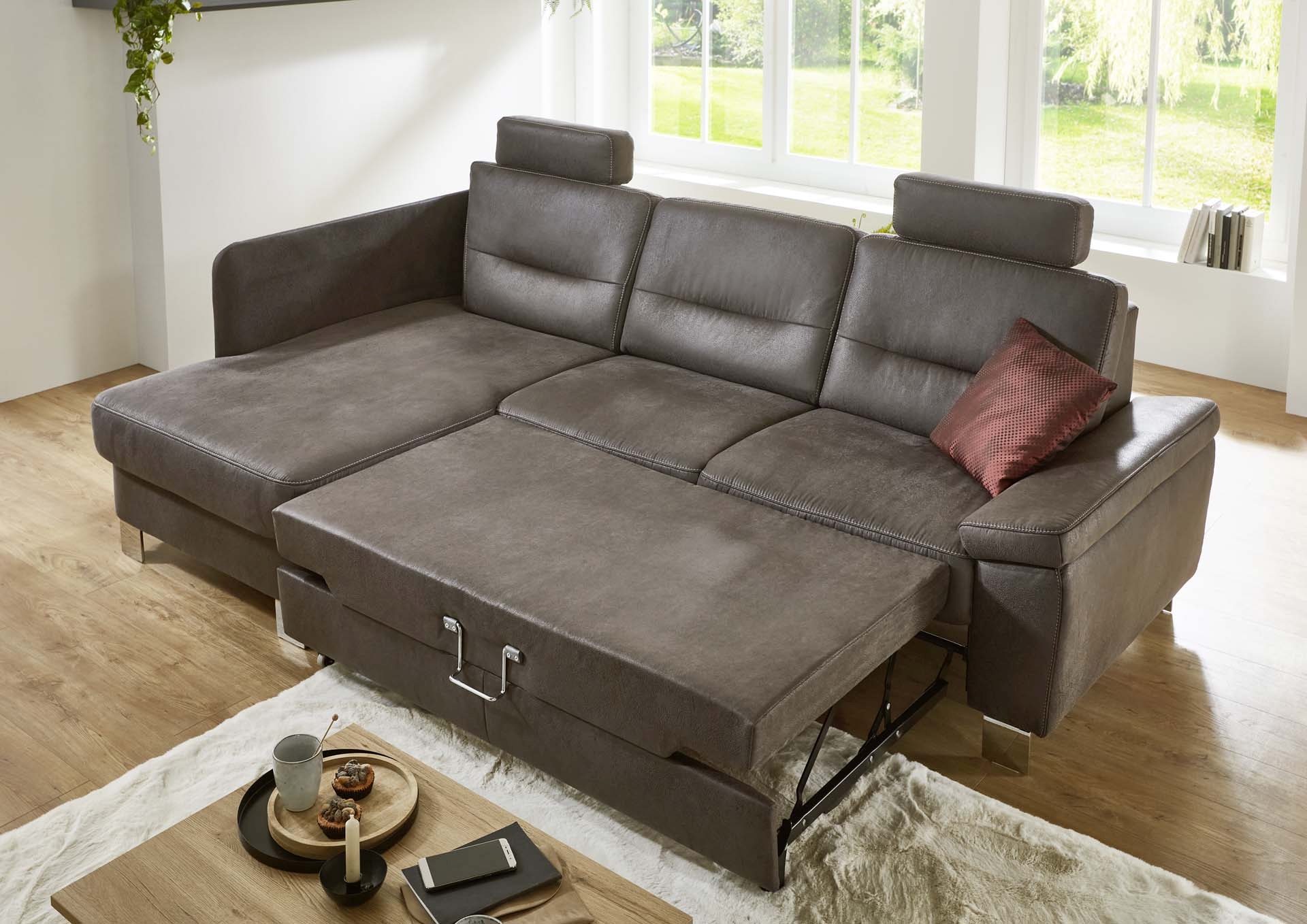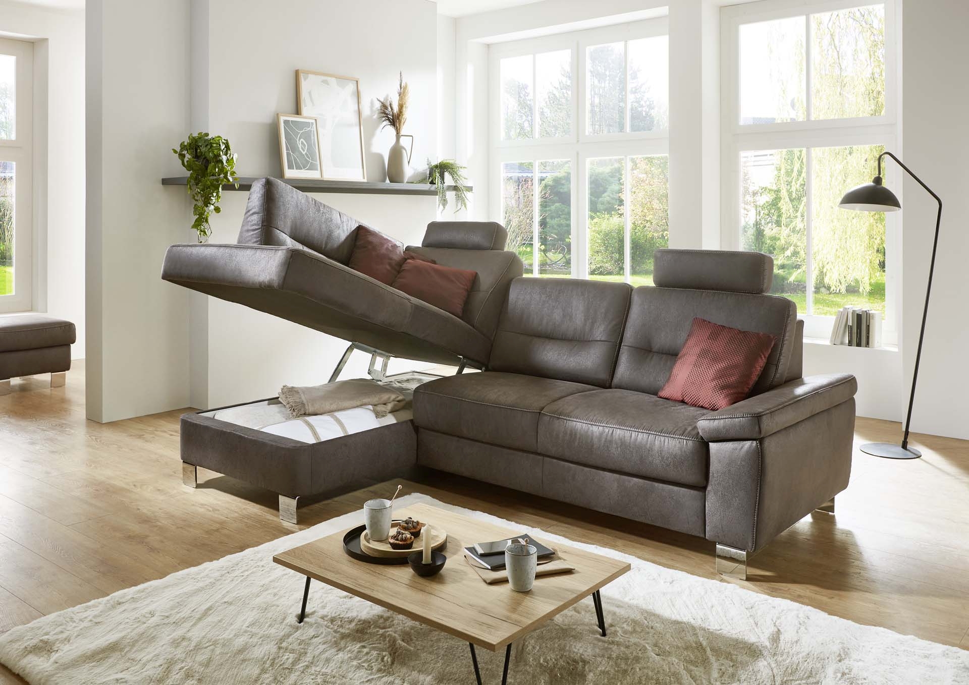 | Ausstattung Polster: | Kopfstützen, Ottomane links, Rücken echt, inkl. Bettkasten | ||