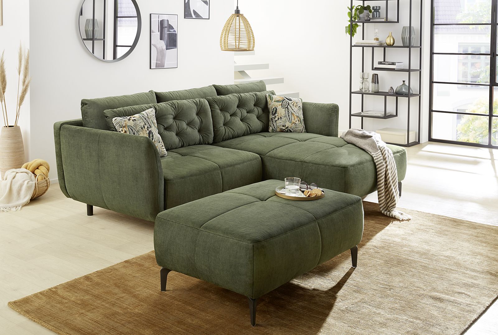| Ausstattung Polster: | Ottomane rechts links wählbar, Rücken echt, inkl. Kissen | ||