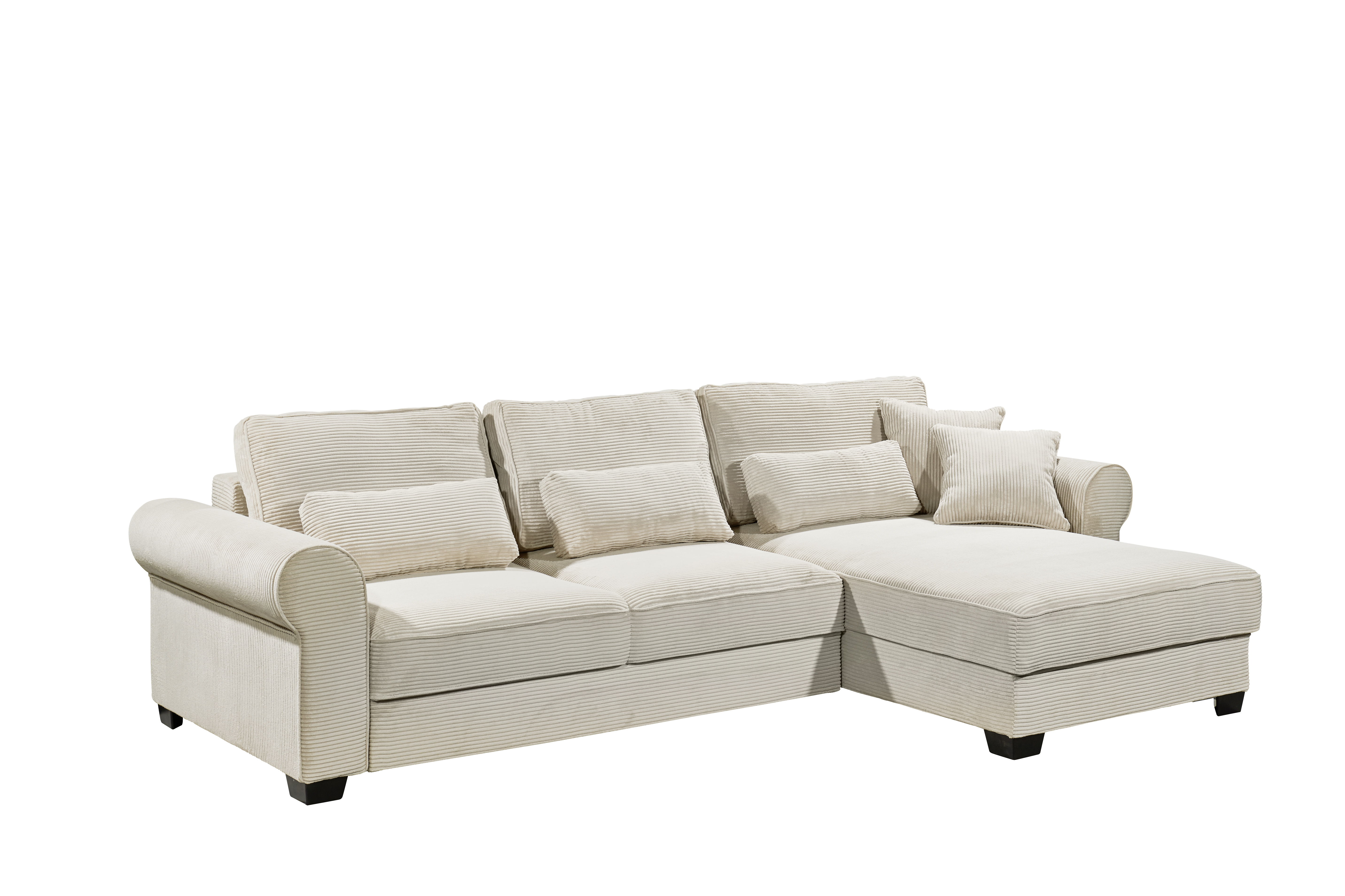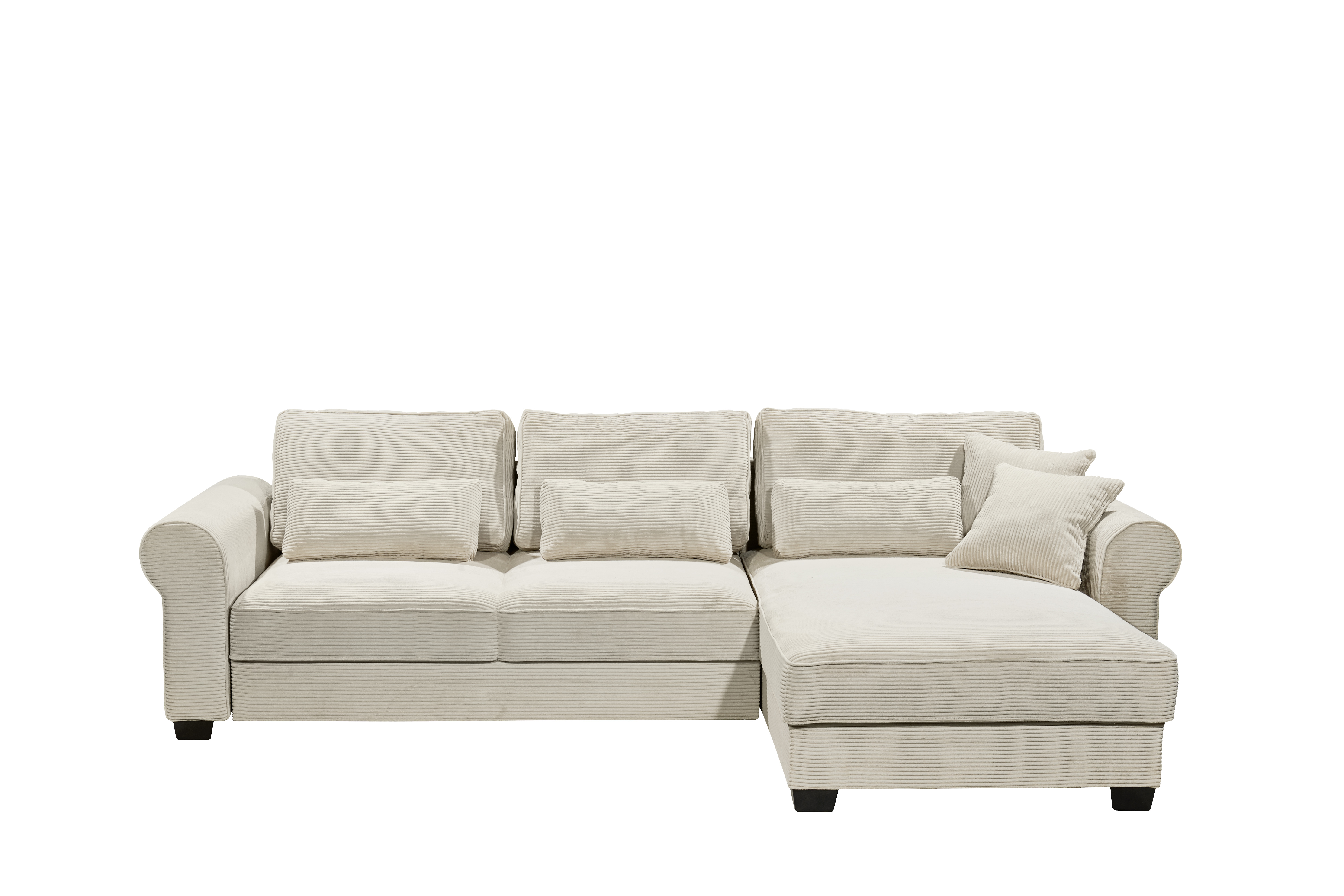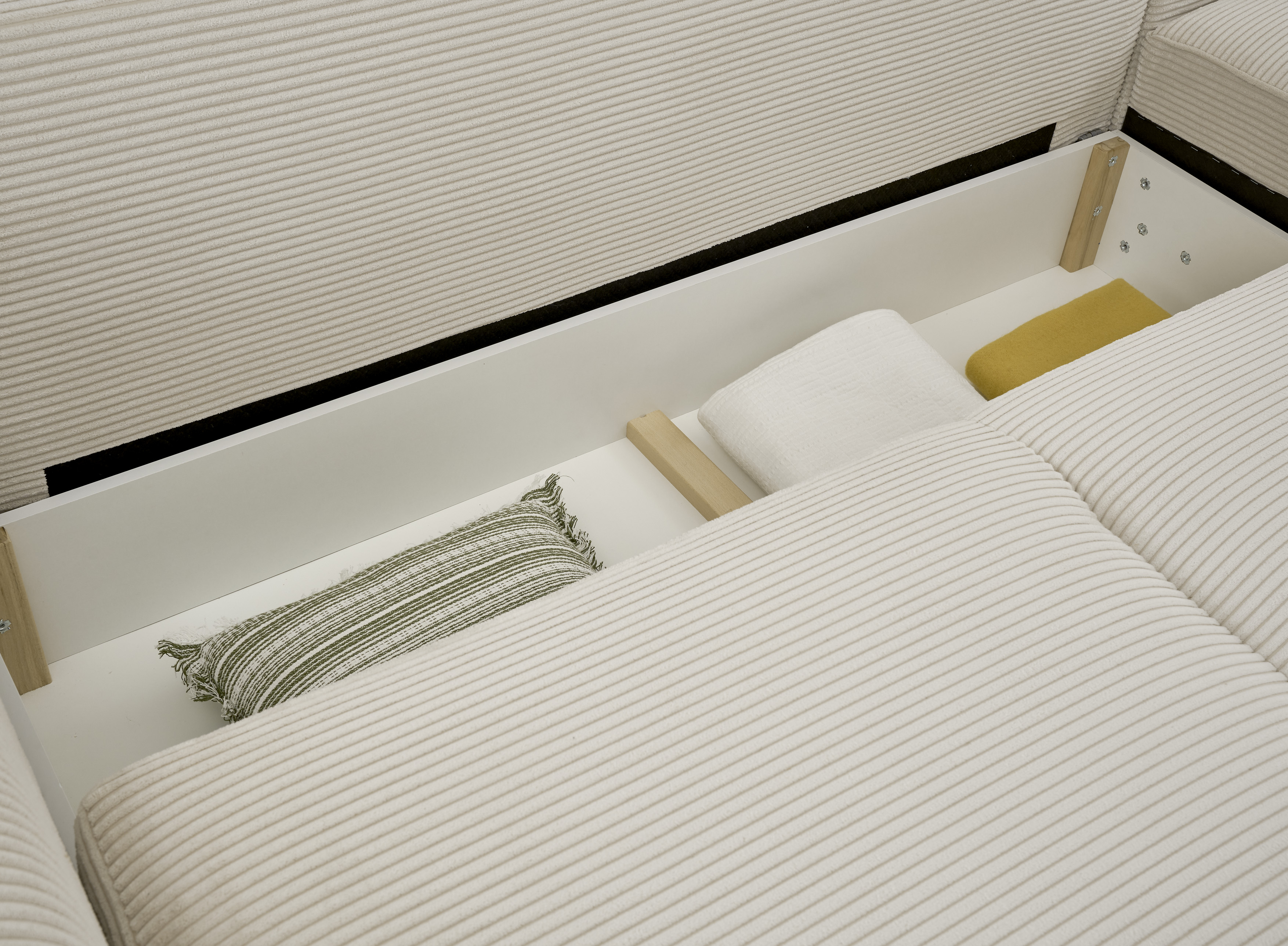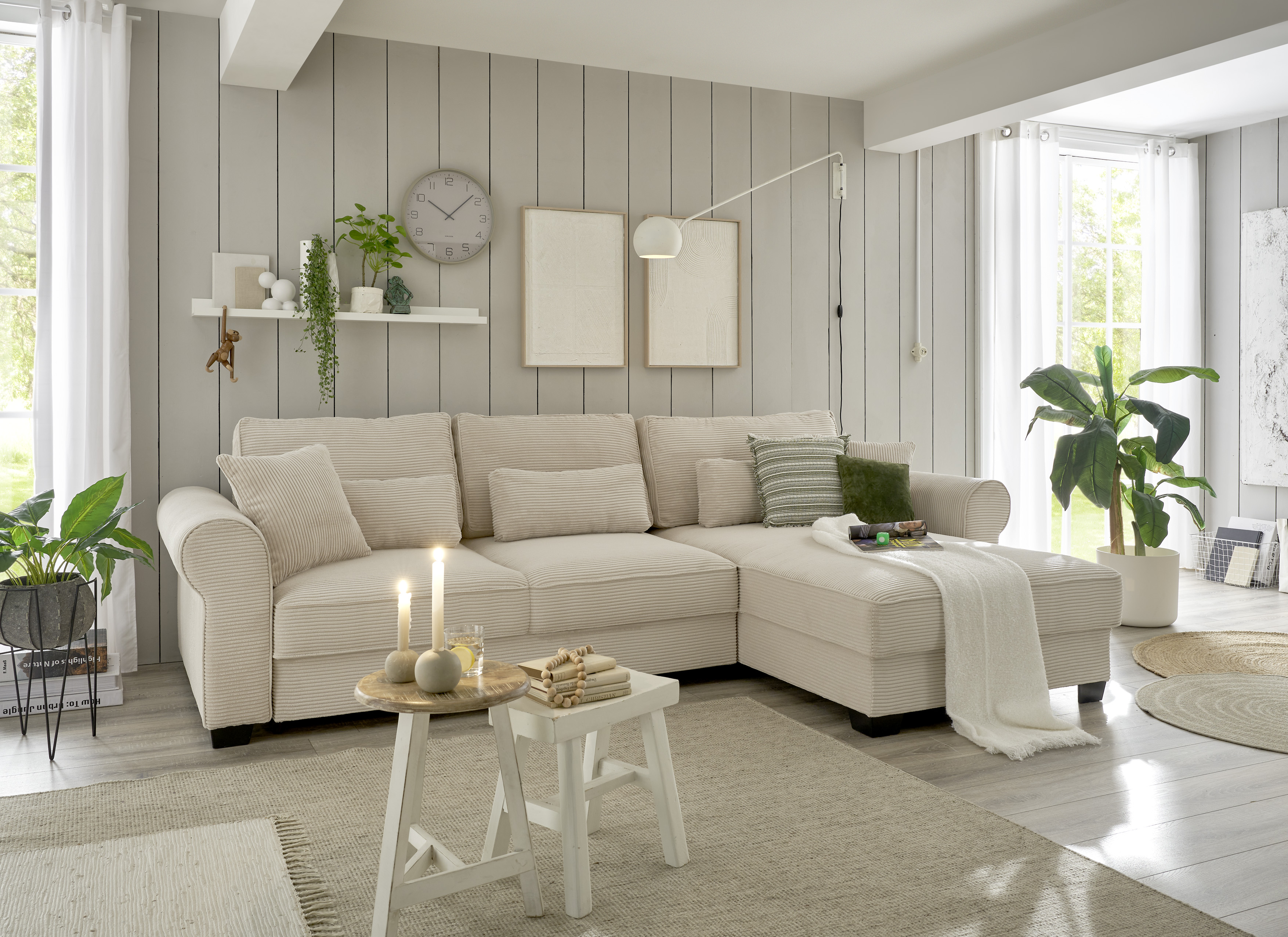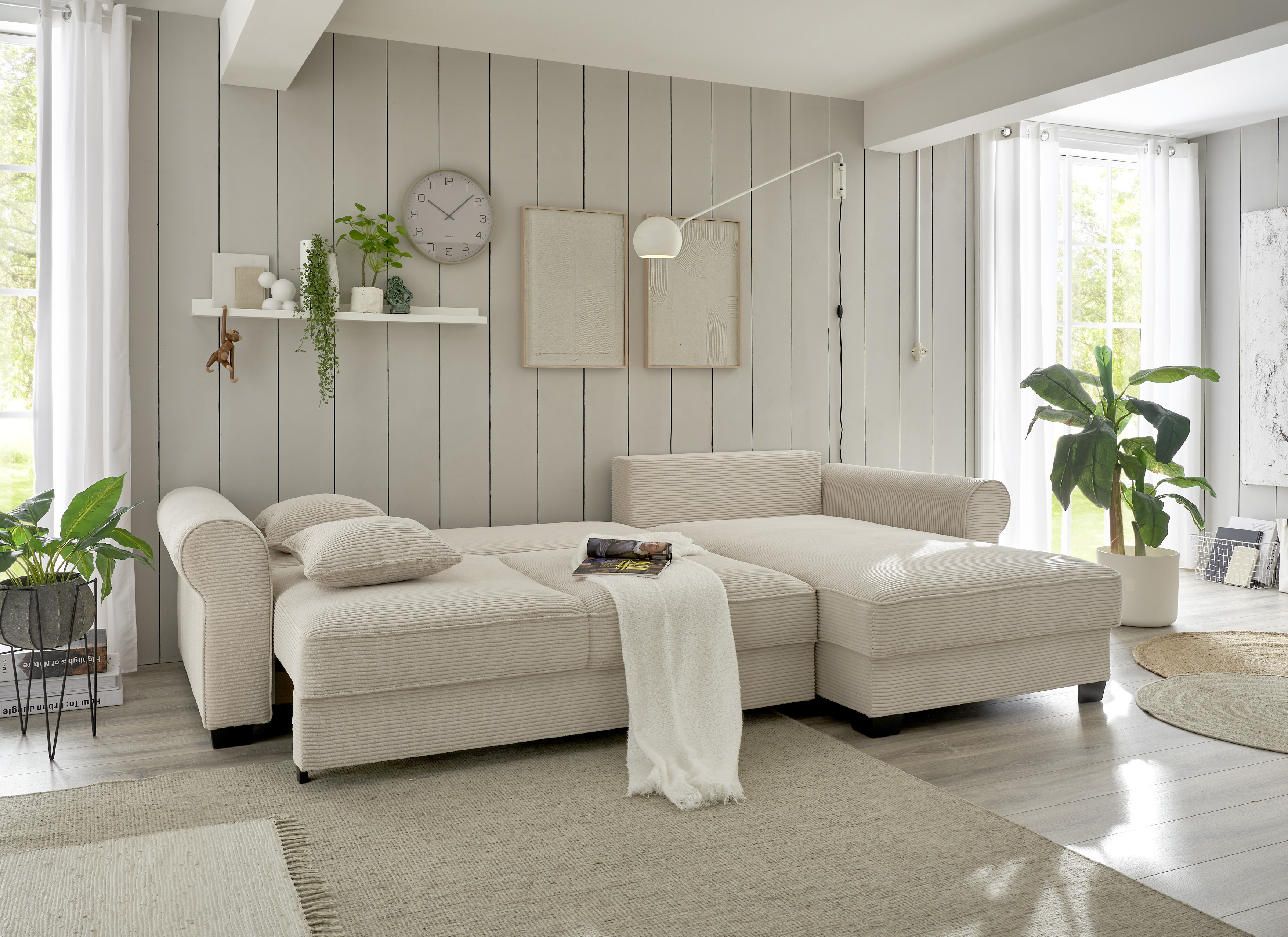 | Ausstattung Polster: | Ottomane rechts links wählbar, Rücken echt, inkl. Bettkasten, inkl. Kissen | ||