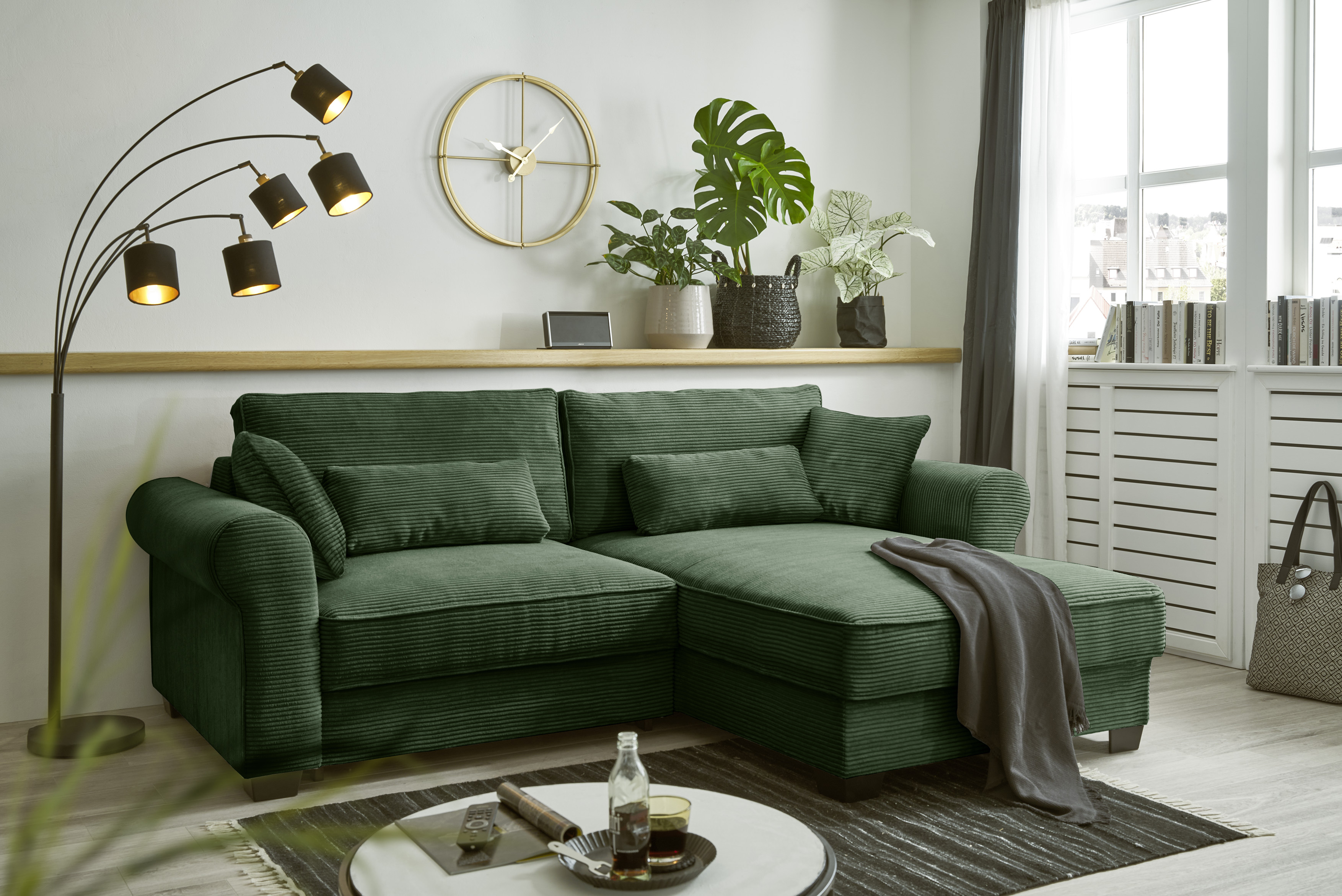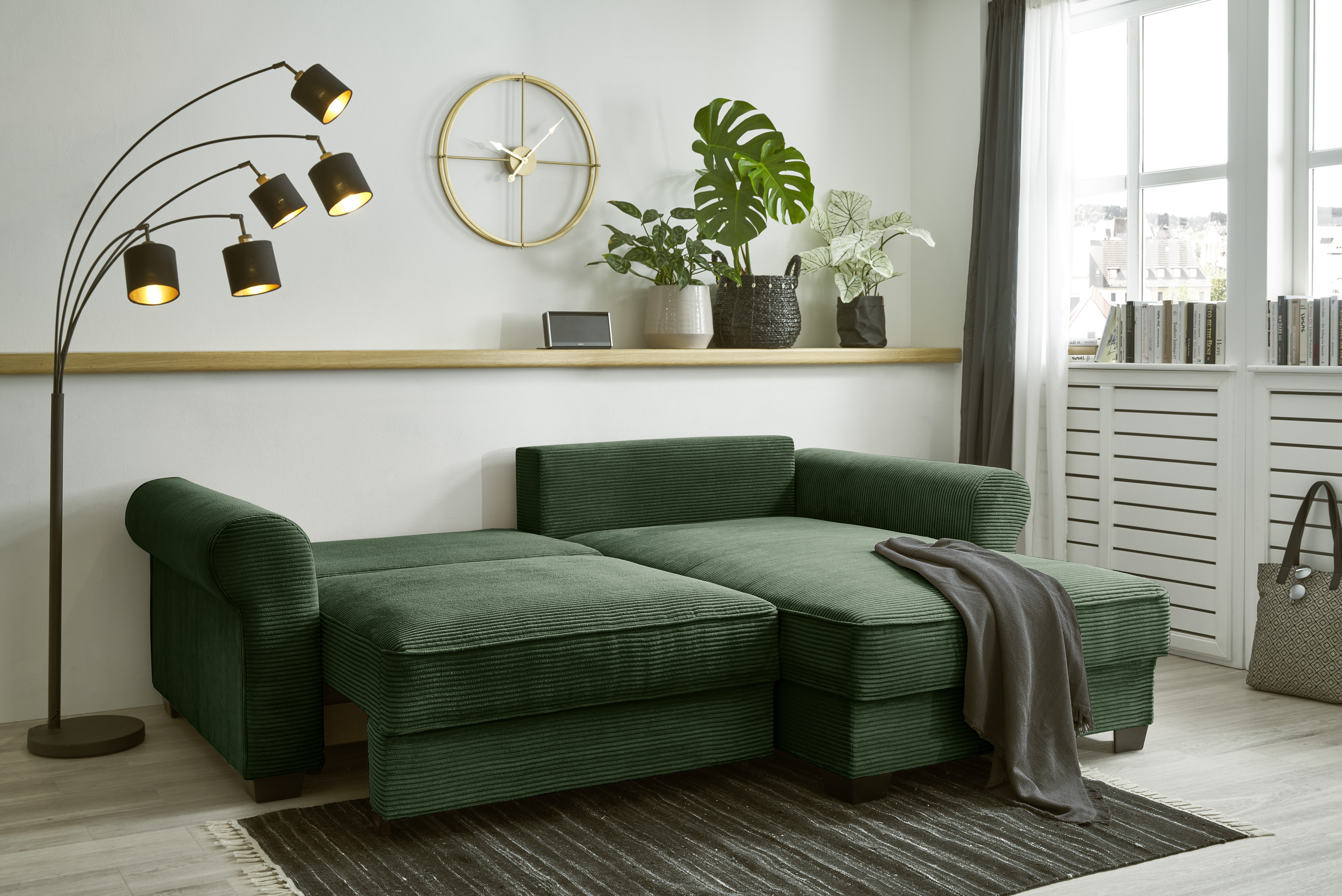 | Ausstattung Polster: | Ottomane rechts links wählbar, Rücken echt, inkl. Bettkasten, inkl. Kissen | ||