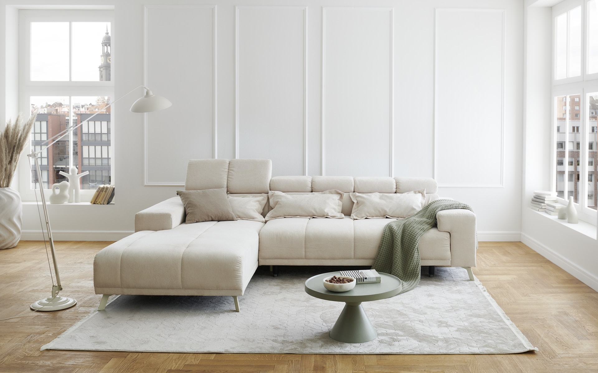 | Ausstattung Polster: | Ottomane links, Sitzvorzug motorisch, inkl. Kissen | ||
