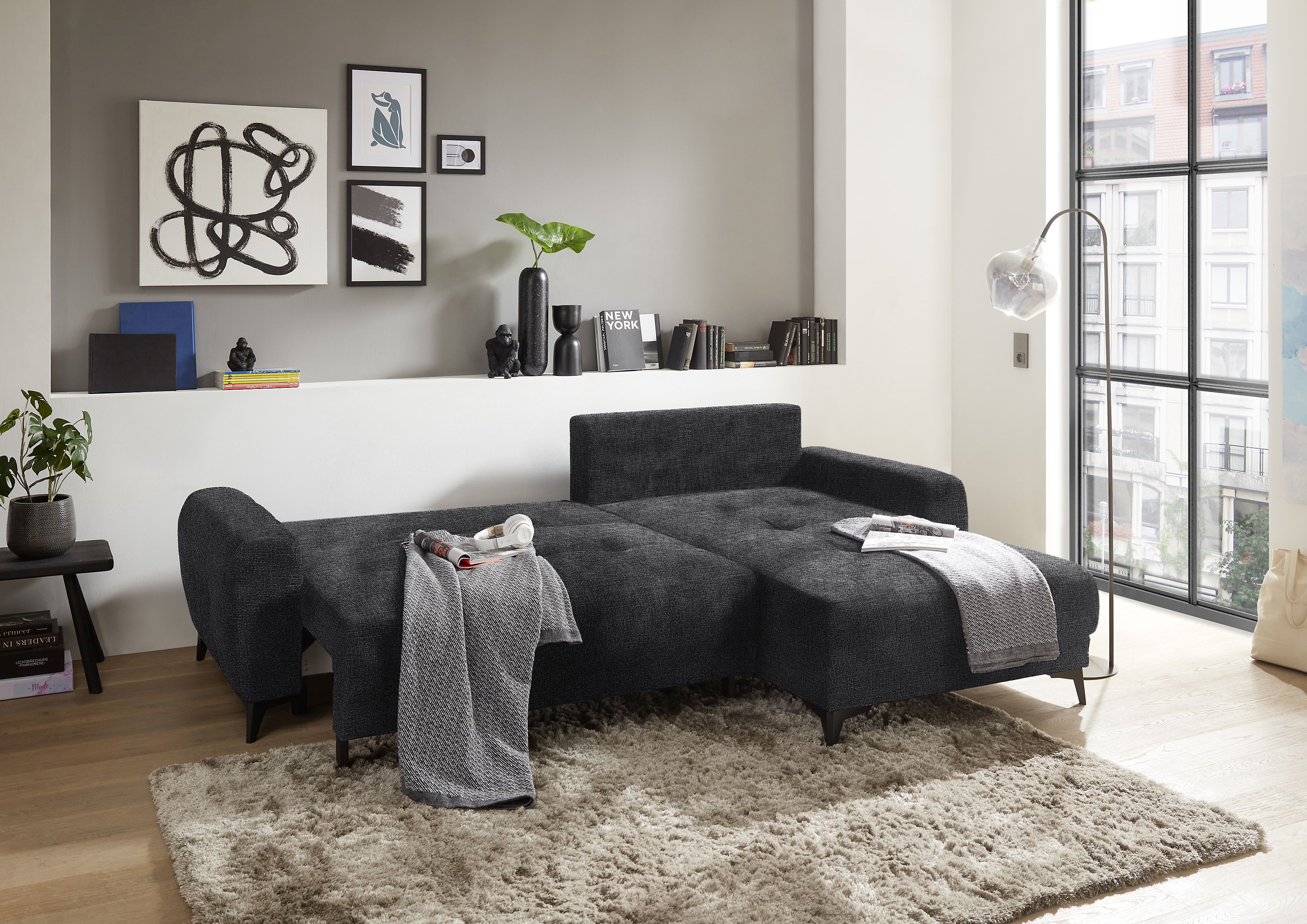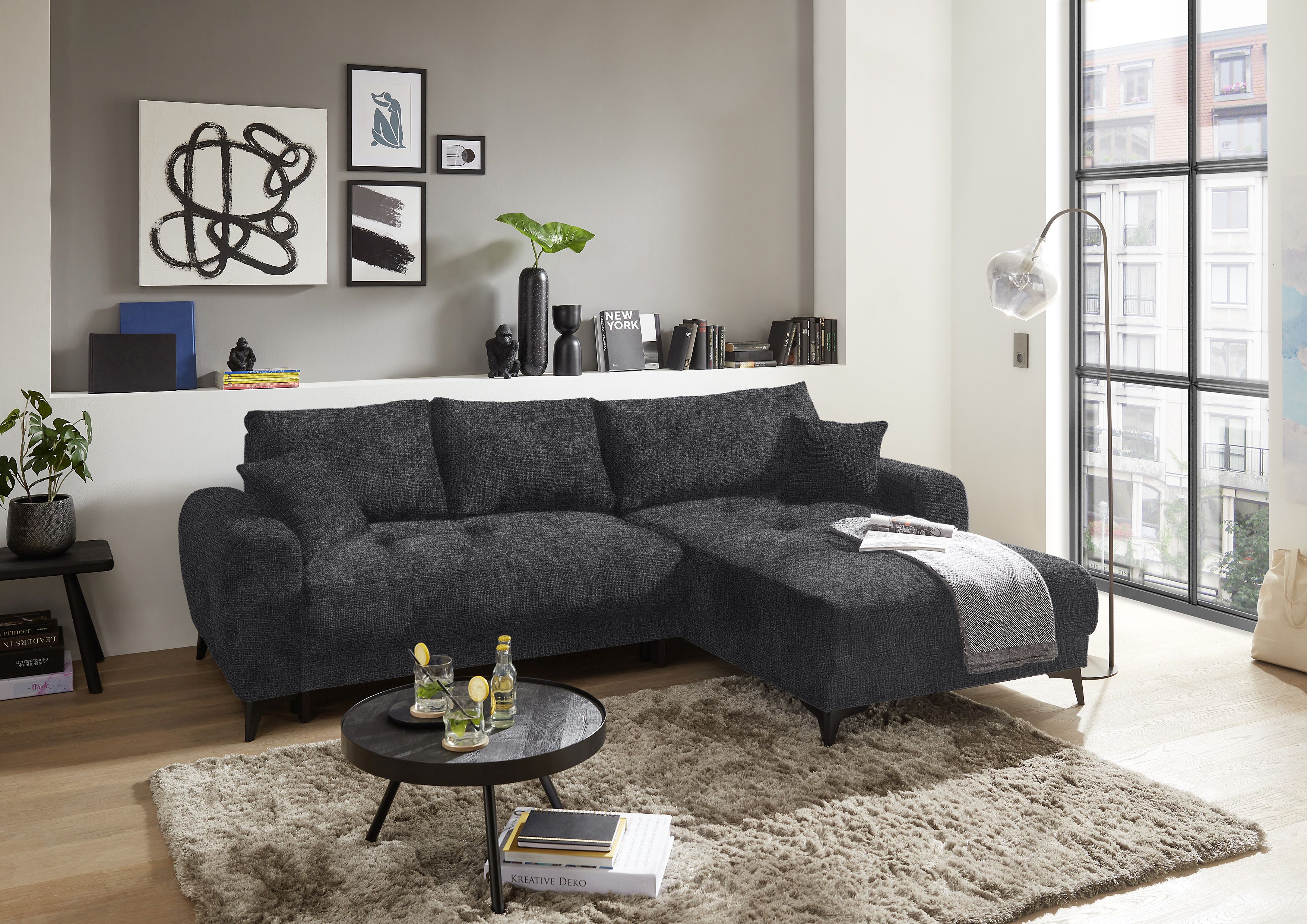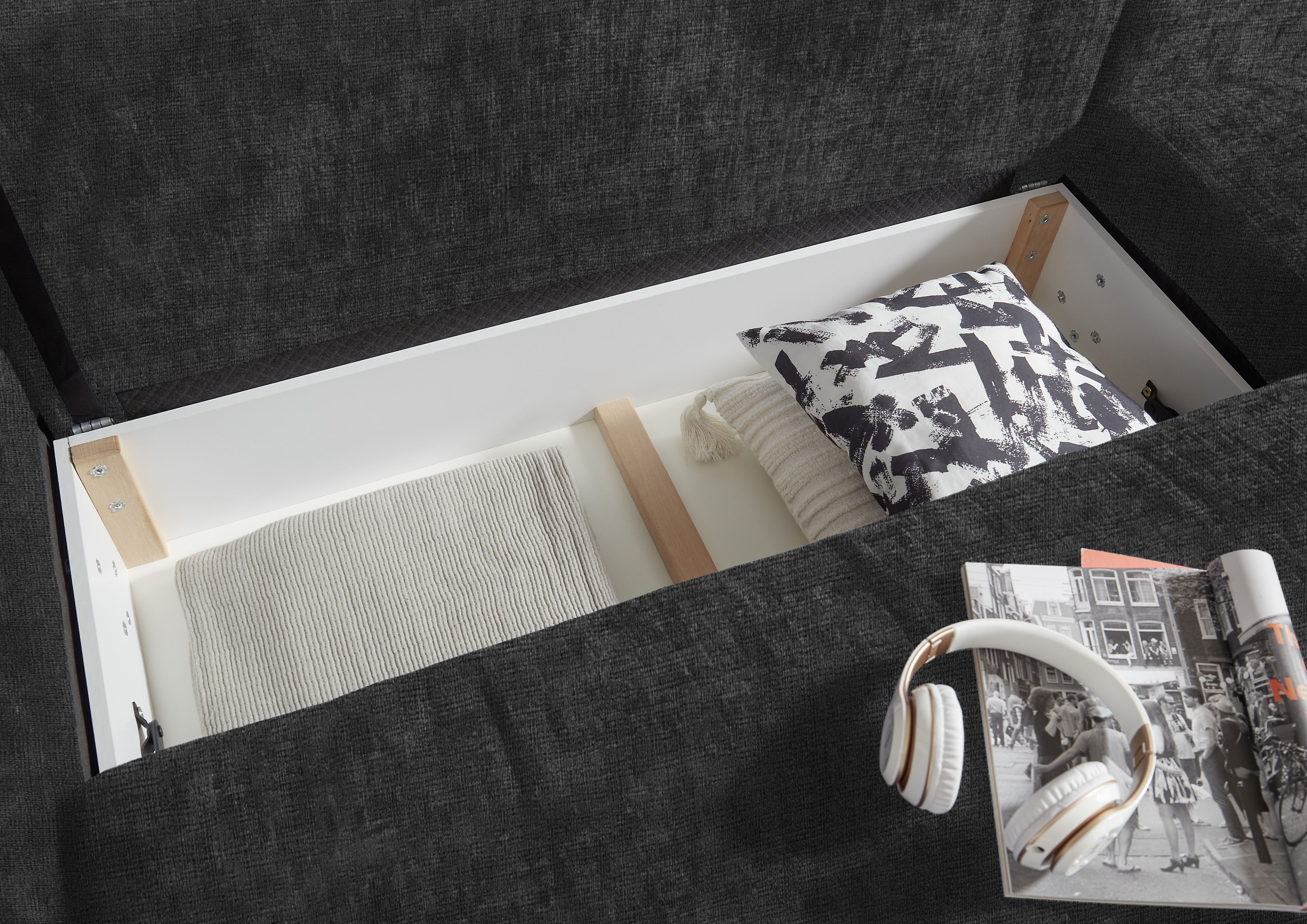 | Ausstattung Polster: | Ottomane rechts, Rücken echt, inkl. Bettkasten, inkl. Kissen | ||