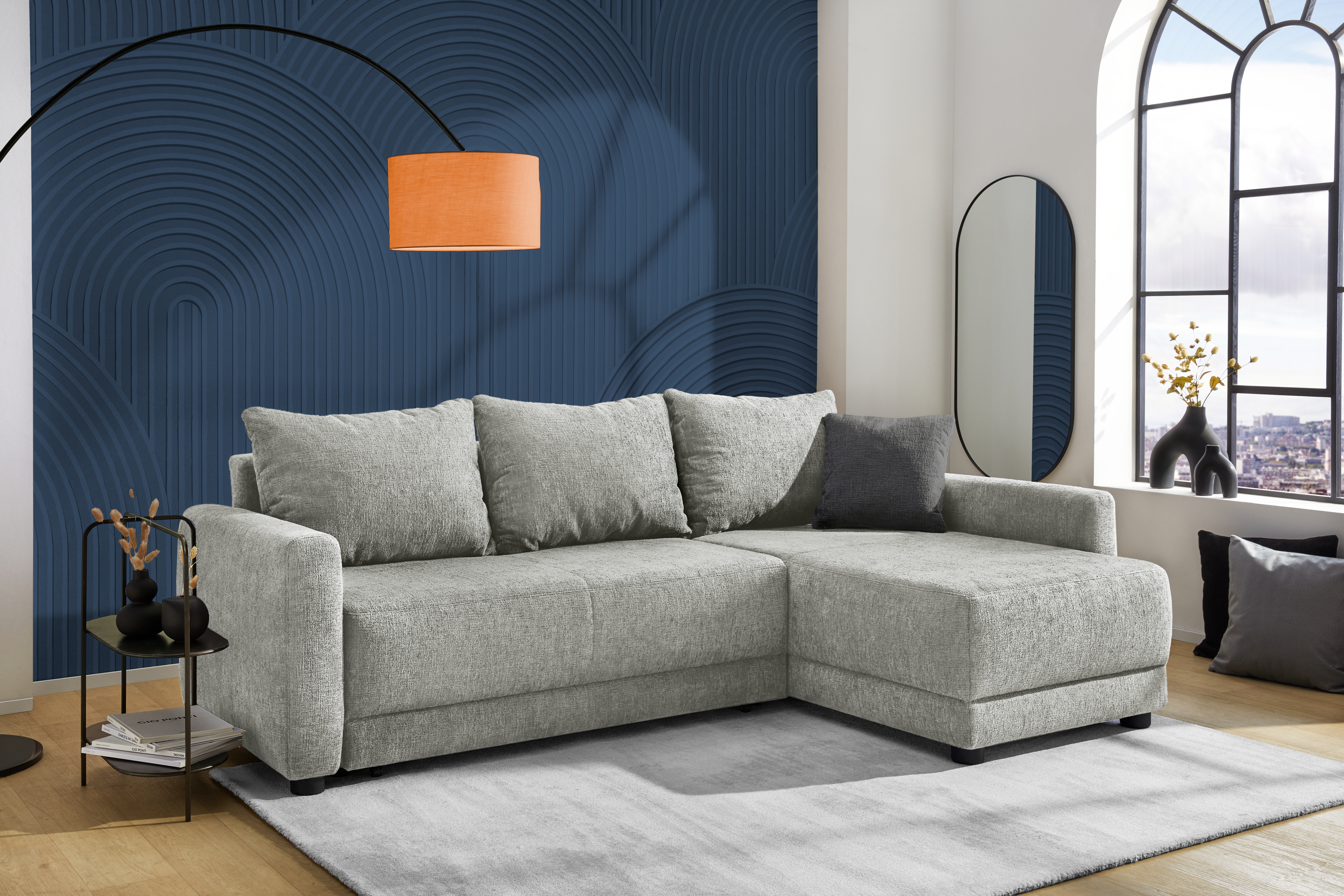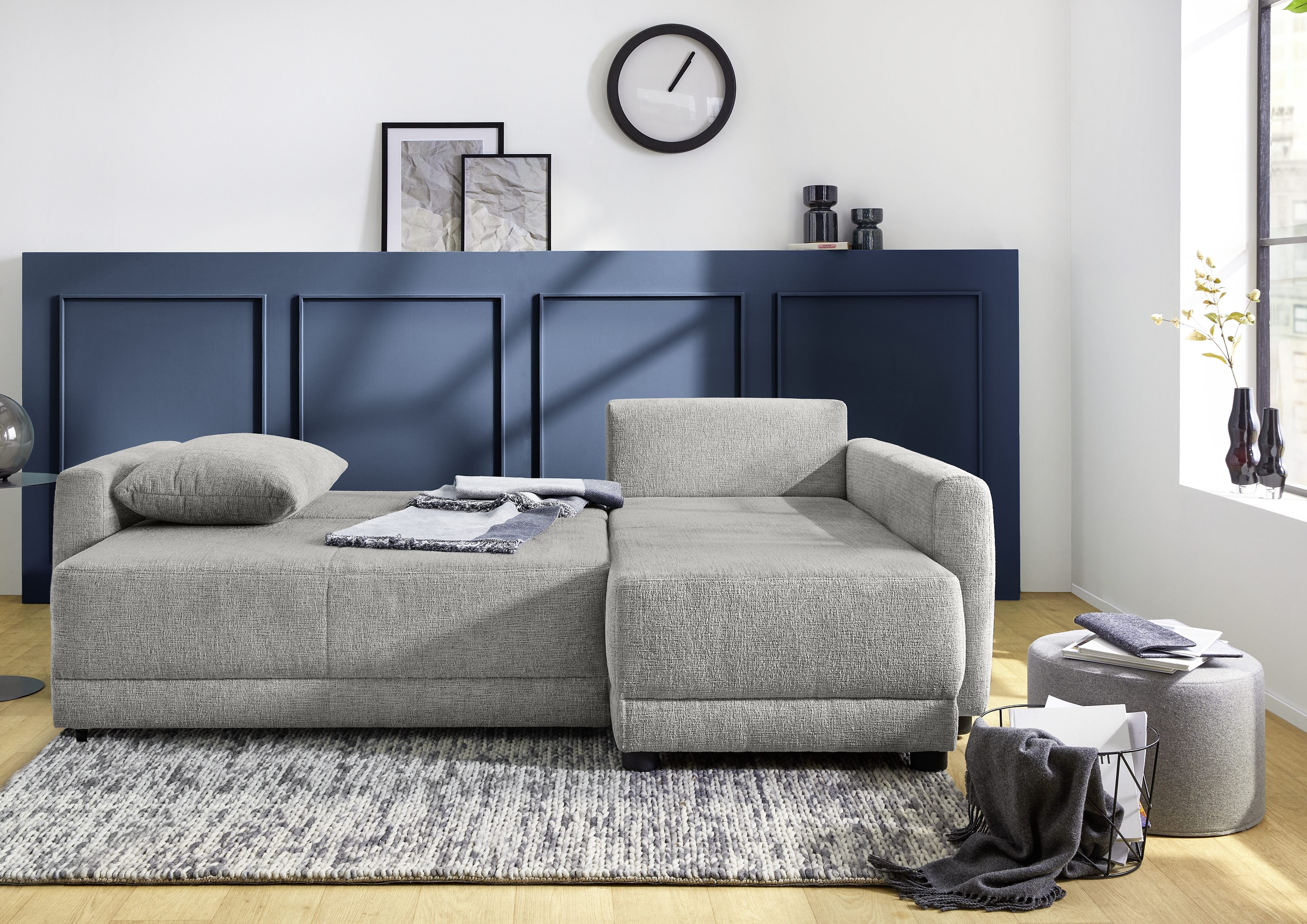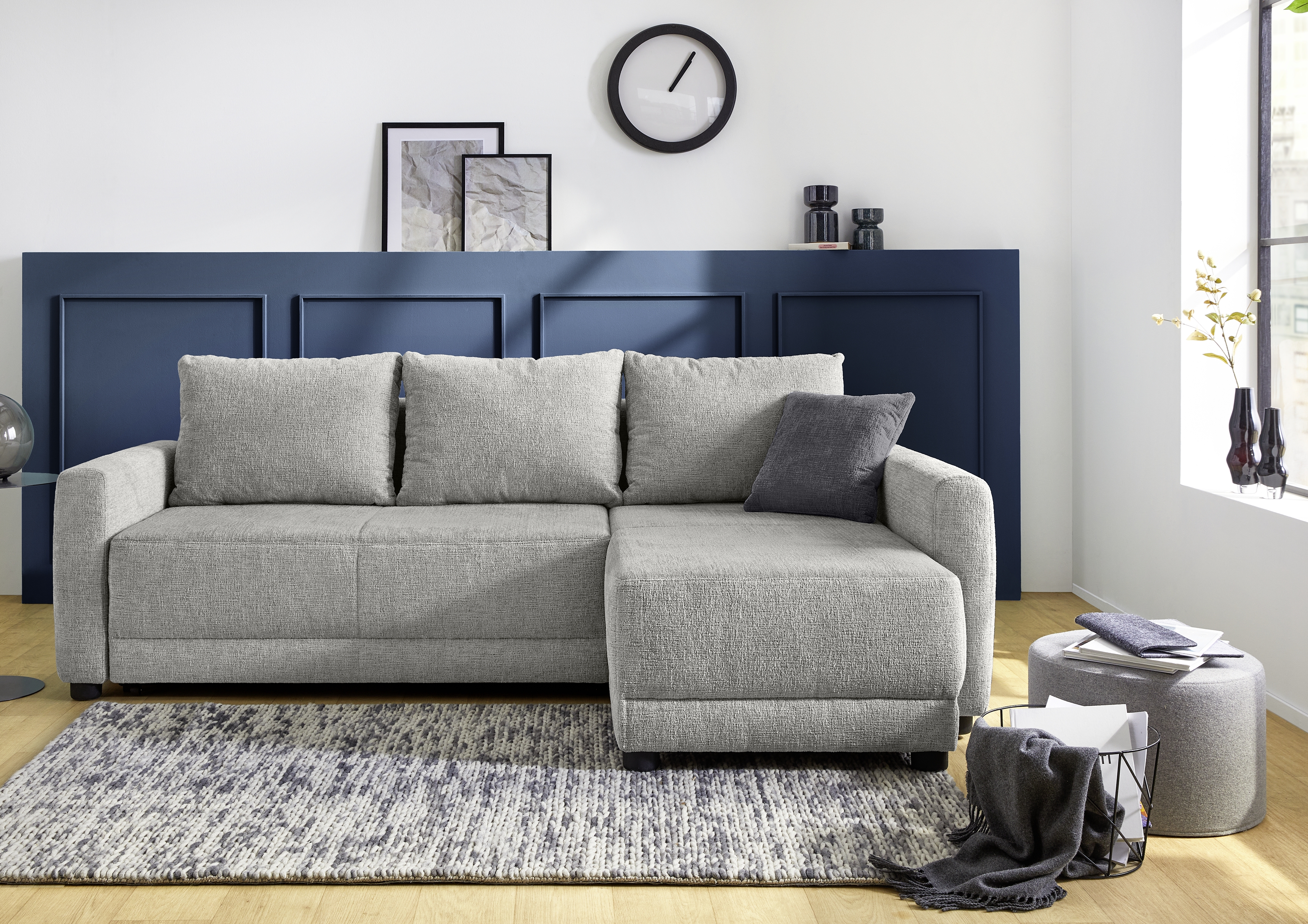 Dieses kompakte Ecksofa begeistert mit seiner schnuckeligen Formensprache und bringt gemütliche Wohnlichkeit auch in kleinere Räume. Neben einer komfortablen Schlaffunktion steht ein geräumiger Bettkasten zum Verstauen von Decken und Kissen zur Verfügung. Die Schaumpolsterung sorgt zudem für einen guten Sitz- und Liegekomfort. 3 großzügige Rückenkissen und ein Zierkissen sorgen für komfortables Sitzen und setzen zugleich stilvolle Akzente. Besonders praktisch: Die Ottomane kann links oder rechts montiert werden und passt sich somit ideal an jede Wohnsituation an. Durch den mit Echtstoff bezogenen Rücken, kann die Wohnlandschaft auch „frei im Raum“ gestellt werden.