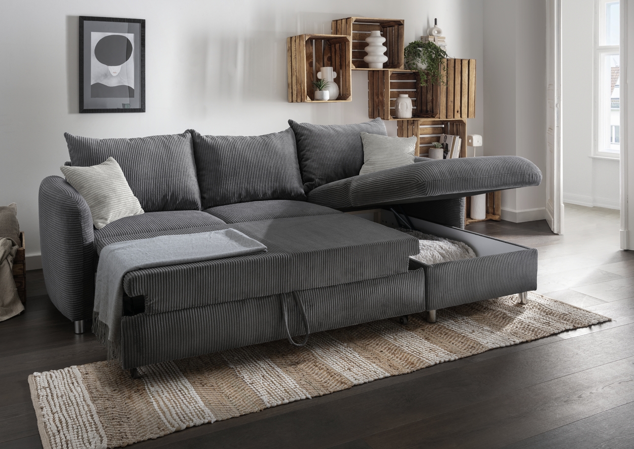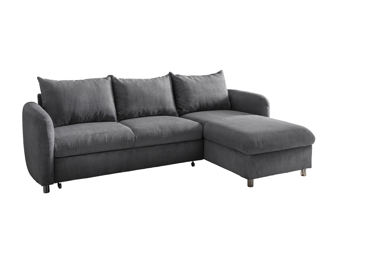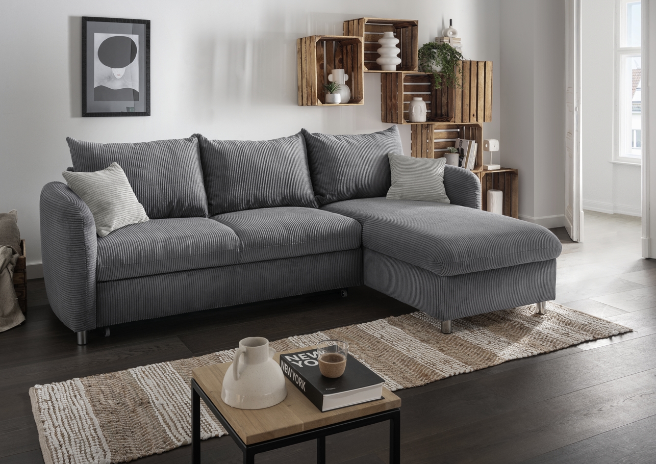 Bezug: Polsterecke in einem grauen Cordstoff 4801 aus 100% Polyester; Zierkissen in einem silberfarbenem Cordstoff 4802 aus 100% Polyester