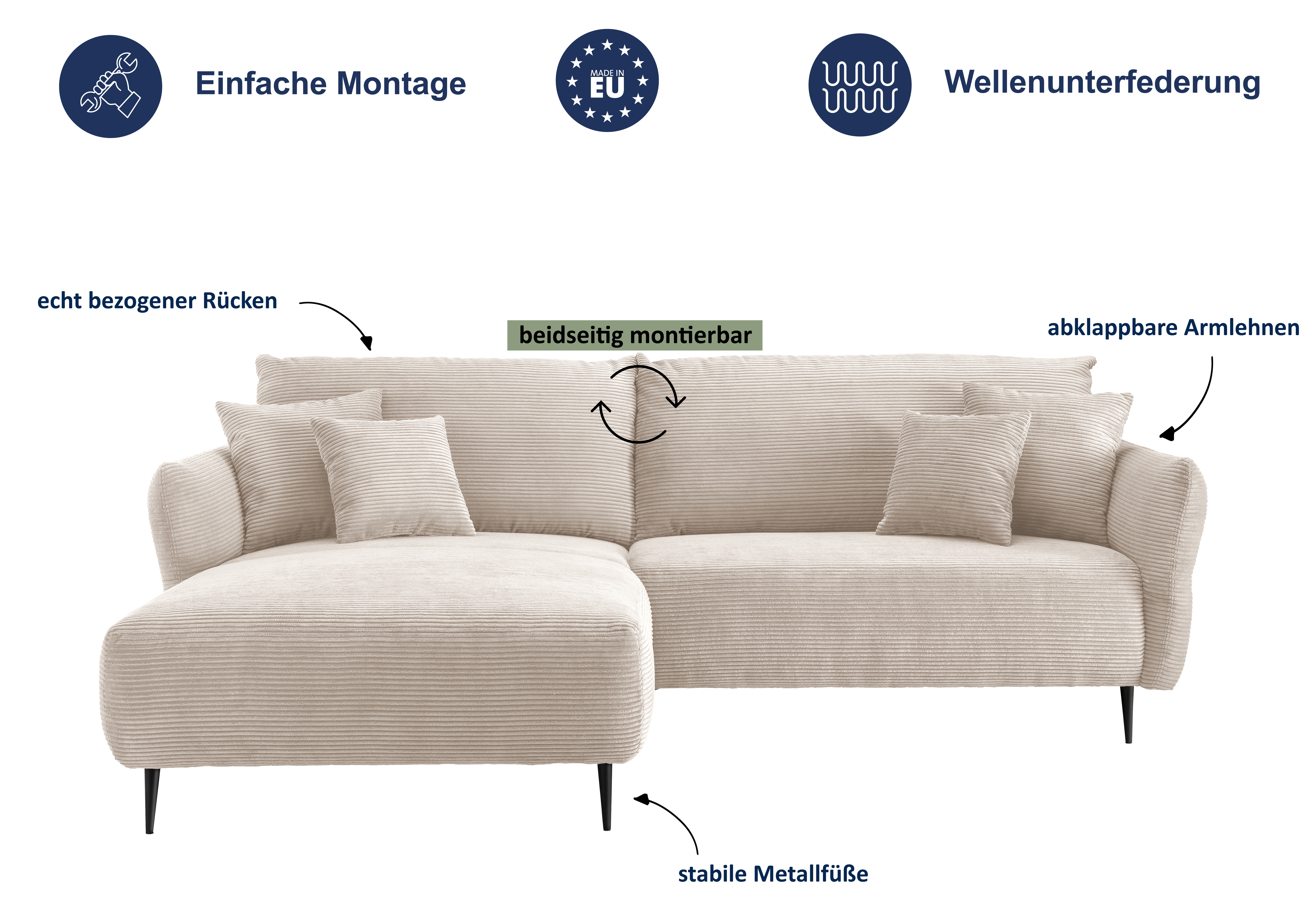Ausstattung Polster: | Ottomane rechts links wählbar, inkl. Kissen |