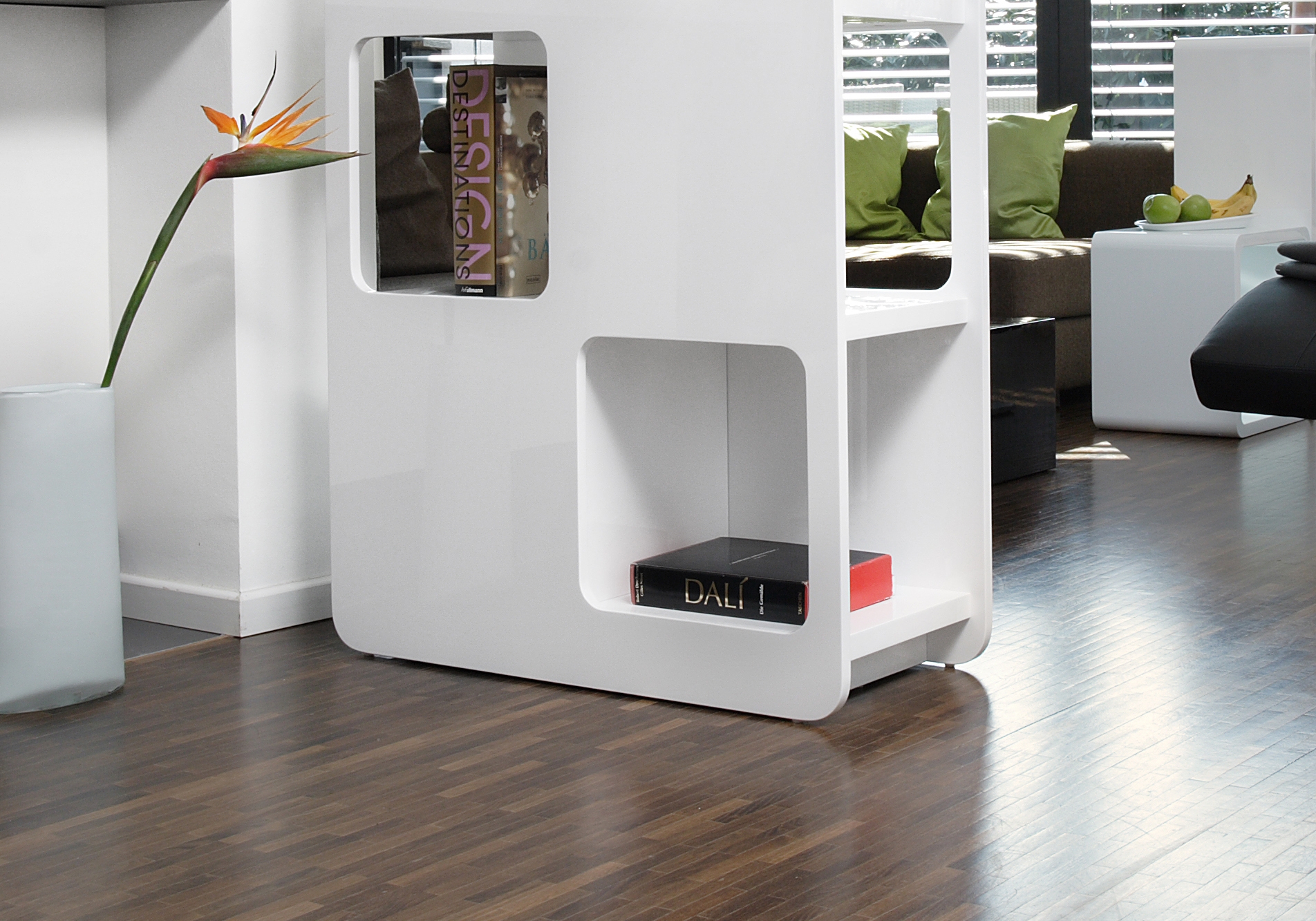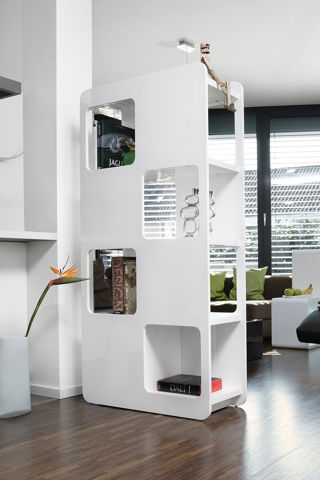 Die platzsparende Lösung für viel Stauraum. Der Raumteiler wurde aus MDF gefertigt und mit einer Hochglanz weißen Schicht lackiert. Das Regal verfügt über 4 Regalböden, welche großzügigen Stauraum bieten. Sei es für Bücher, Akten oder Deko. Es können auch kleine Aufbewahrungskörbchen auf die Regalbretter gestellt werden, so sind die verstauten Dinge nicht sofort für jedermann sichtbar. Das Regal kann frei im Raum aufgestellt oder an eine Wand gestellt werden. Dank des modischen Designs passt dieser Raumtrenner in nahezu jedes Interior und findet im Wohn- oder Kinderzimmer, im Flur, im Büro oder im Schlafbereich seinen Platz. Das Standregal sieht nicht nur sehr schick aus, es erfüllt auch seinen Zweck.