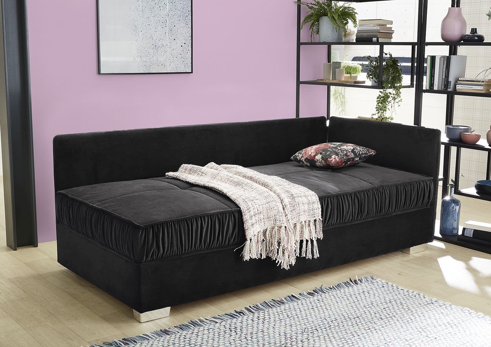 Bezug: Korpus und Rückenkissen in einem samtähnlichem Stoff in der Farbe schwarz aus 100% Polyester; Zierkissen in einem floral gemustertem Druckstoff aus 100% Baumwolle