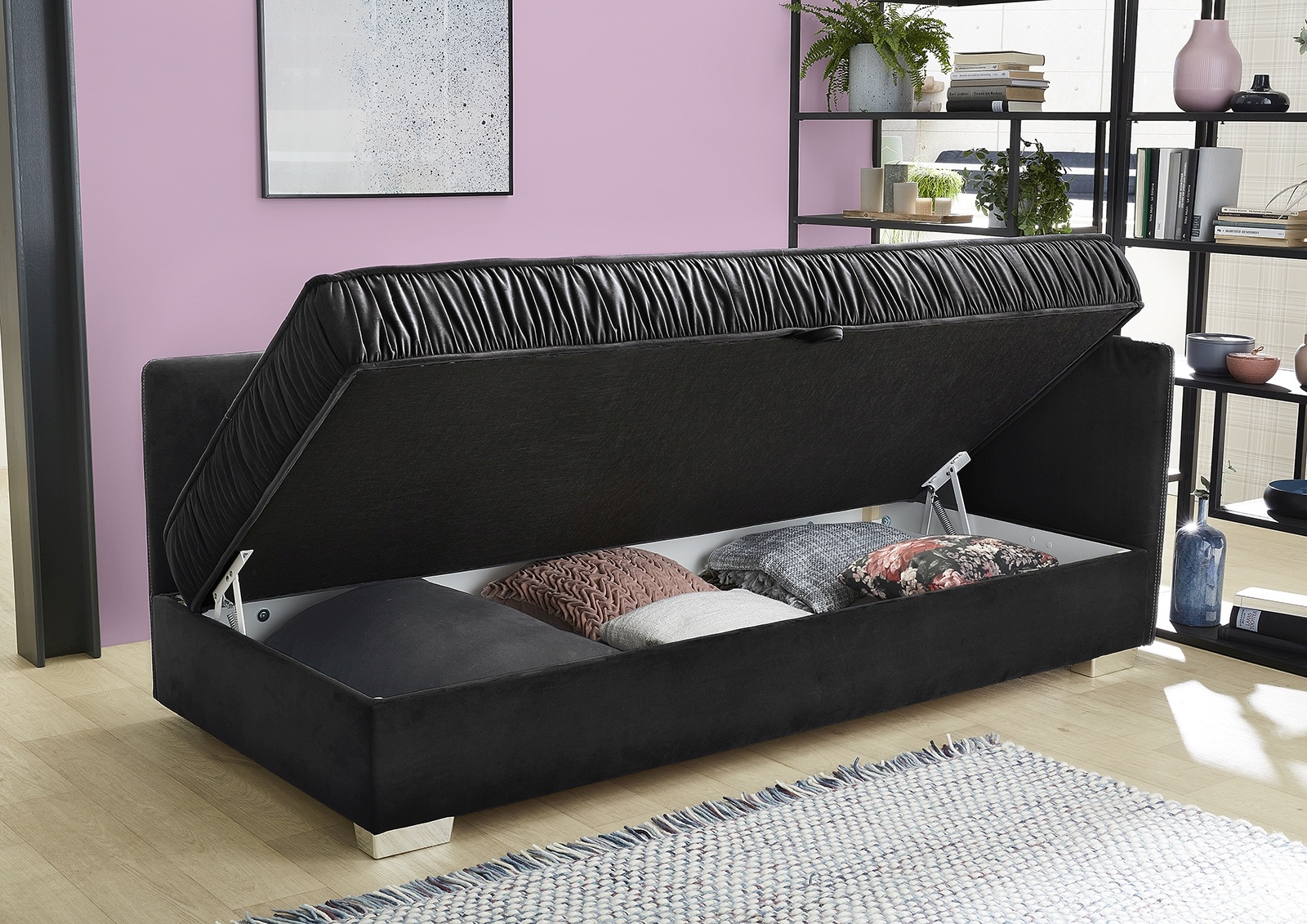 1 integrierter Bettkasten ist mit Hilfe des Springaufbeschlages mit Zugfeder leicht zu öffnen
