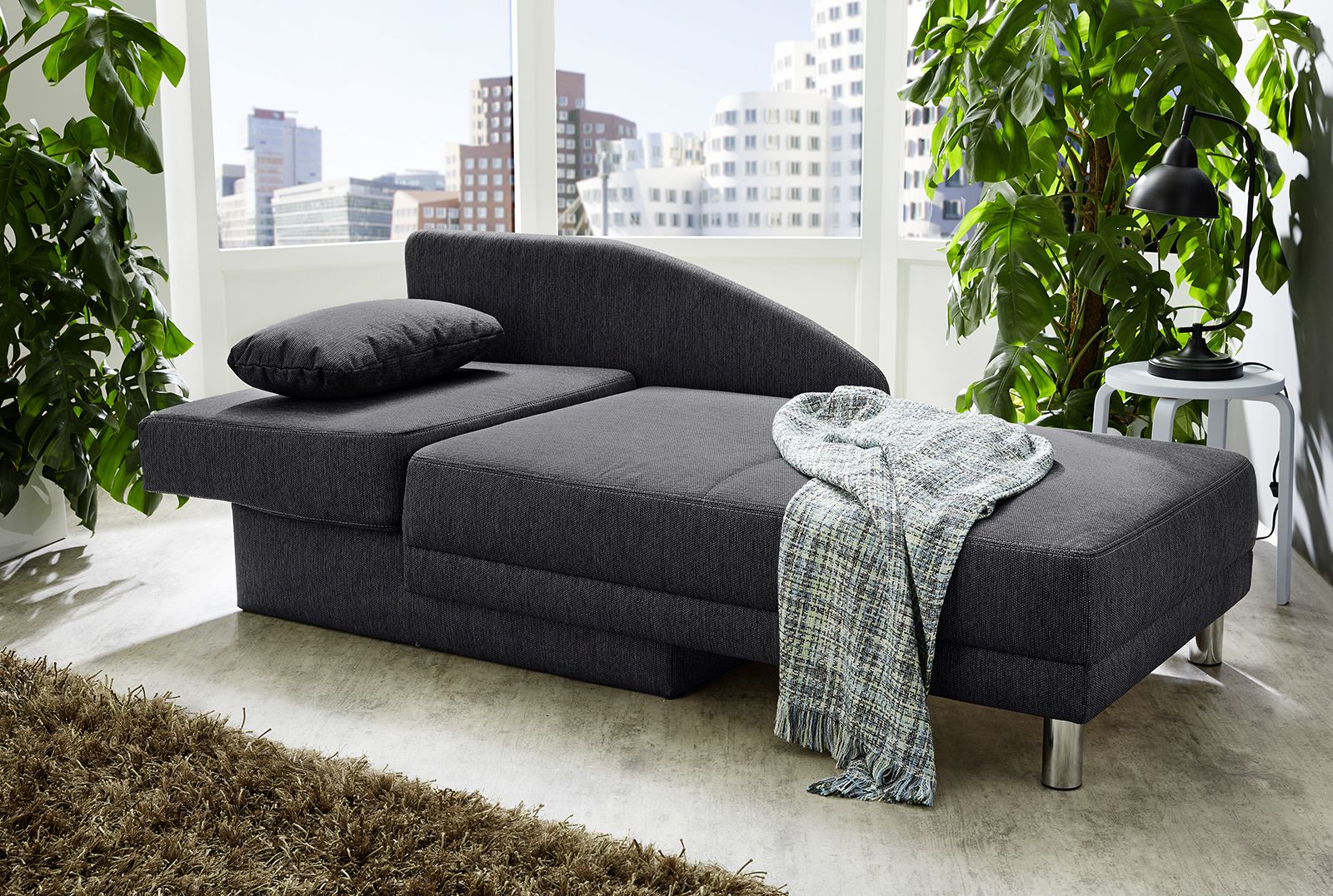 Bezug: Korpus, Sitz und Nierenkissen in einem anthrazitfarbenen Flachgewebe aus 57,7% Polypropylen und 42,3% Polyester; großes Kissen in einem anthrazitfarbenen, gemusterten Flachgewebe aus 57,7% Polypropylen und 42,3% Polyester