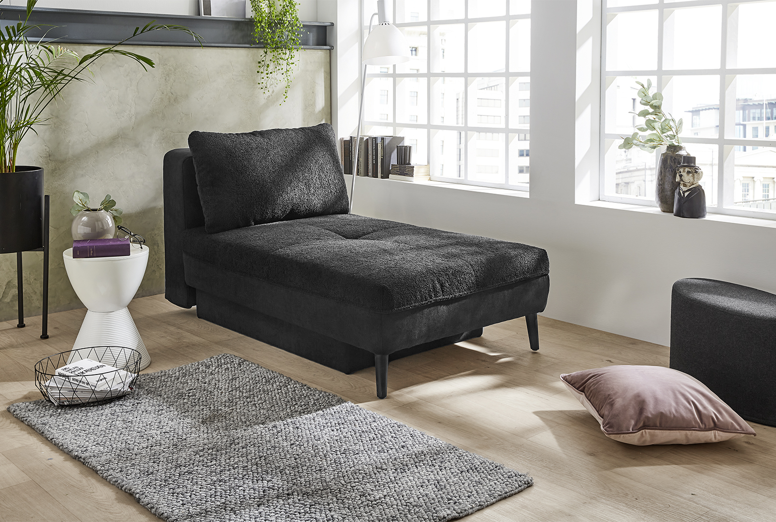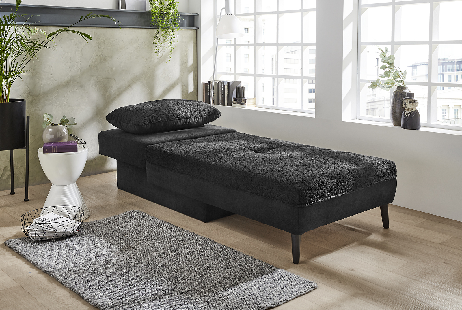 Bezug: Korpus in einer schwarzen Microfaser aus 100% Polyester; Kissen und Liegefläche in einem schwarzen Stoff in Teddyoptik aus 100% Polyester