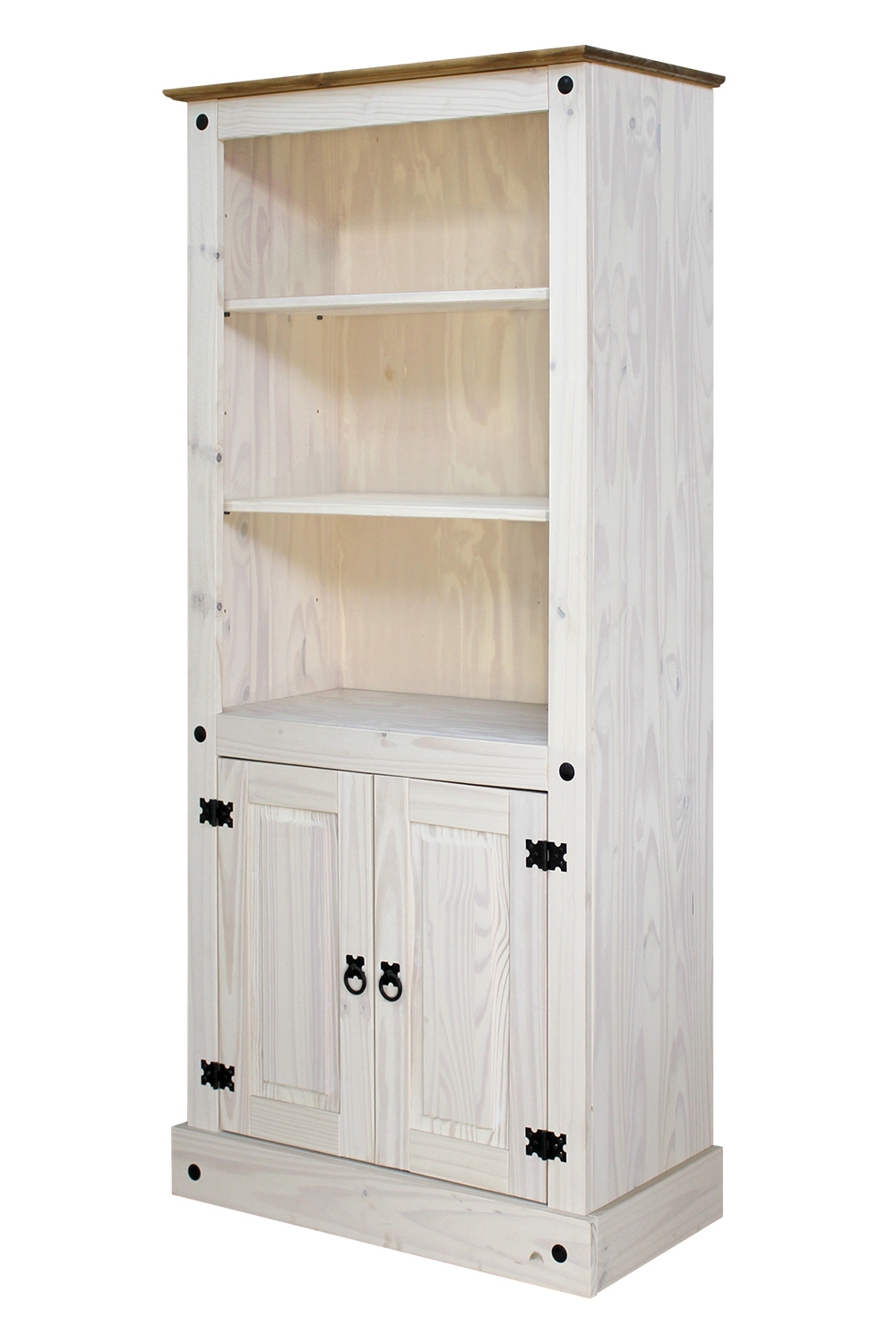 Jetzt kommt Ordnung ins Chaos. Das gradlinige Bücherregal aus massivem Kiefernholz bietet hinter 2 Türen mit durchgehendem Boden und 3 offenen Fächern viel Platz für Ihre Lieblingsbücher und sonstige Accessoires. Das weiß lackierte Möbel setzt durch die Metallapplikationen und die honigfarbene Deckplatte gekonnt Akzente. Dieses Bücherregal macht sowohl im Wohnzimmer, bestückt mit Ihren Lieblingsbüchern und Dekoartikeln, als auch im Büro als Allround-Regal eine gute Figur. Dieses zeitlose, stabile Möbelstück können Sie nahezu in alle Wohnräume integrieren, da es ein besonderer Blickfang ist.