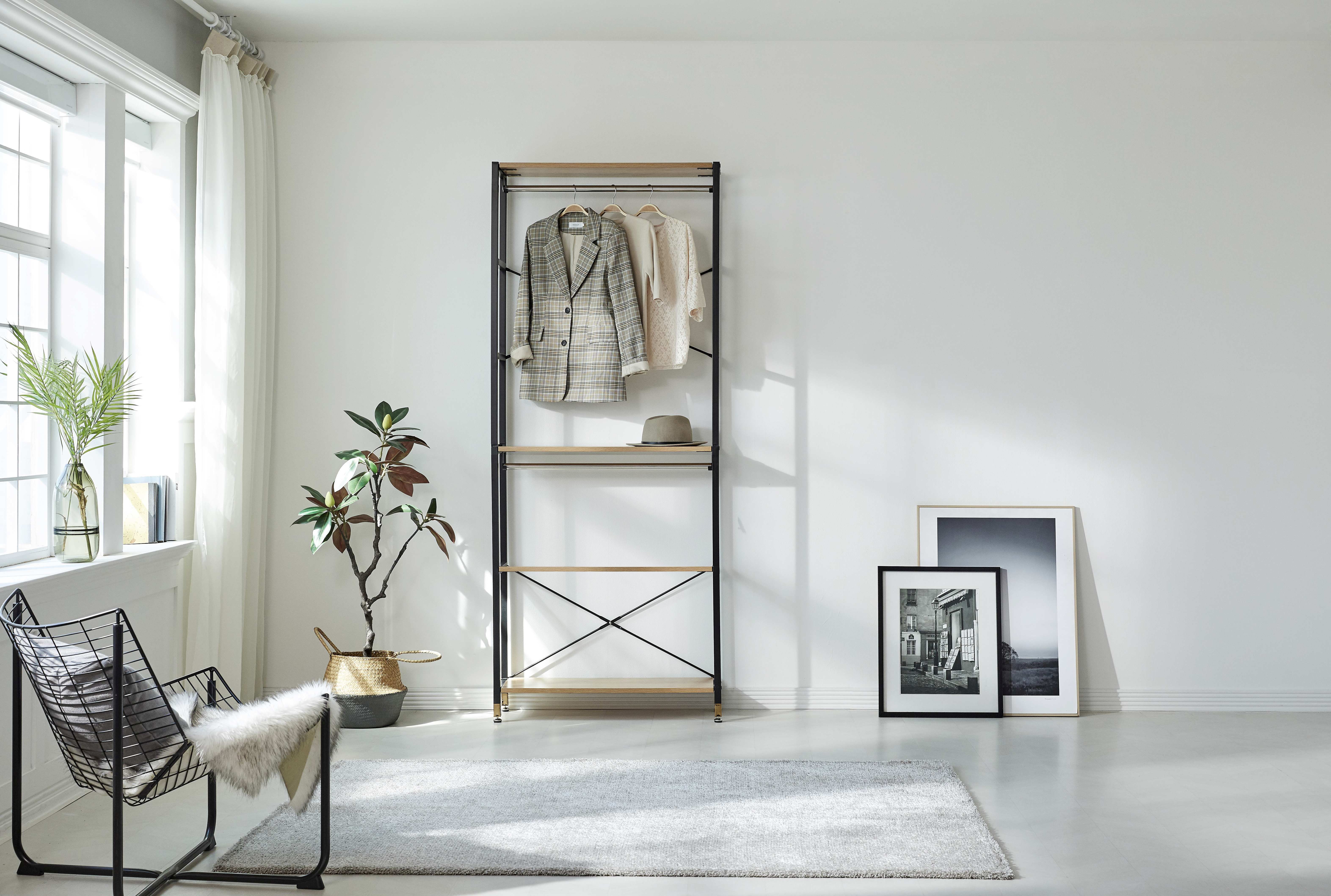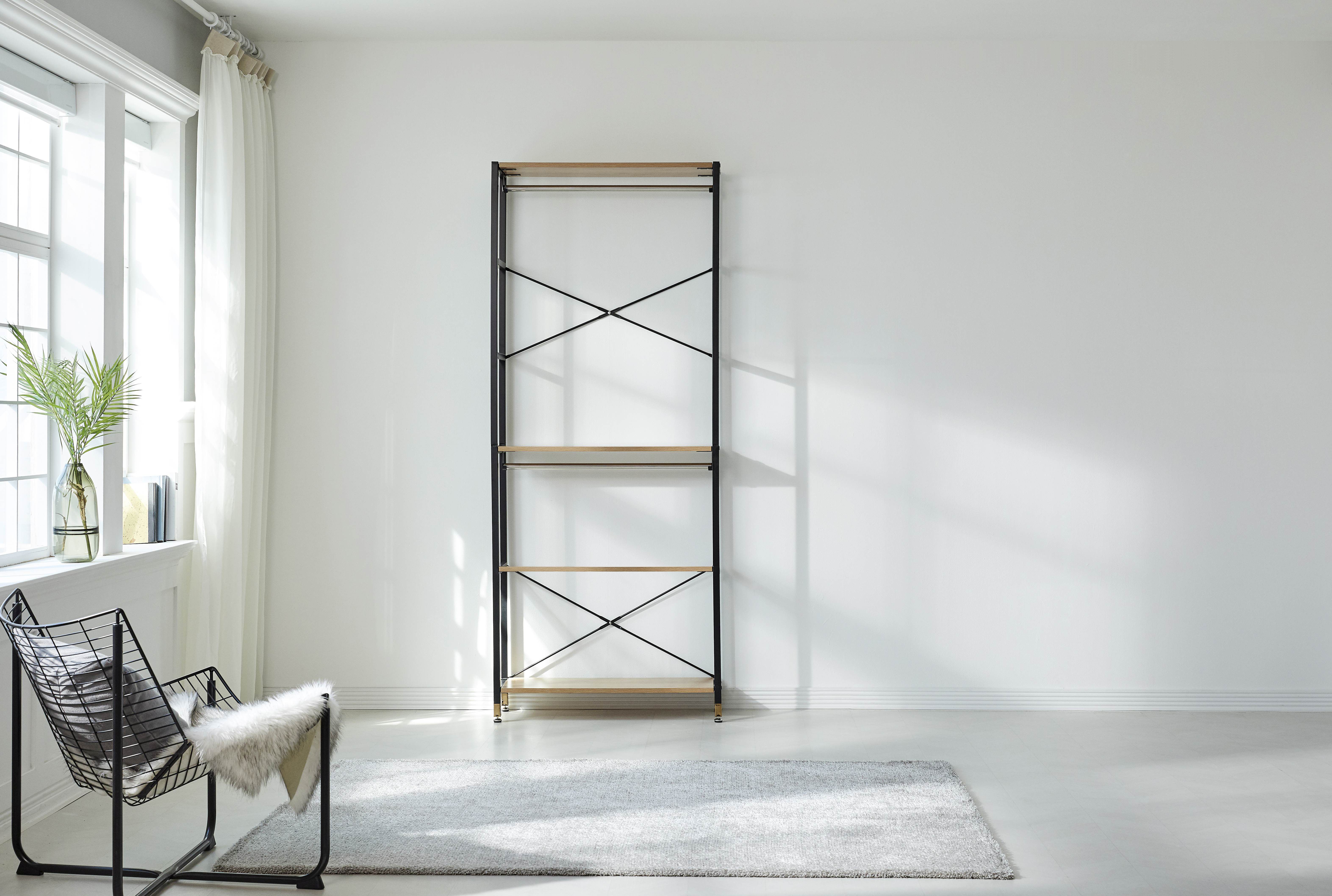Jetzt kommt Ordnung ins Chaos. Mit diesem Regal schaffen Sie zusätzlichen Stauraum und Platzmangel ist künftig kein Thema mehr. Mit einer Höhe von 210 cm bietet Ihnen das Regal genügend Platz für z.B. Bücher oder Dekorationsartikel. An der Stange können Sie Ihre Kleidung aufhängen. Der Rahmen besteht aus Metall. Die vier Einlegeböden sind aus furniertem MDF in Akazie-Optik. Dank der offenen Aufteilung des Standregals kann dieses auch als Raumteiler genutzt werden. Mit seiner Breite von 85 cm ist es für fast alle Räume geeignet.