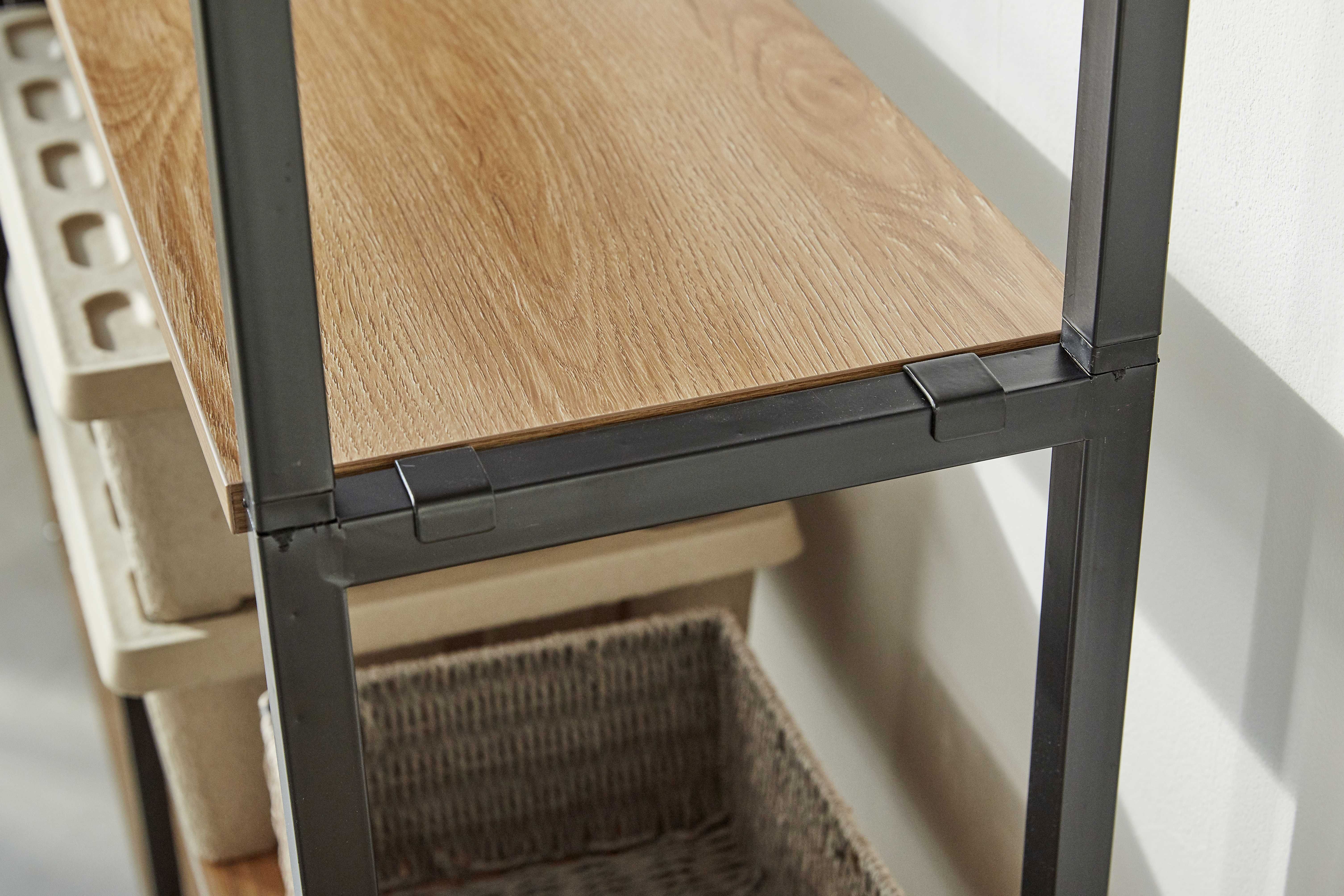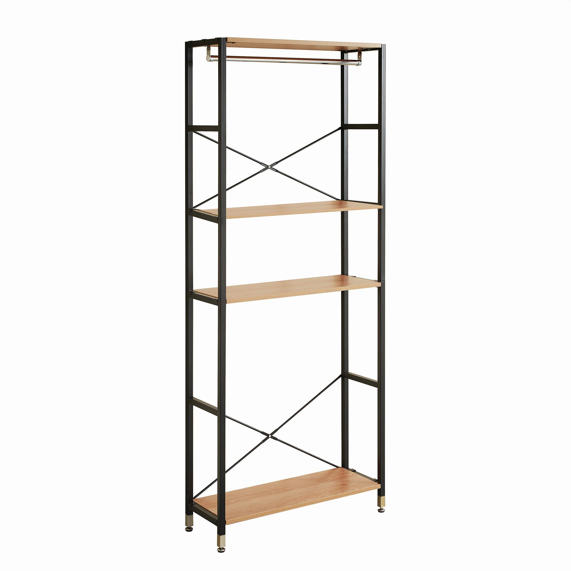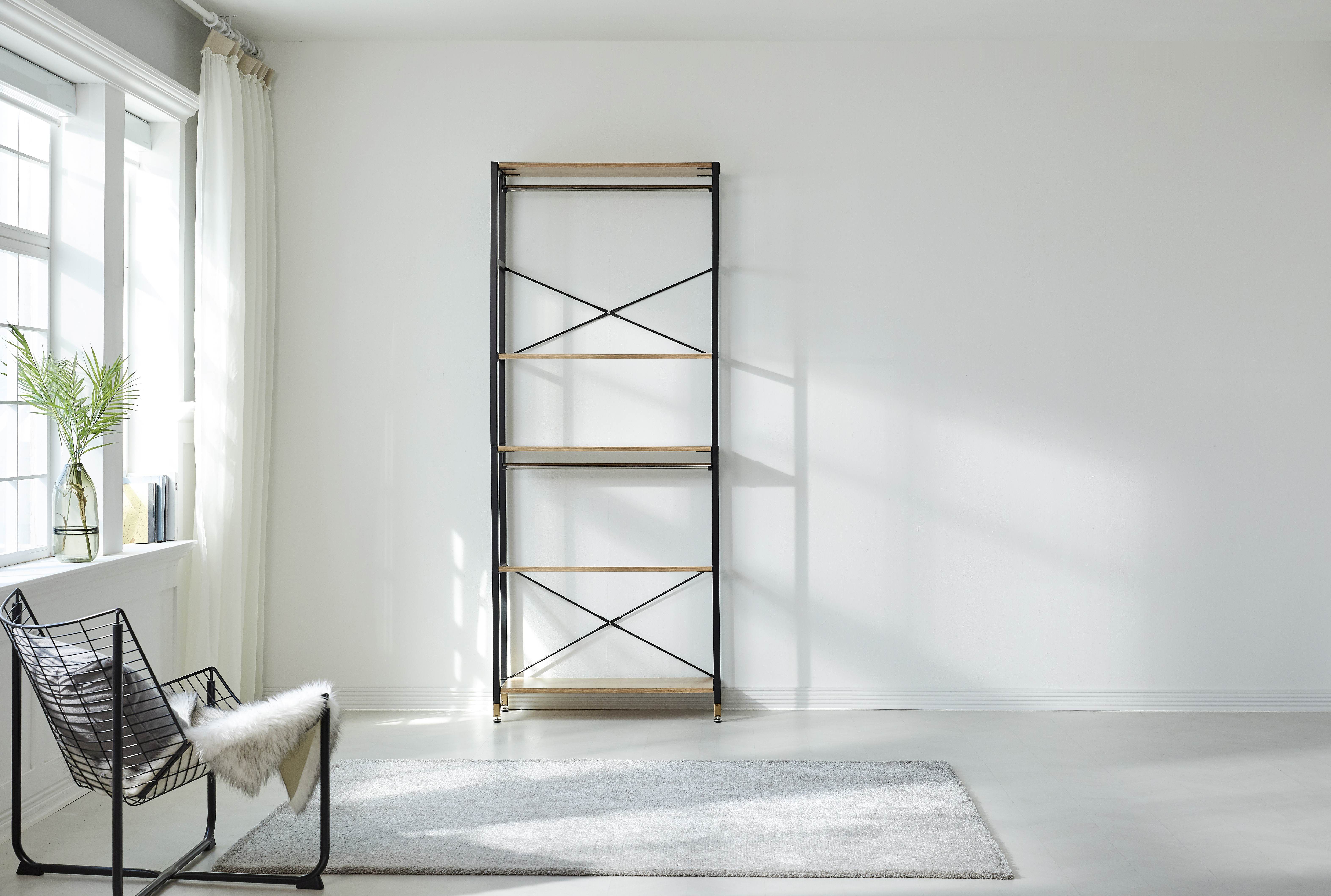 Jetzt kommt Ordnung ins Chaos. Mit diesem Regal schaffen Sie zusätzlichen Stauraum und Platzmangel ist künftig kein Thema mehr. Mit einer Höhe von 210 cm bietet Ihnen das Regal genügend Platz für z.B. Bücher oder Dekorationsartikel. An der Stange können Sie Ihre Kleidung aufhängen. Der Rahmen besteht aus Metall. Die vier Einlegeböden sind aus furniertem MDF in Akazie-Optik. Dank der offenen Aufteilung des Standregals kann dieses auch als Raumteiler genutzt werden. Mit seiner Breite von 85 cm ist es für fast alle Räume geeignet.