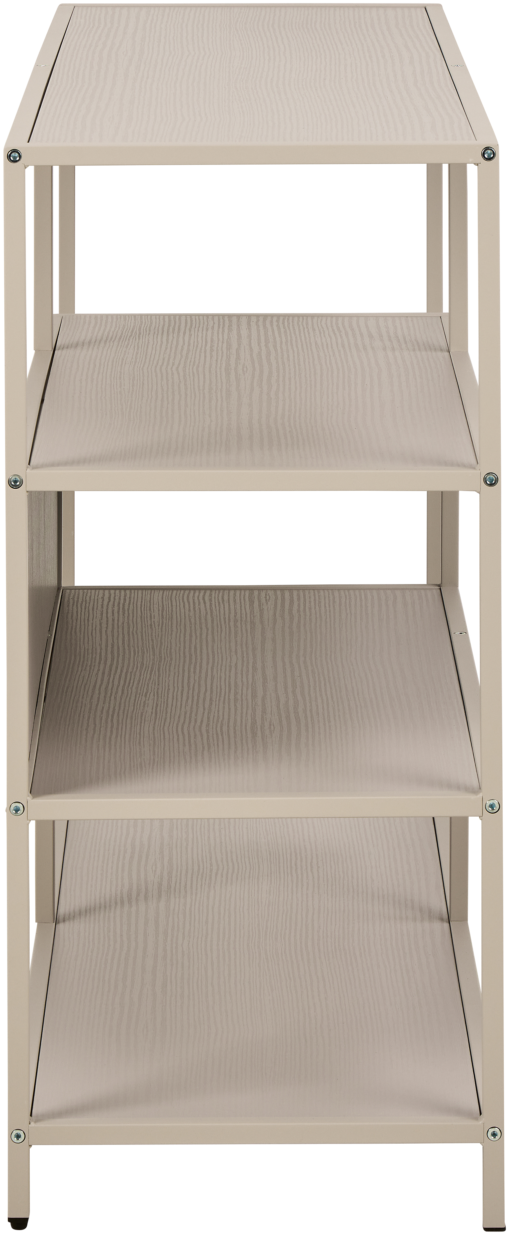 Das stabile Gestell aus pulverbeschichtetem Stahl in Grau sorgt für langlebige Stabilität, während die melaminbeschichteten Ablageflächen eine pflegeleichte und robuste Oberfläche bieten. Mit mehreren offenen Fächern schafft das Seaford Regal praktischen Stauraum für Bücher, Dekoration, Ordner oder persönliche Accessoires und lässt zugleich Raum für Ihre individuellen Einrichtungsideen.
