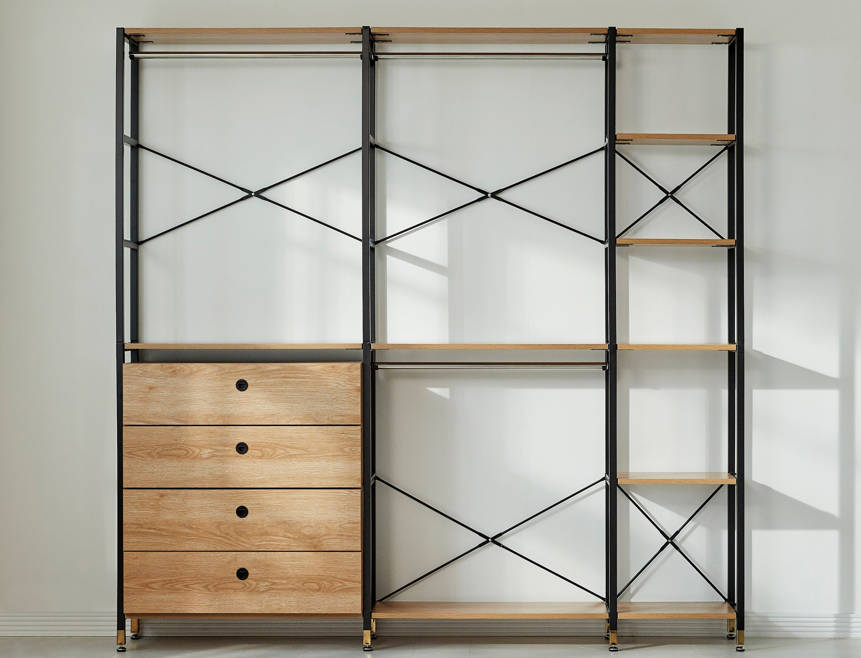 1 breites Regal mit 2 Böden, 1 Kleiderstange und 4 Schubladen