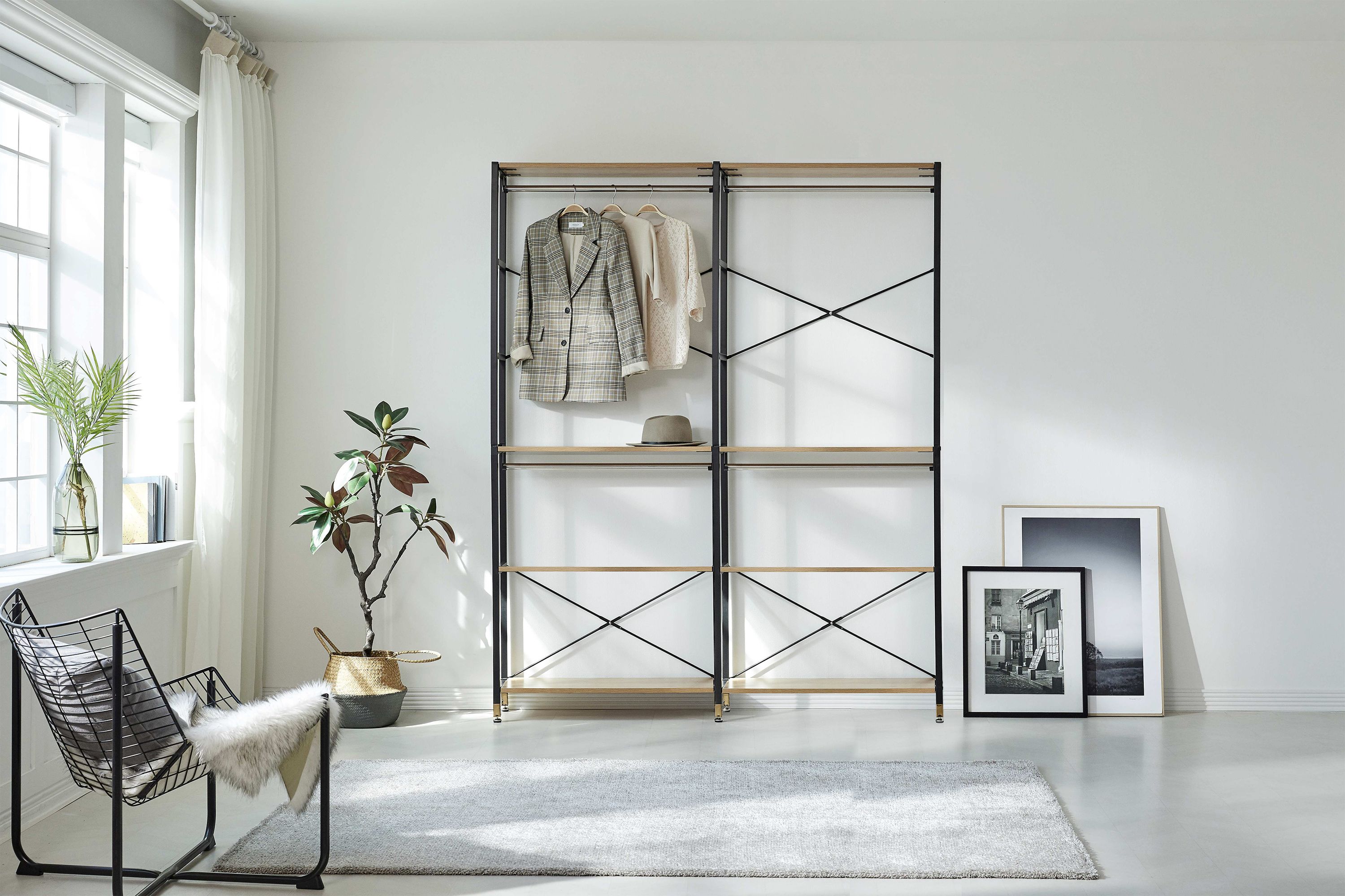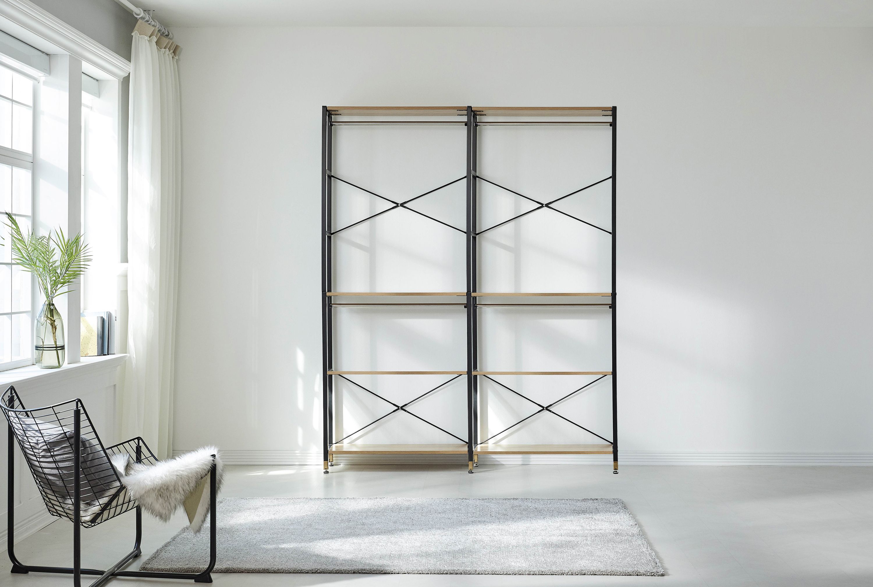 Jetzt kommt Ordnung ins Chaos. Mit diesem Regal schaffen Sie zusätzlichen Stauraum und Platzmangel ist künftig kein Thema mehr. Mit einer Höhe von 210 cm bietet Ihnen das Regal genügend Platz für z.B. Bücher oder Dekorationsartikel. An der Stange können Sie Ihre Kleidung aufhängen. Der Rahmen besteht aus Metall. Die Einlegeböden sind aus furniertem MDF in Akazie-Optik. Dank der offenen Aufteilung des Standregals kann dieses auch als Raumteiler genutzt werden.