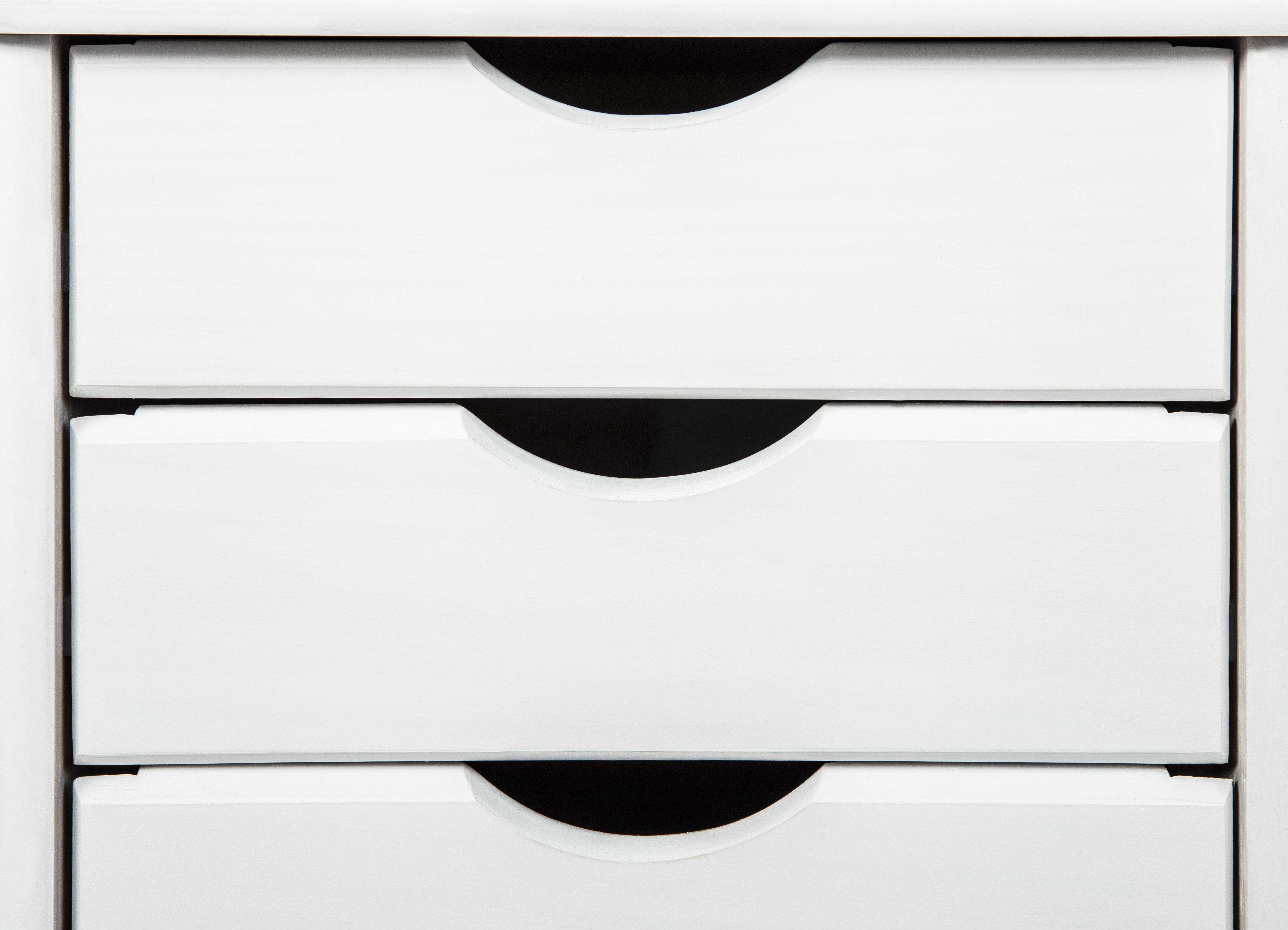 Die Oberfläche des Containers ist weiß lackiert, wobei die einzigartigen Holzmaserungen des Massivholzes bewusst sichtbar bleiben, um den natürlichen Holzcharakter zu betonen.