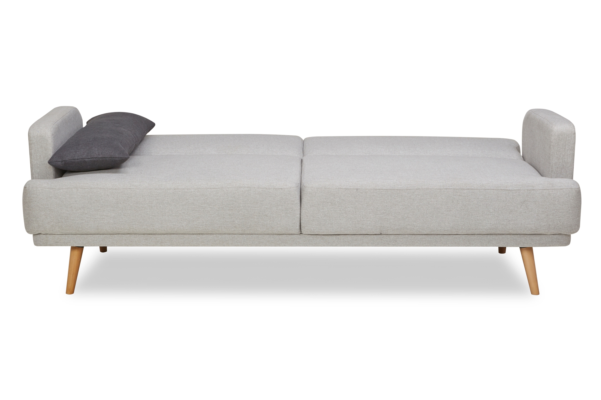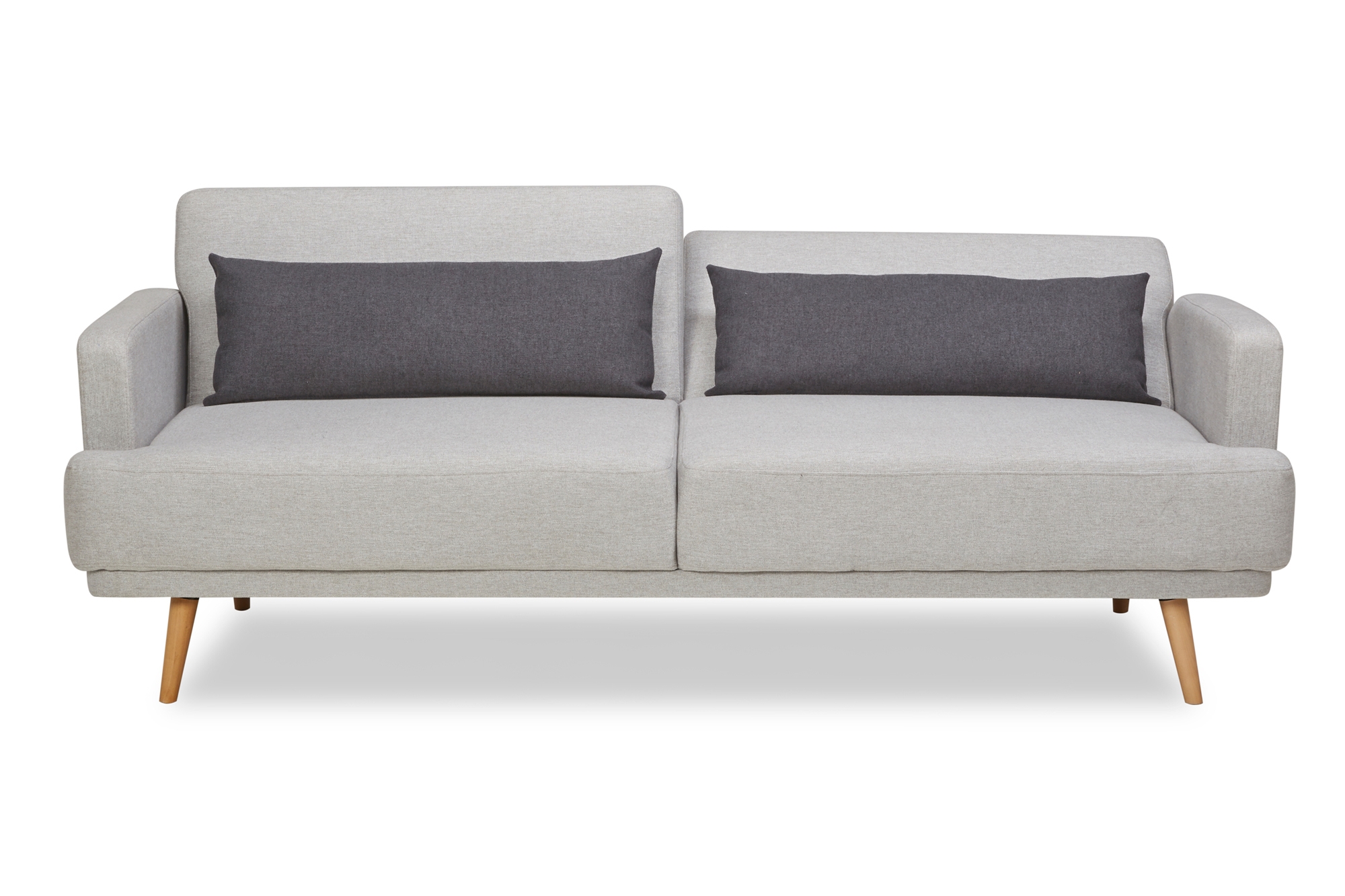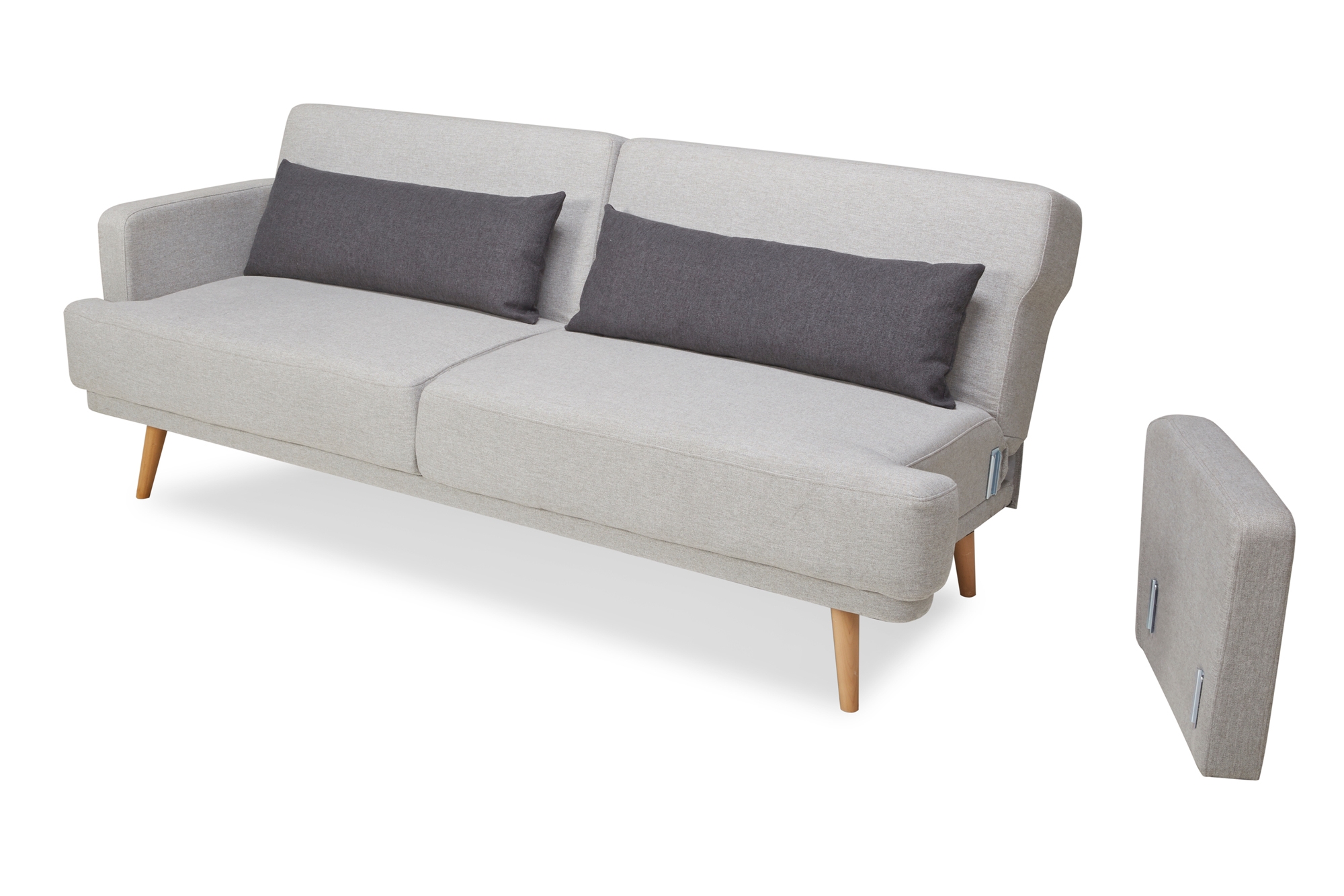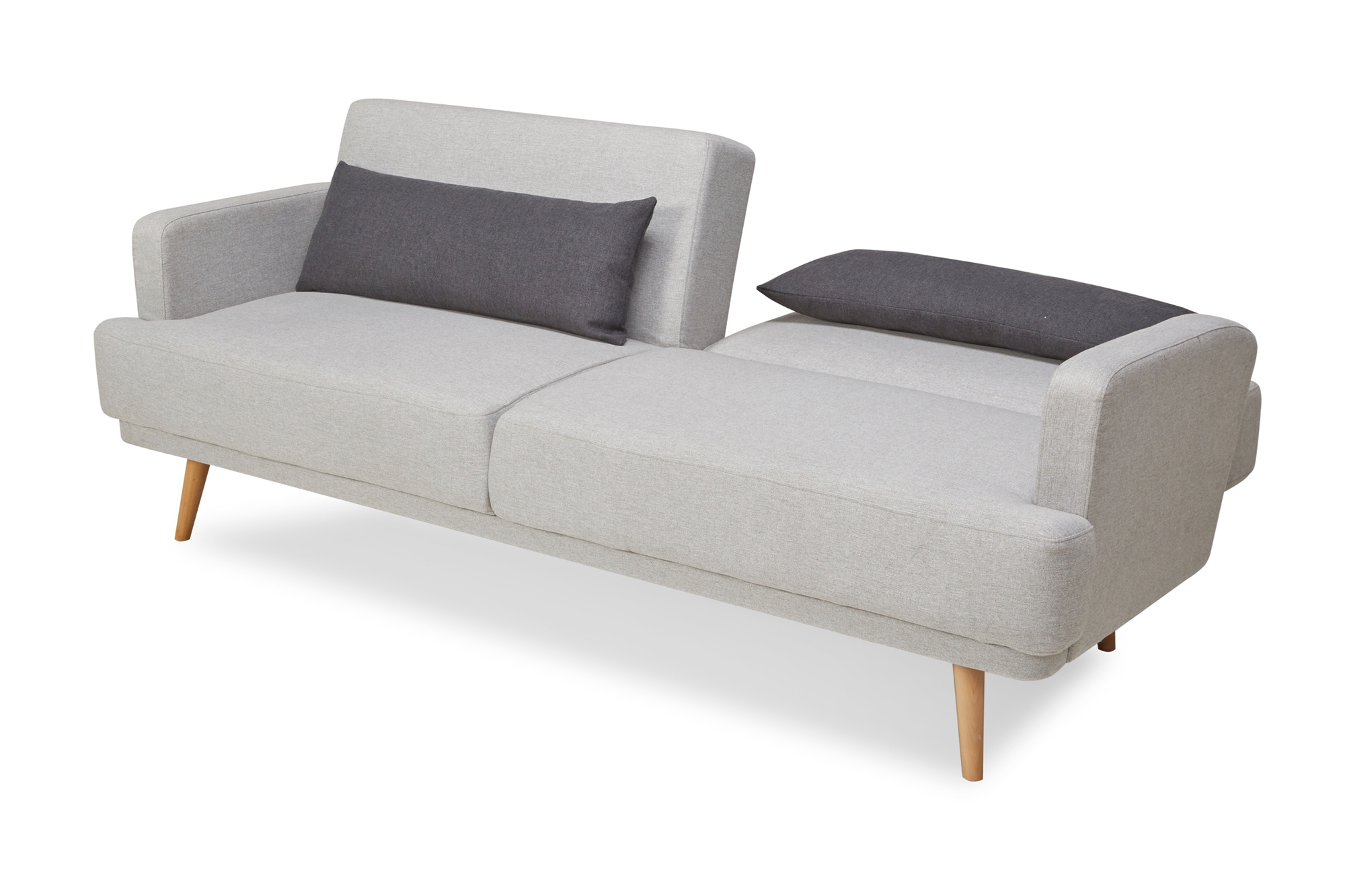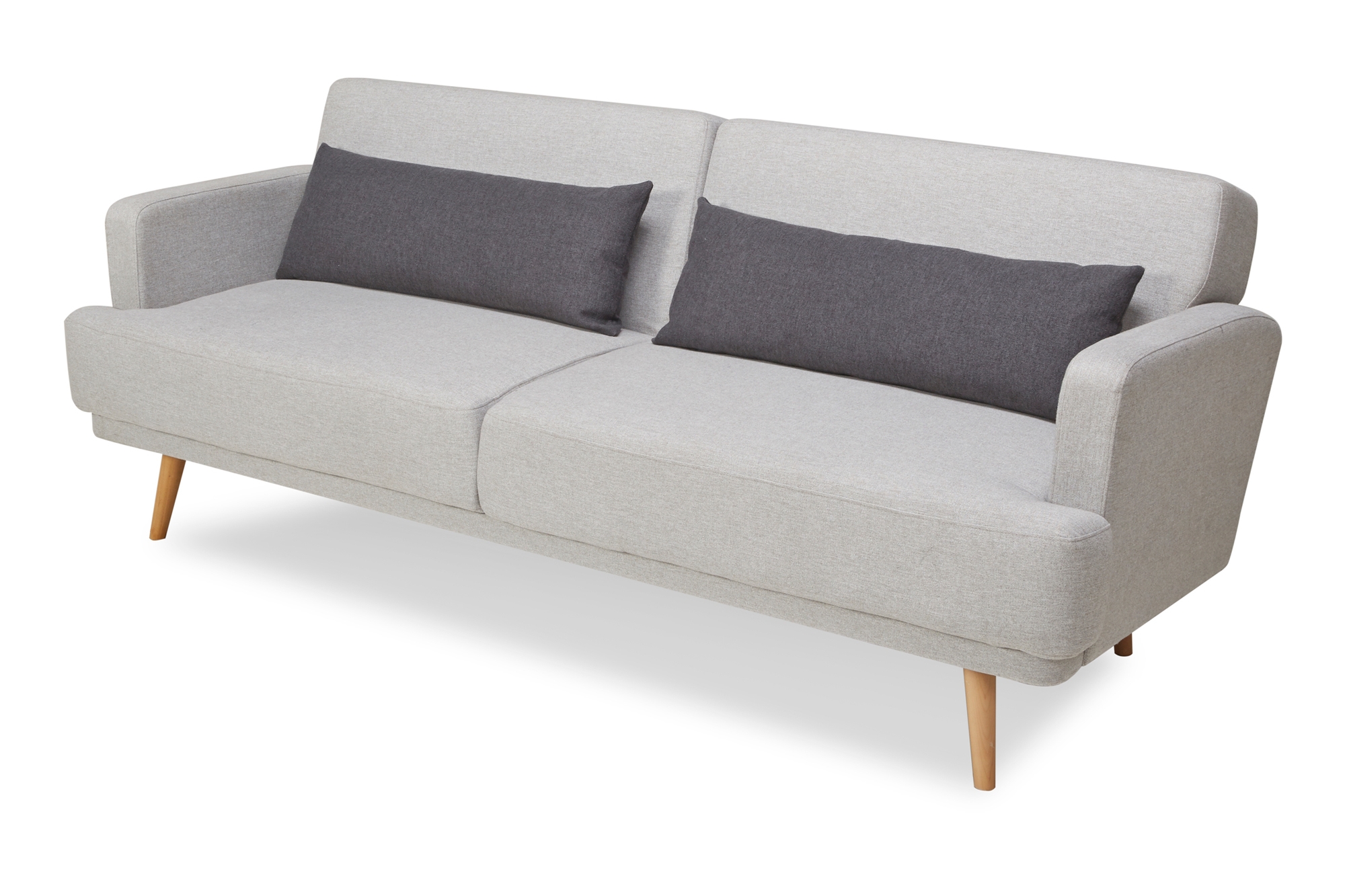 Dieses moderne 3-Sitzersofa mit Schlaffunktion ist die ideale Lösung für Gäste-, Jugend- oder Wohnzimmer. Das Sofa bietet nicht nur eine zusätzliche Schlafmöglichkeit für spontane Übernachtungsgäste – Es verleiht jedem Raum auch einen top-modernen Charme. Gepolsterte Rücken- und Armlehnen sorgen für optimalen Sitzkomfort, die beiden Zierkissen, welche im Lieferumfang inklusive sind, machen es zusätzlich gemütlich und werden auch zum optischen Highlight. Mit klarer Formsprache und schlichtem grauen Gewand, wird das Sofa zum zeitlosen Begleiter, welcher harmonisch in jede Inneneinrichtung passt. Durch den Rundumbezug sind bei der Platzierung des Sofas keine Grenzen gesetzt. Wer möchte, kann das Sofa auch problemlos frei im Raum aufstellen. Abgerundet wird das skandinavische Design durch die 21 cm hohen abgeschrägten Fuße aus Massivholz.