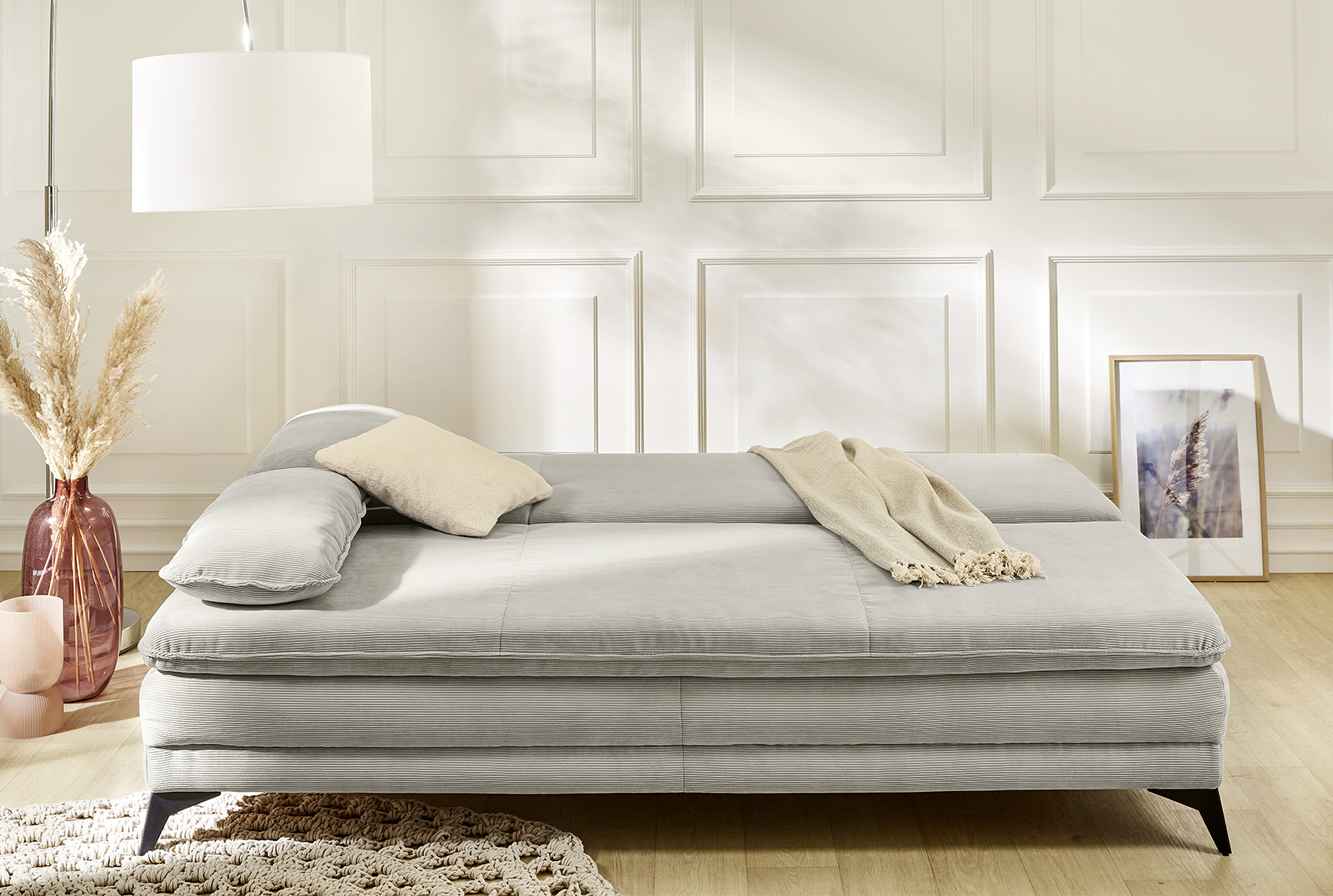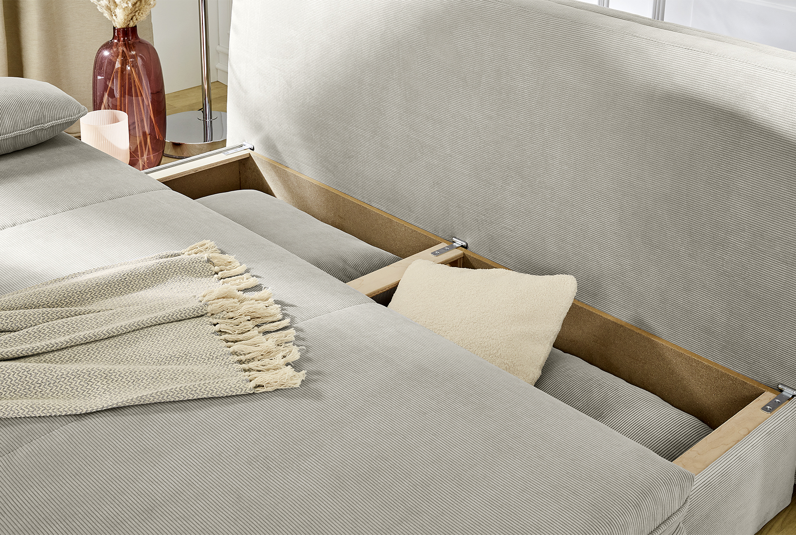 Bezug: Korpus, Sitz, Rückenkissen und Armlehnkissen in 427/19 Feincord greige aus 100% Polyester; Zierkissen in 420/07 Teddyoptik in naturfarben aus 100% Polyester