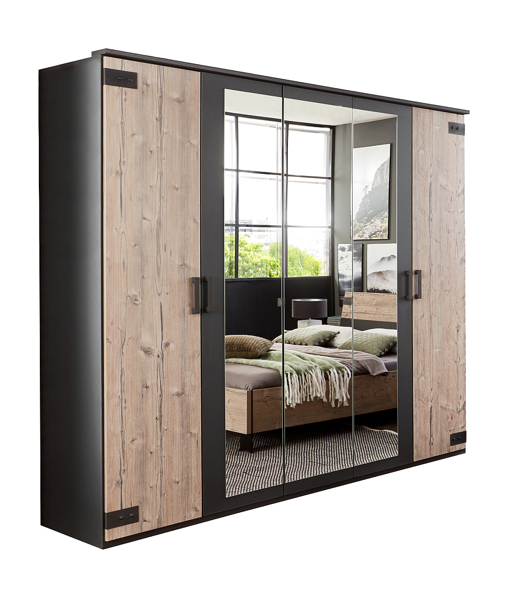 1 Drehtürenschrank, 5-türig (davon mittig 3 Türen mit Spiegel), mit 3 Fachböden und 3 Kleiderstangen
