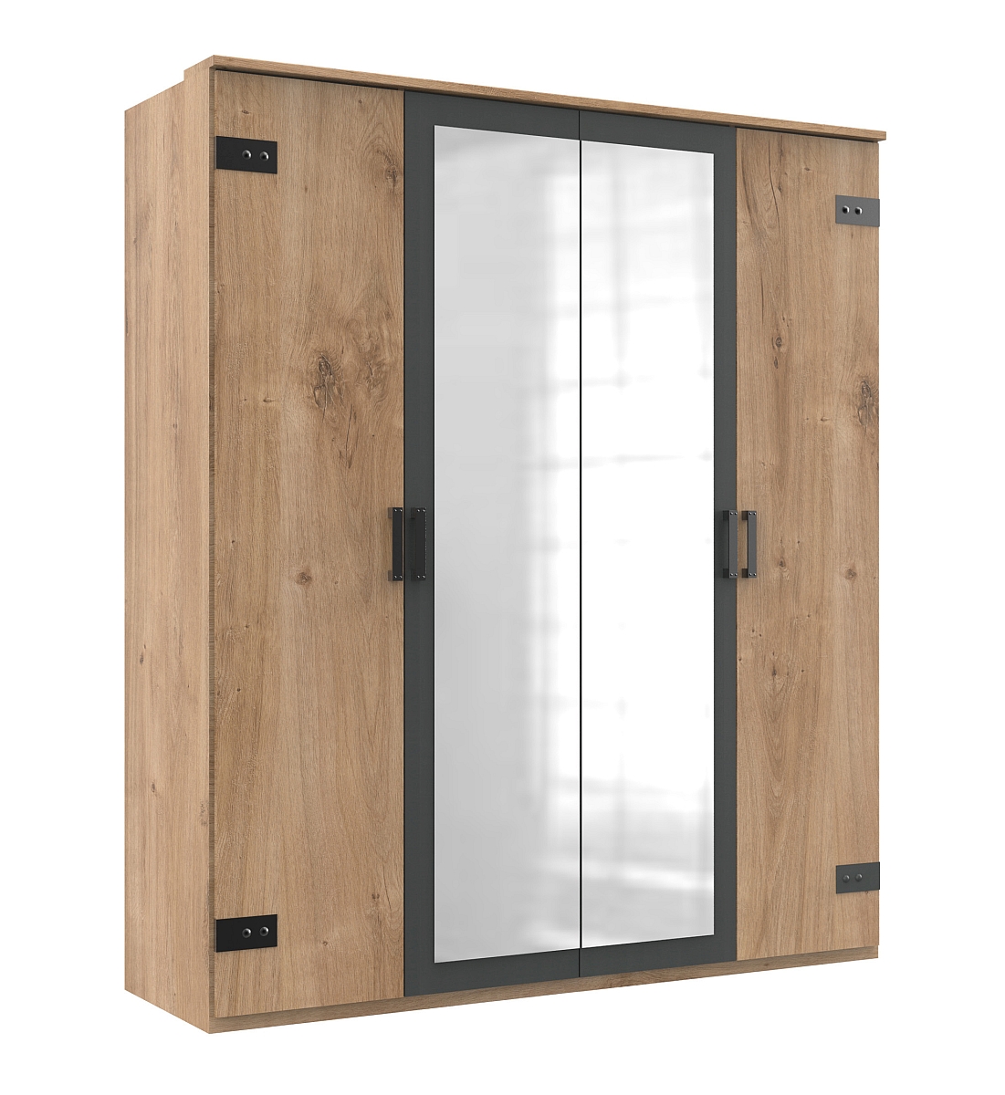 1 Drehtürenschrank, 4-türig ( mittig 2 Türen mit Spiegel), 2 Fachböden und 2 Kleiderstangen