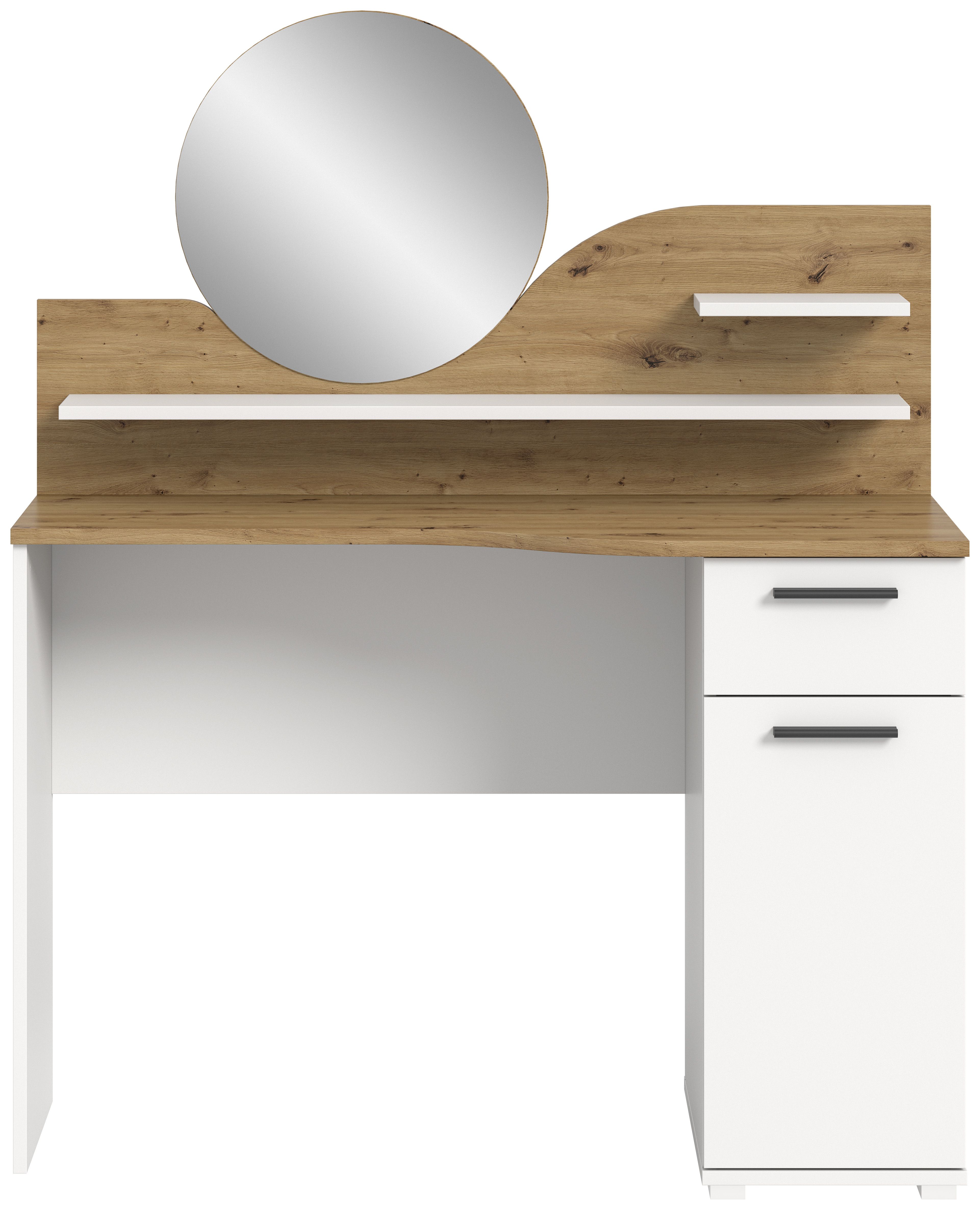Tauche ein in die Welt des Glamours mit unserem trendigen Schminktisch mit rundem Spiegel in weißer Nachbildung und Artisan Eiche Absetzung. Dieses moderne Möbelstück verleiht deinem Raum einen Hauch von Eleganz und bietet gleichzeitig praktischen Stauraum für deine Schönheitsprodukte. Genieße stilvolles Make-up und perfekte Organisation mit diesem ansprechenden Schminktisch.