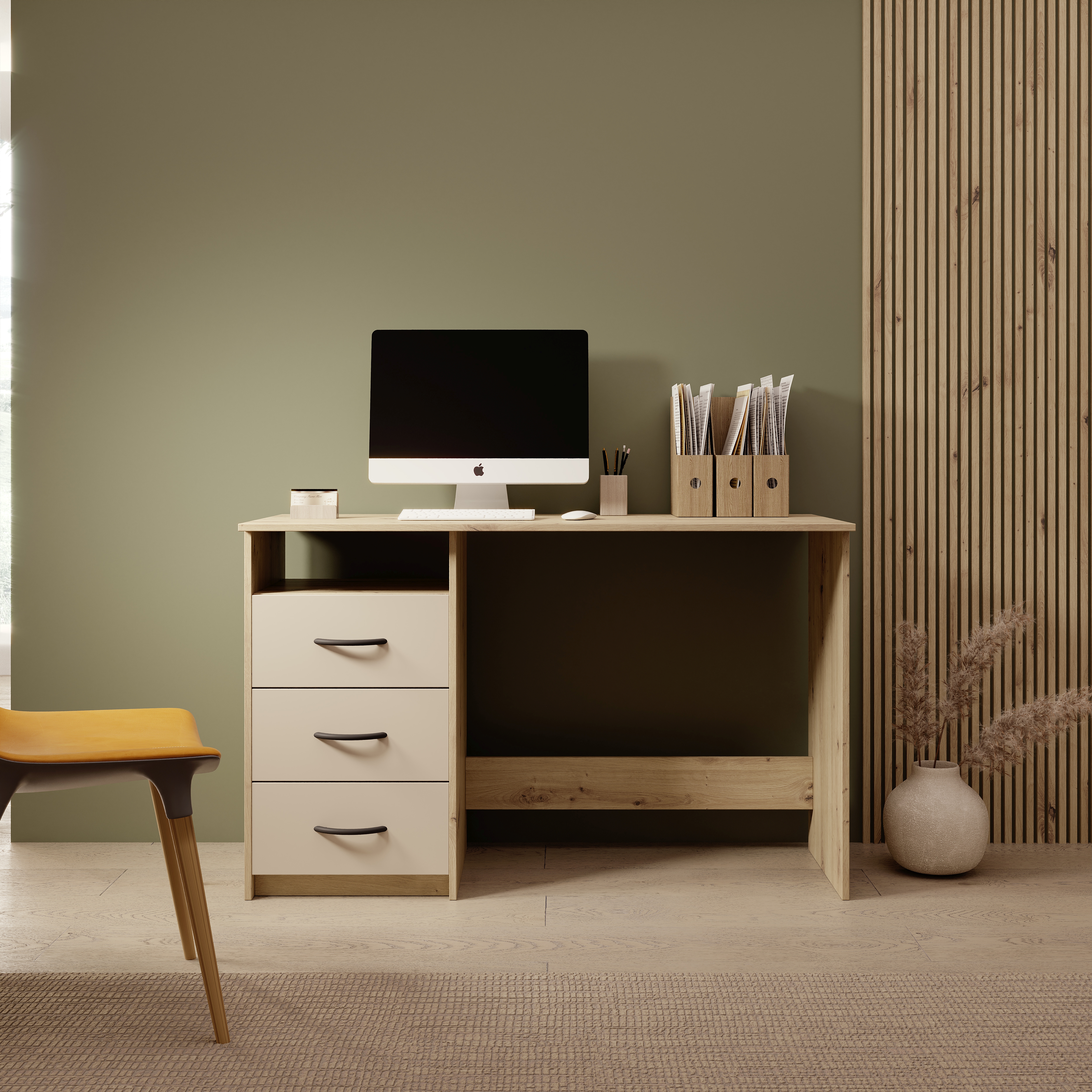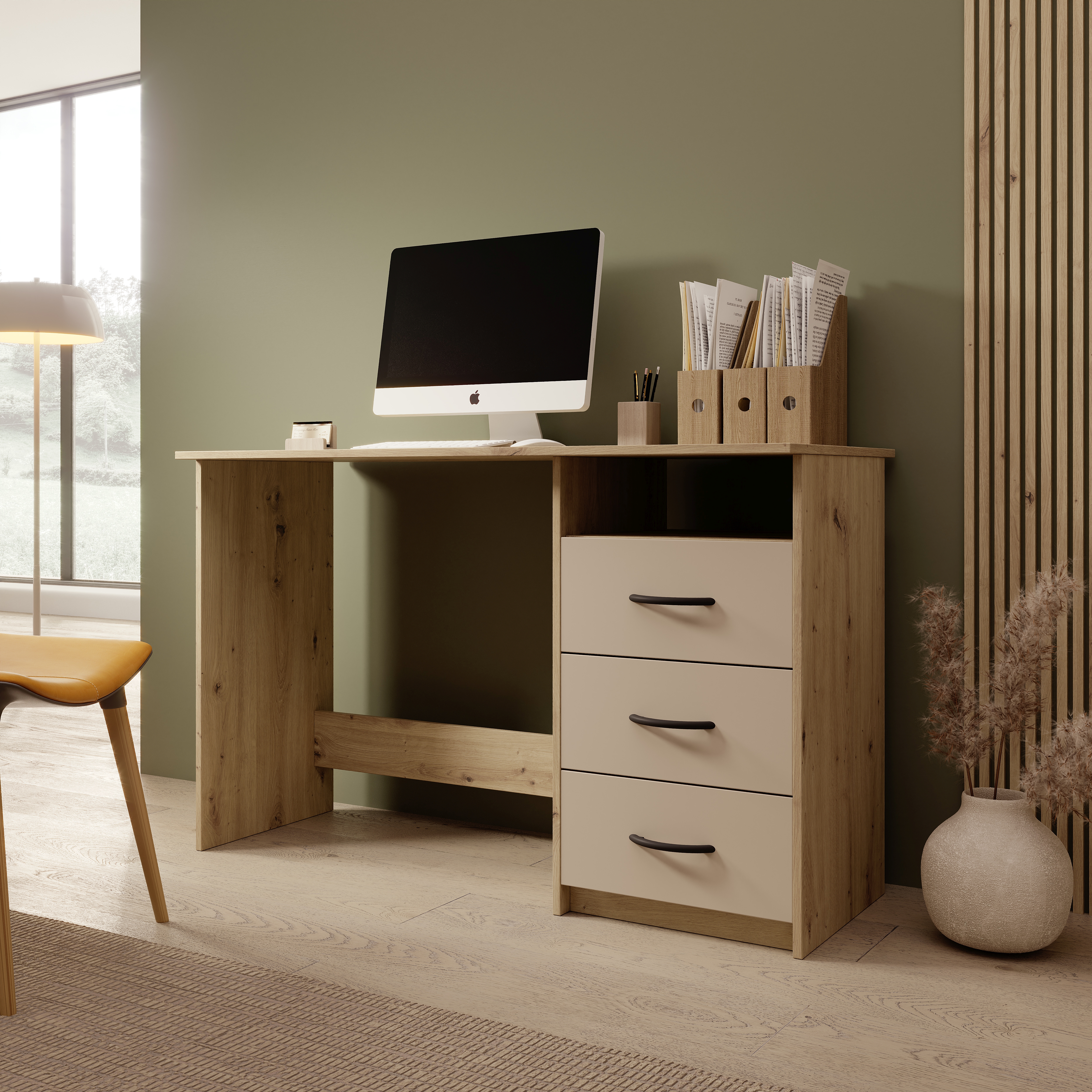 Der Schreibtisch verfügt über eine große Arbeitsplatte, die ausreichend Platz für Laptop, Unterlagen und Arbeitsmaterialien bietet. Drei Schubkästen mit Rollschubführung ermöglichen die ordentliche Aufbewahrung von Schreibutensilien. Zusätzlich steht ein offenes Fach für schnellen Zugriff auf häufig genutzte Gegenstände zur Verfügung.