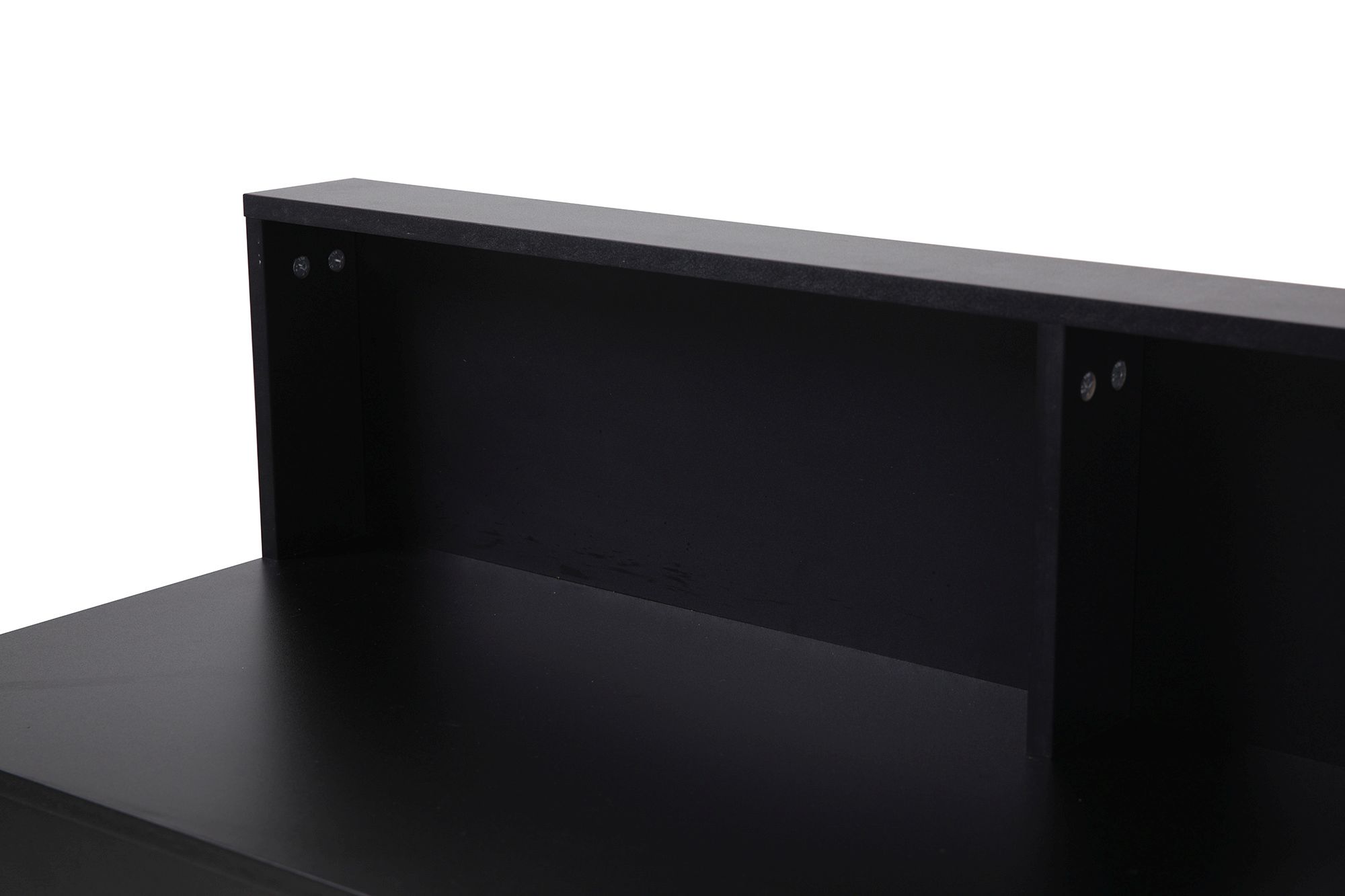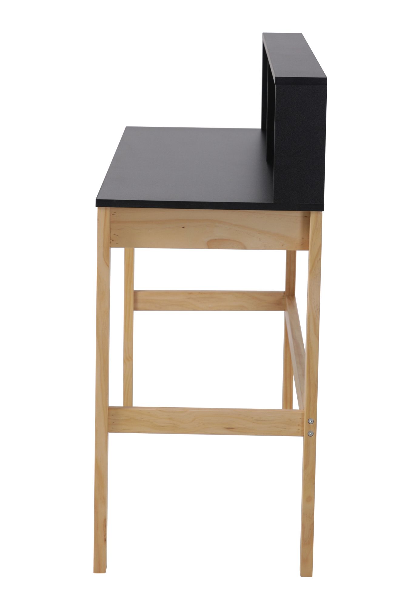 Dieser schwarze Schreibtisch wird durch den Kontrast mit den seinen hellen Holzbeinen zum Hingucker. Ein praktischer Aufsatz schafft einen Abschluss zur Wand, so dass keine Teile hinten runterfallen können.