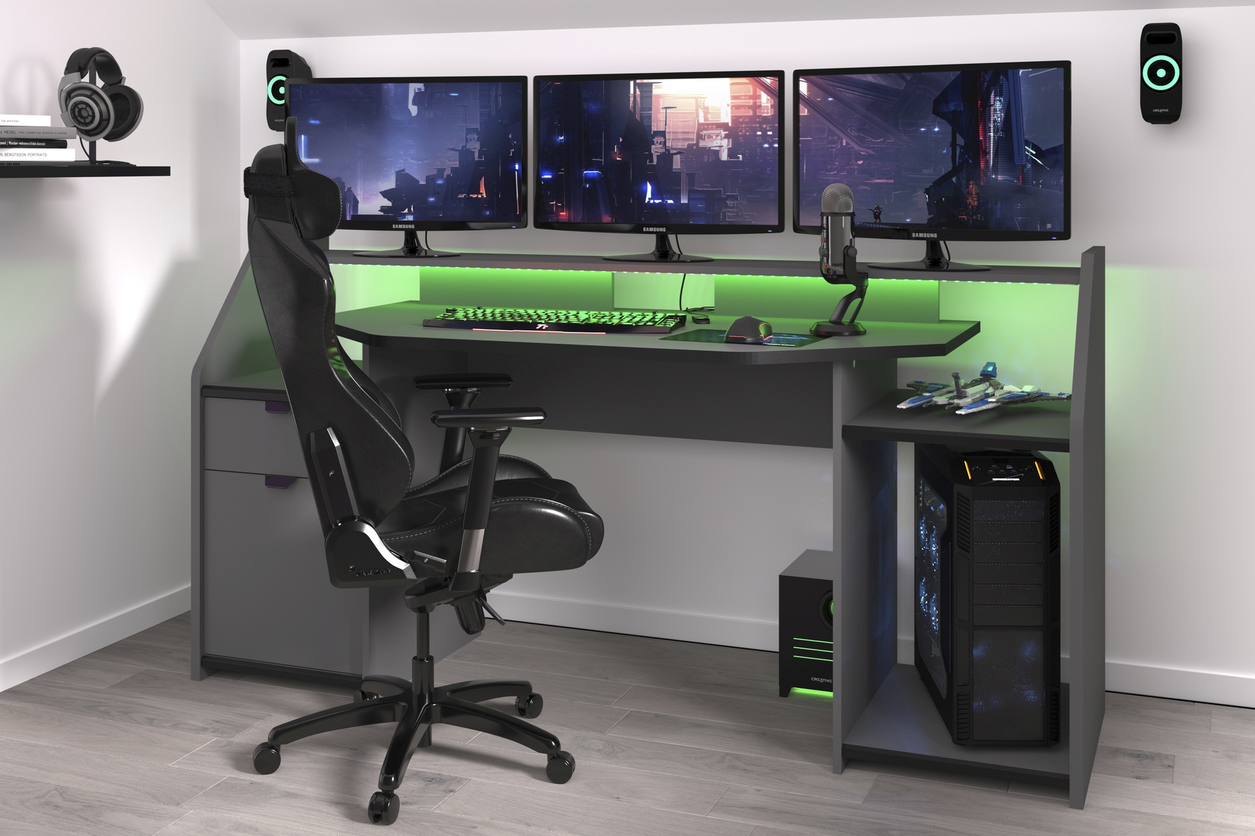 oben: große Abstellfläche für 2-3 Bildschirme und Zubehör; darunter: große Arbeitsplatte für z. Bsp. Tastatur