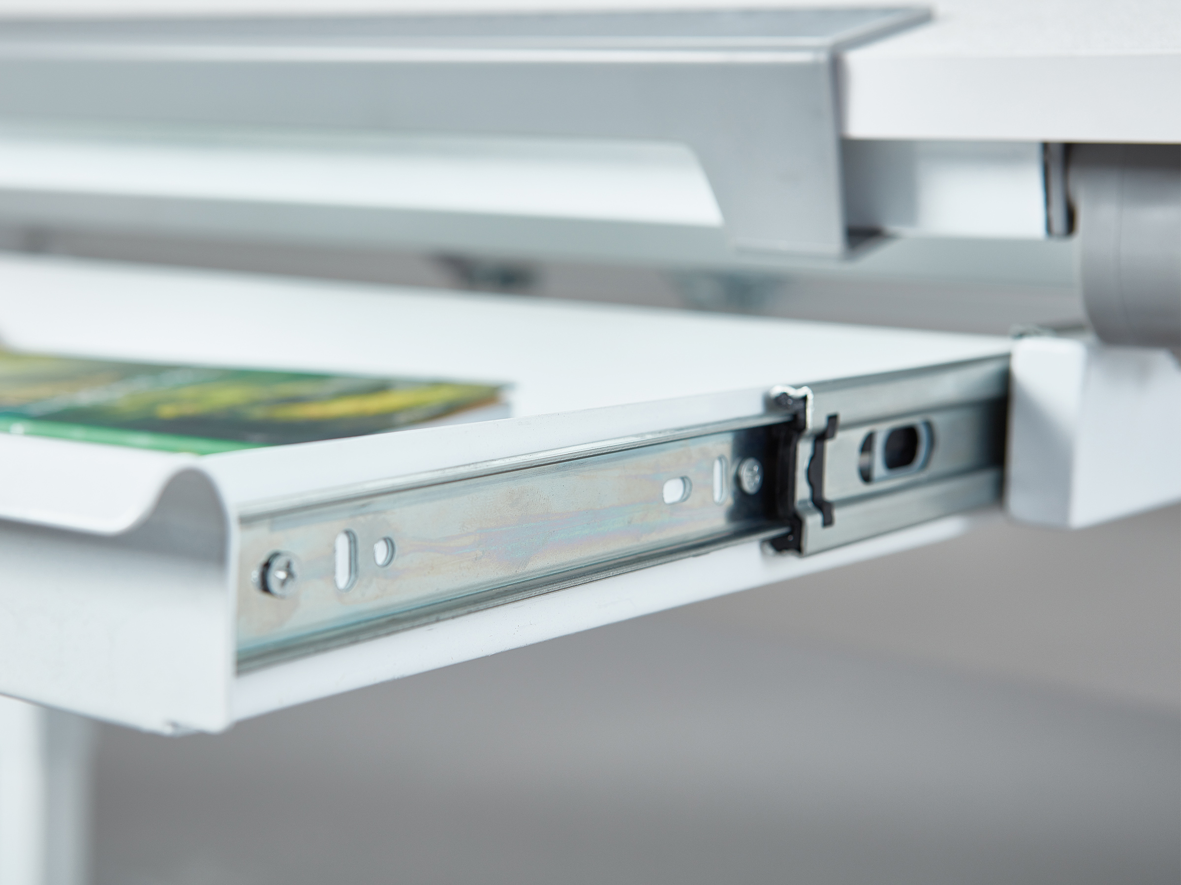 Praktisch ist auch die Schublade mit Push-to-Open-Funktion, die genügend Platz für wichtige Materialien wie Stifte und Bücher bietet. Eine Kunststoff-Anschlagsleiste mit einer Skalierung von 1 bis 80 cm auf der Tischplatte ermöglicht exakte Messungen und dient als Lineal.