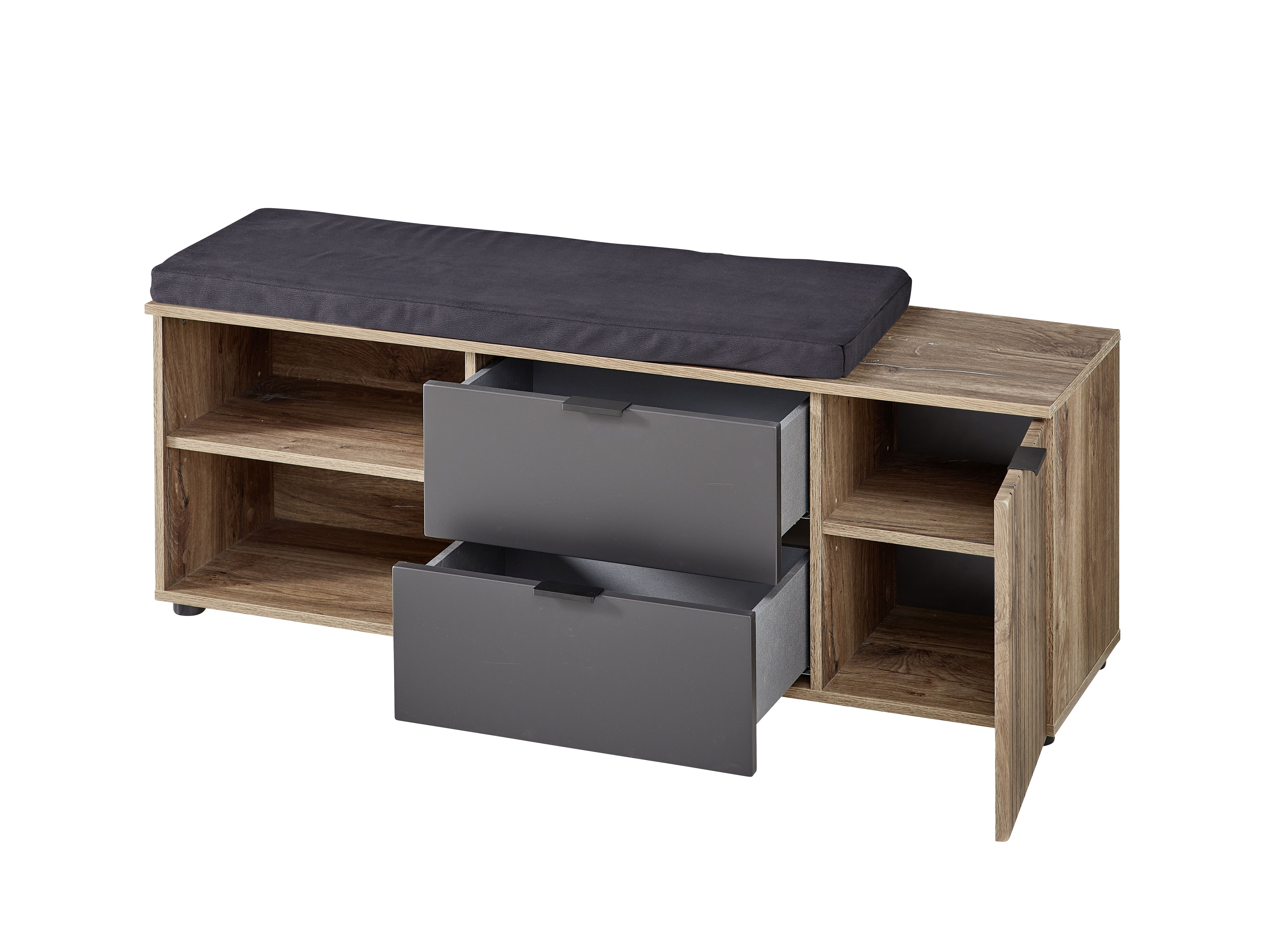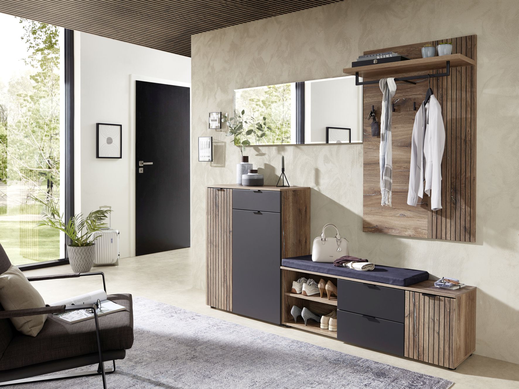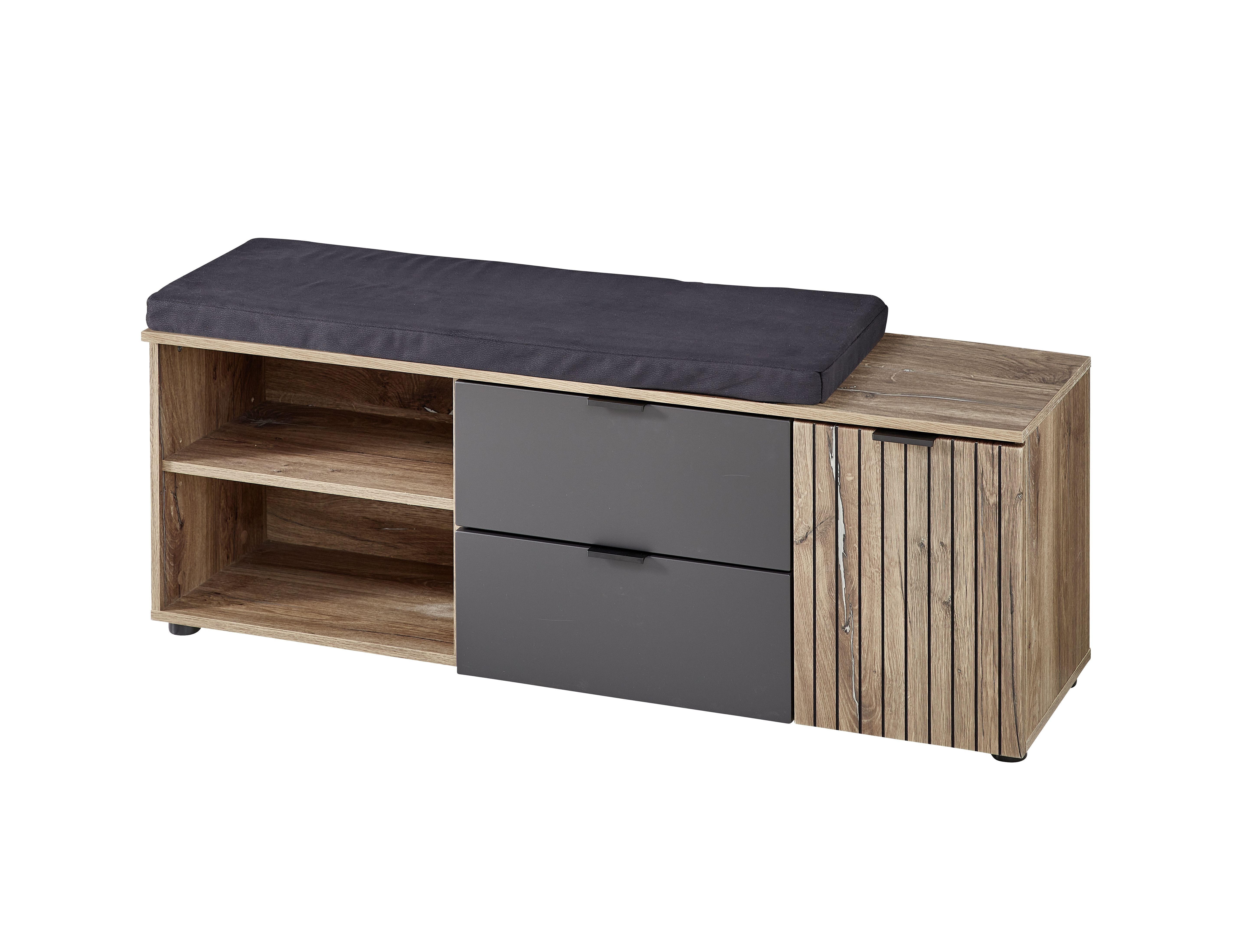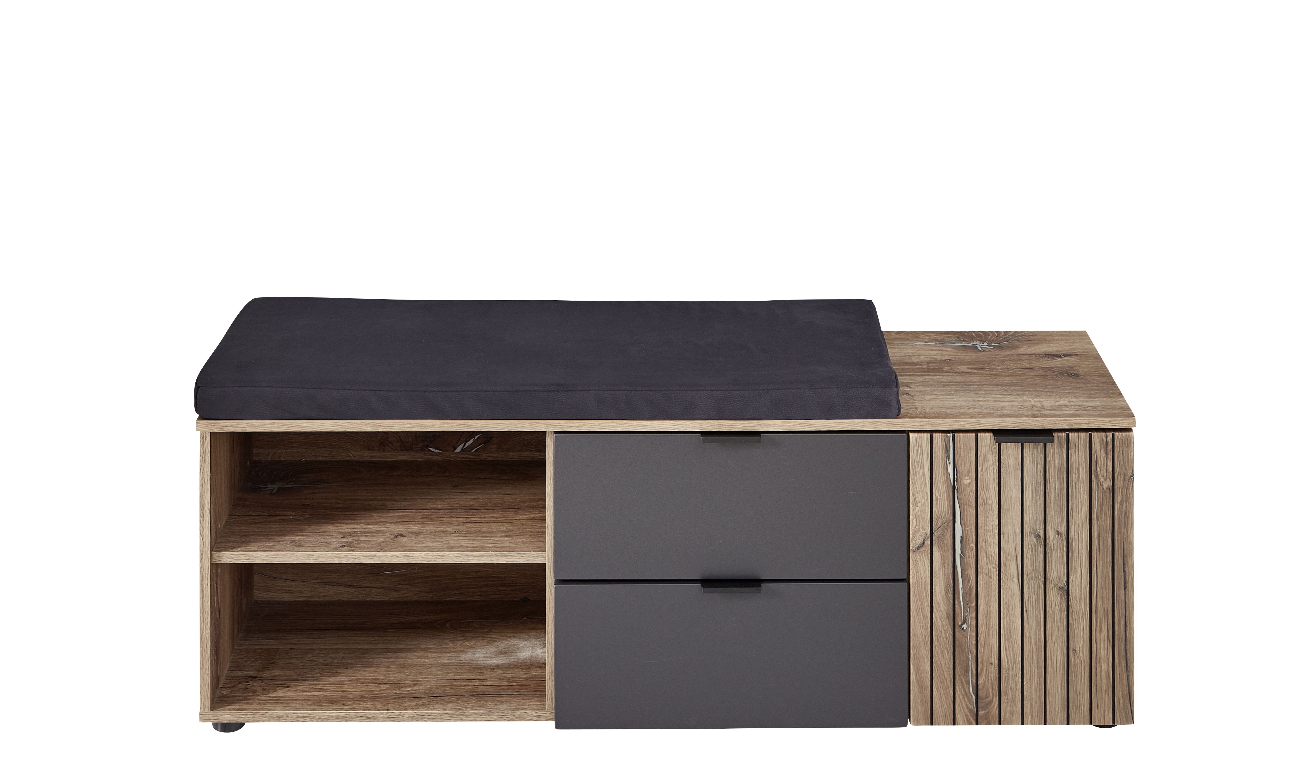Front: Cosmos Grey supermatt MDF (Mitteldichte Holzfaserplatte) mit Absetzungen in Leistenoptik Flagstaff Eiche Umbra MDF Holznachbildung