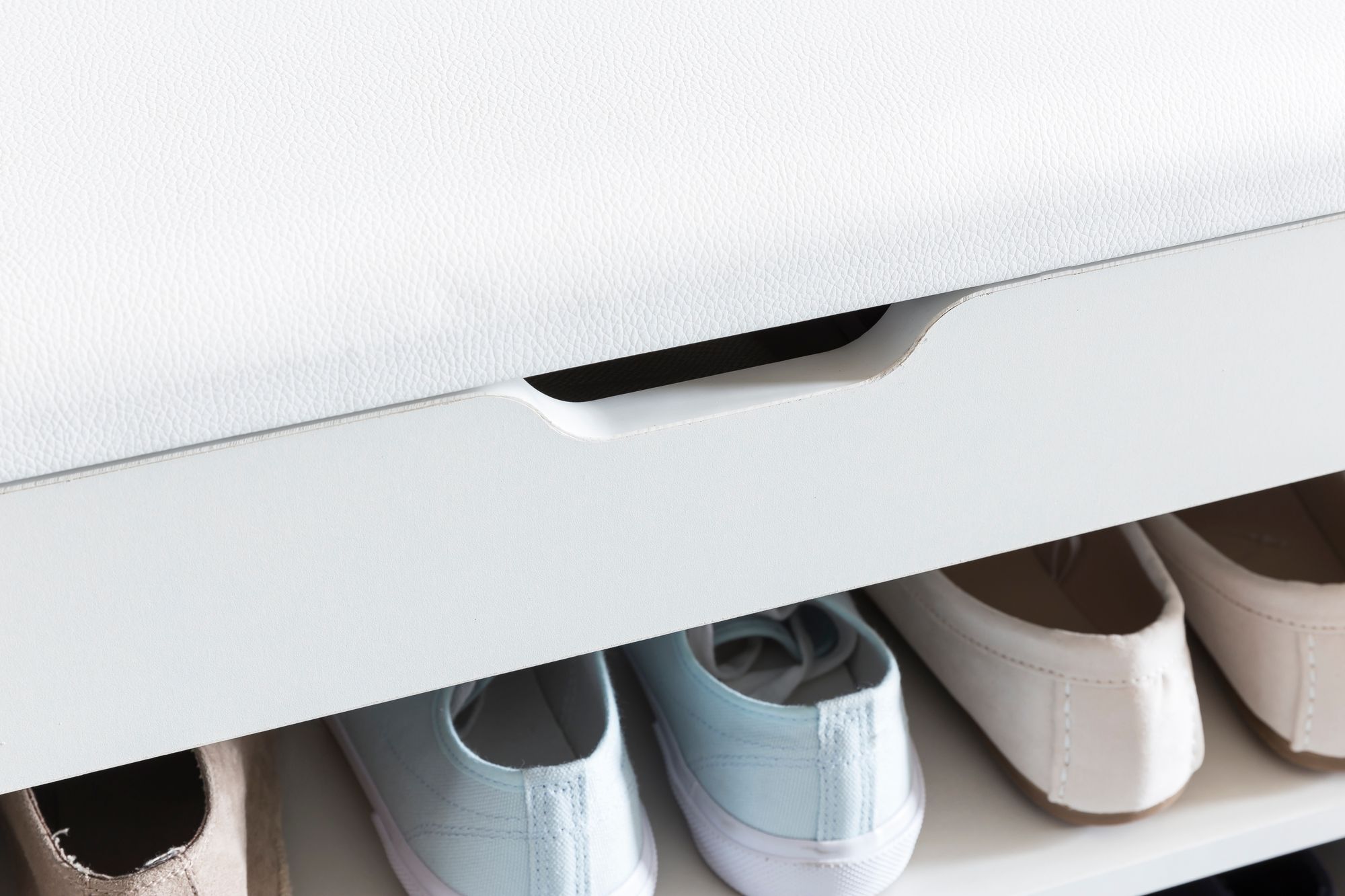 - MATERIAL ✔ Der offene Design-Schuhschrank besteht aus Spanplatte. Die Oberfläche wurde zusätzlich mit einer Melaminharz-Beschichtung versehen, sodass diese wasserabweisend und besonders pflegeleicht ist. Das Sitzkissen ist mit pflegeleichtem Kunstleder bezogen.