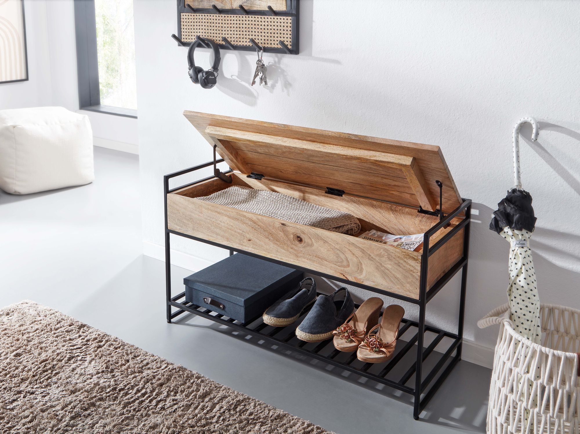 MATERIAL ✔ Die Sitzfläche und das Staufach sind aus massivem Mangoholz, welches mit Klarlack beschichtet ist. Der Rahmen und die Schuhablage der Bank bestehen aus schwarz pulverbeschichtetem Eisen.