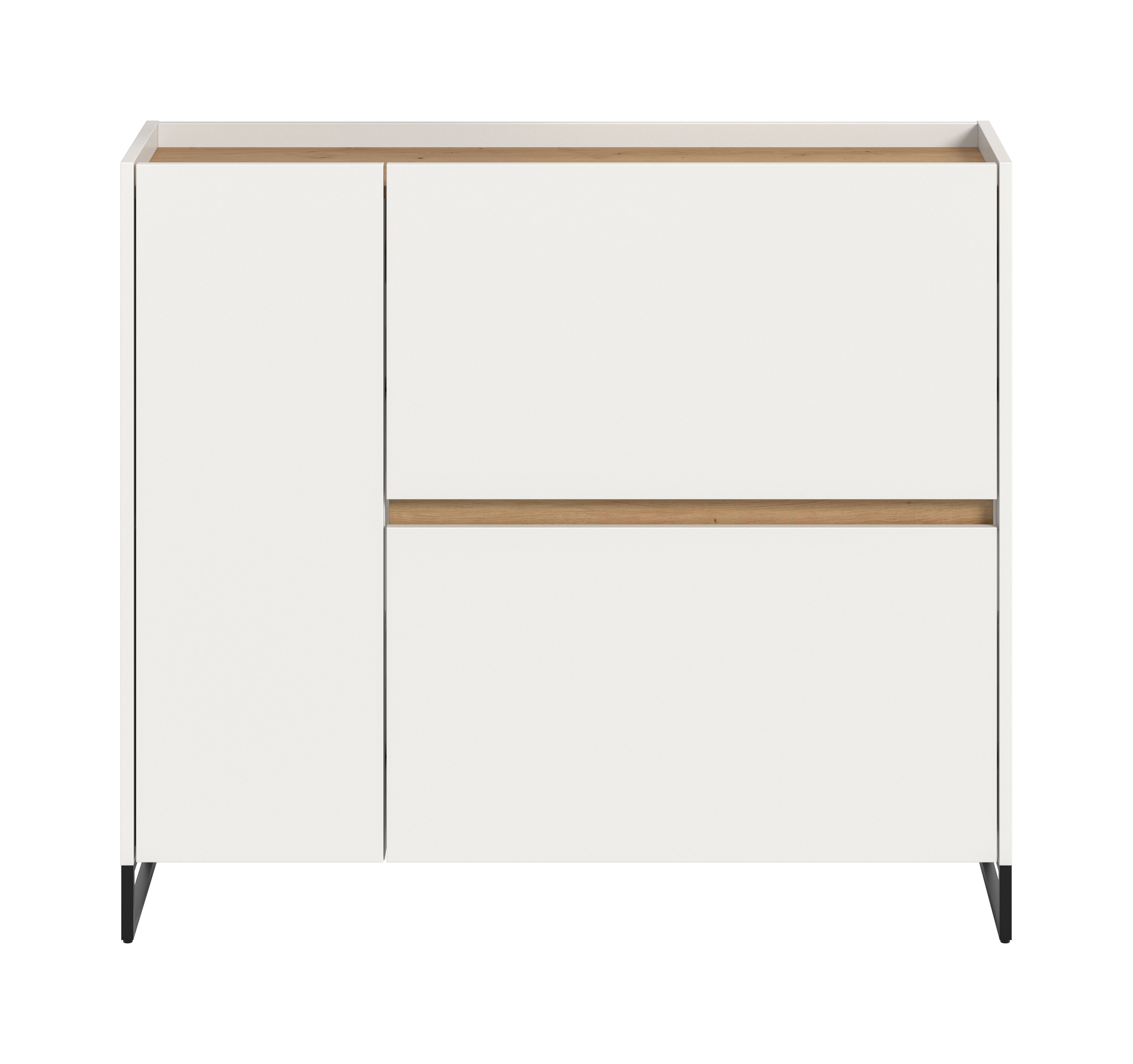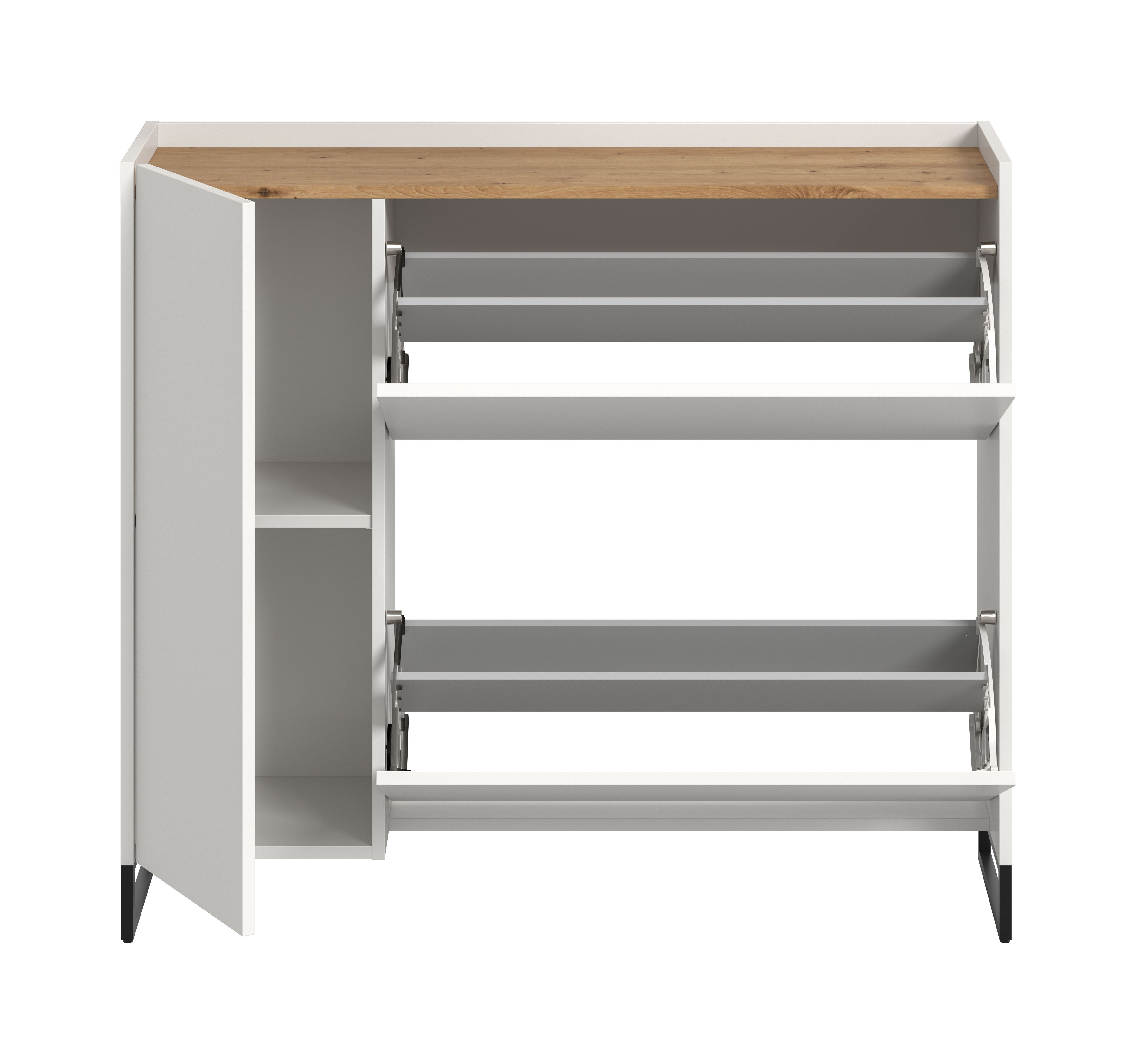 Diese Schuhkommode (110x94x32 cm) in Weiß und Artisan Oak Nachbildung bietet 1 Tür, 1 höhenverstellbaren Einlegeboden, 2 Fächer und 2 Schuhwalzen für ca. 12 Paar Schuhe. FSC®-zertifizierter Holzwerkstoff garantiert Nachhaltigkeit. Pflegeleichte Oberfläche und schnelle Montage sorgen für Komfort. Perfekt erweiterbar durch weitere Artikel der Serie. Für ein organisiertes und stilvolles Zuhause.