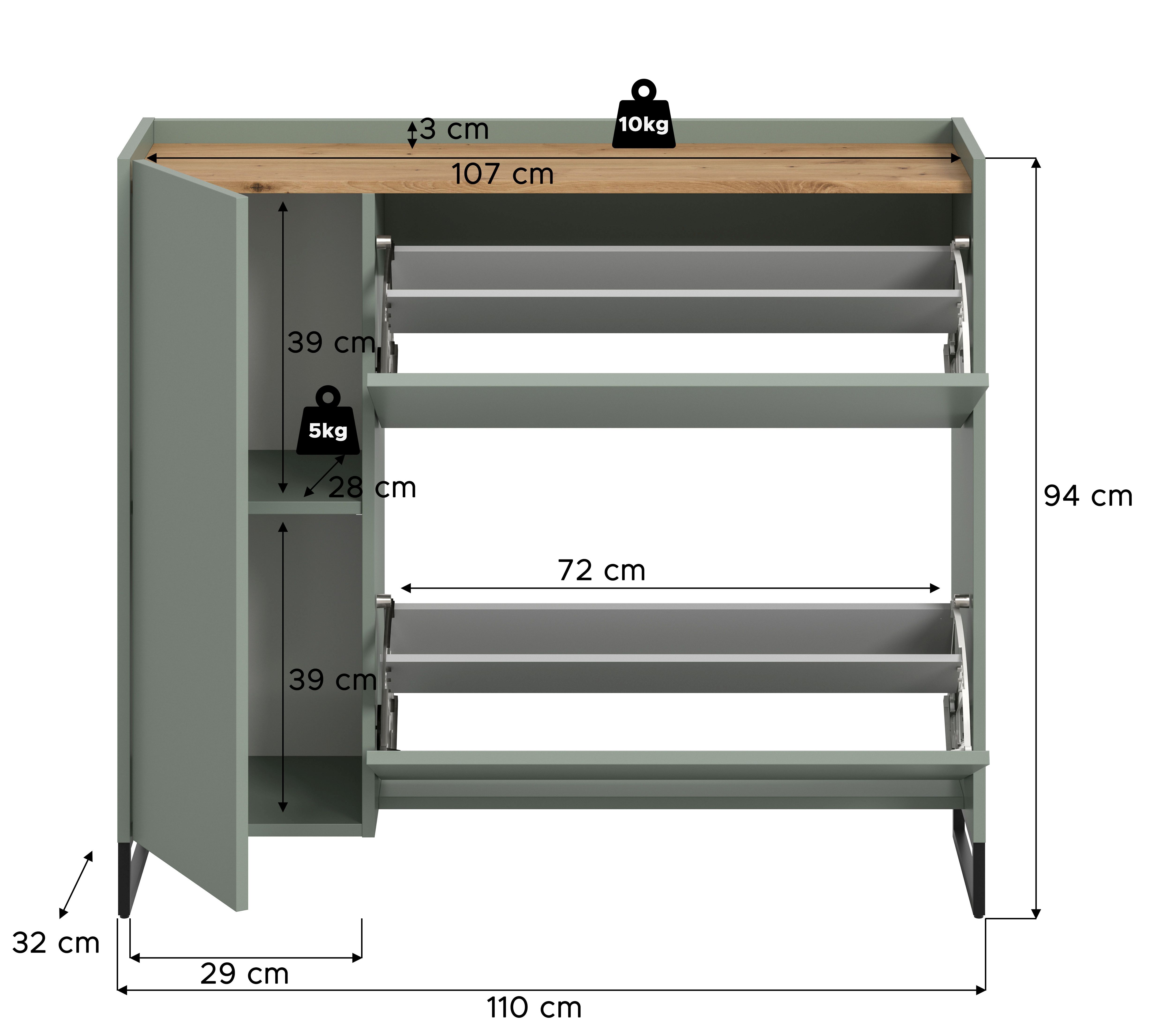 - 1 Tür, 1 höhenverstellbarer Einlegeboden, 2 Fächer, 2 Schuhwalzen, Platz für ca. 12 Paar Schuhe