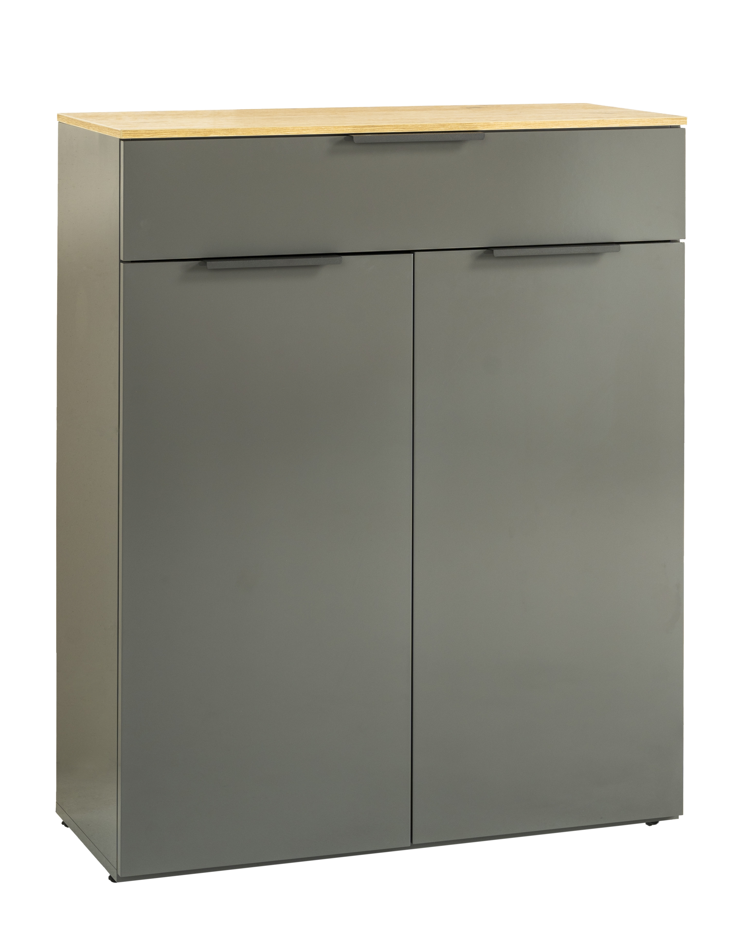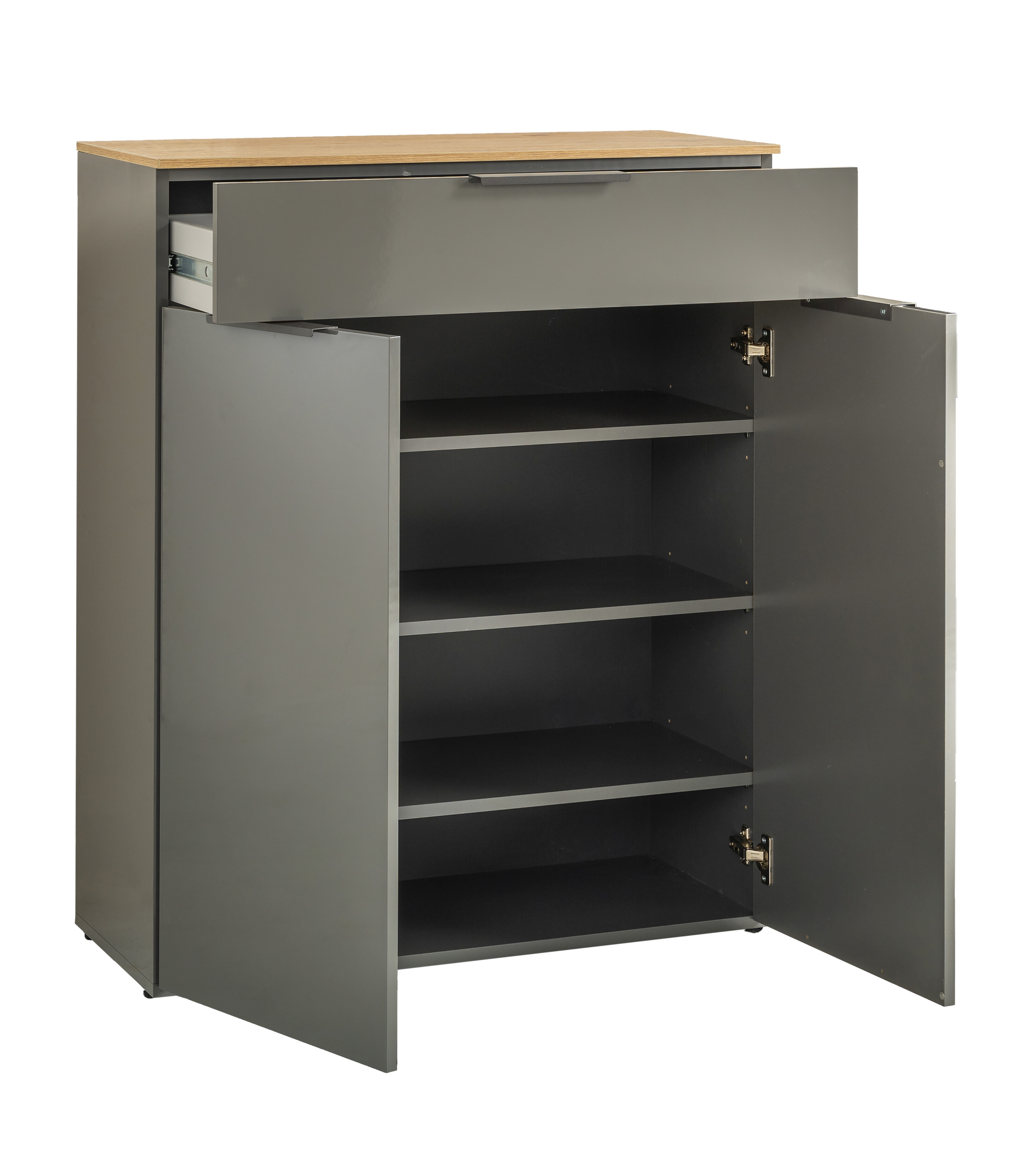 Korpus und Front: Artisan Eiche Holznachbildung kombiniert mit Hochglanz Titanium Grau
