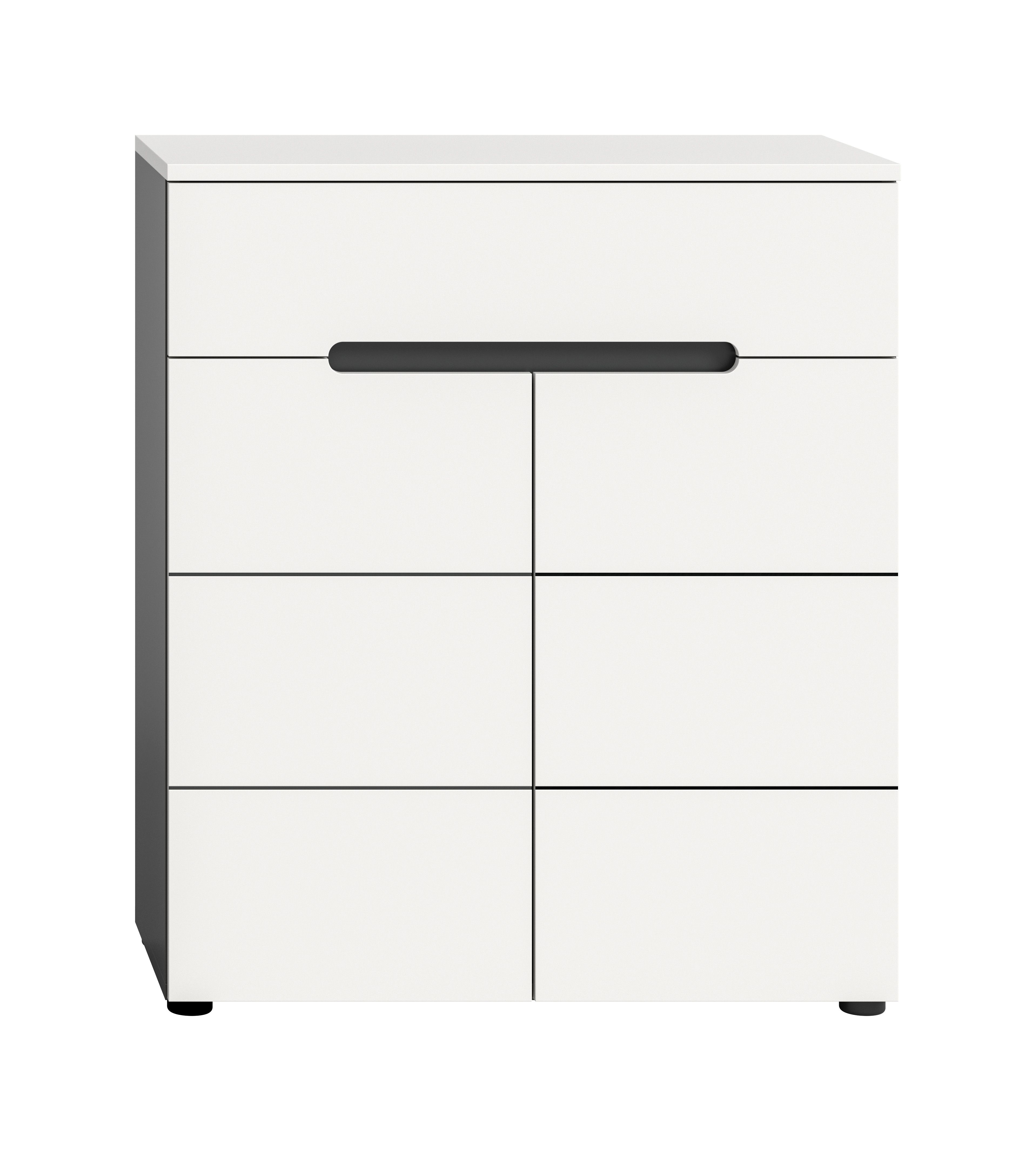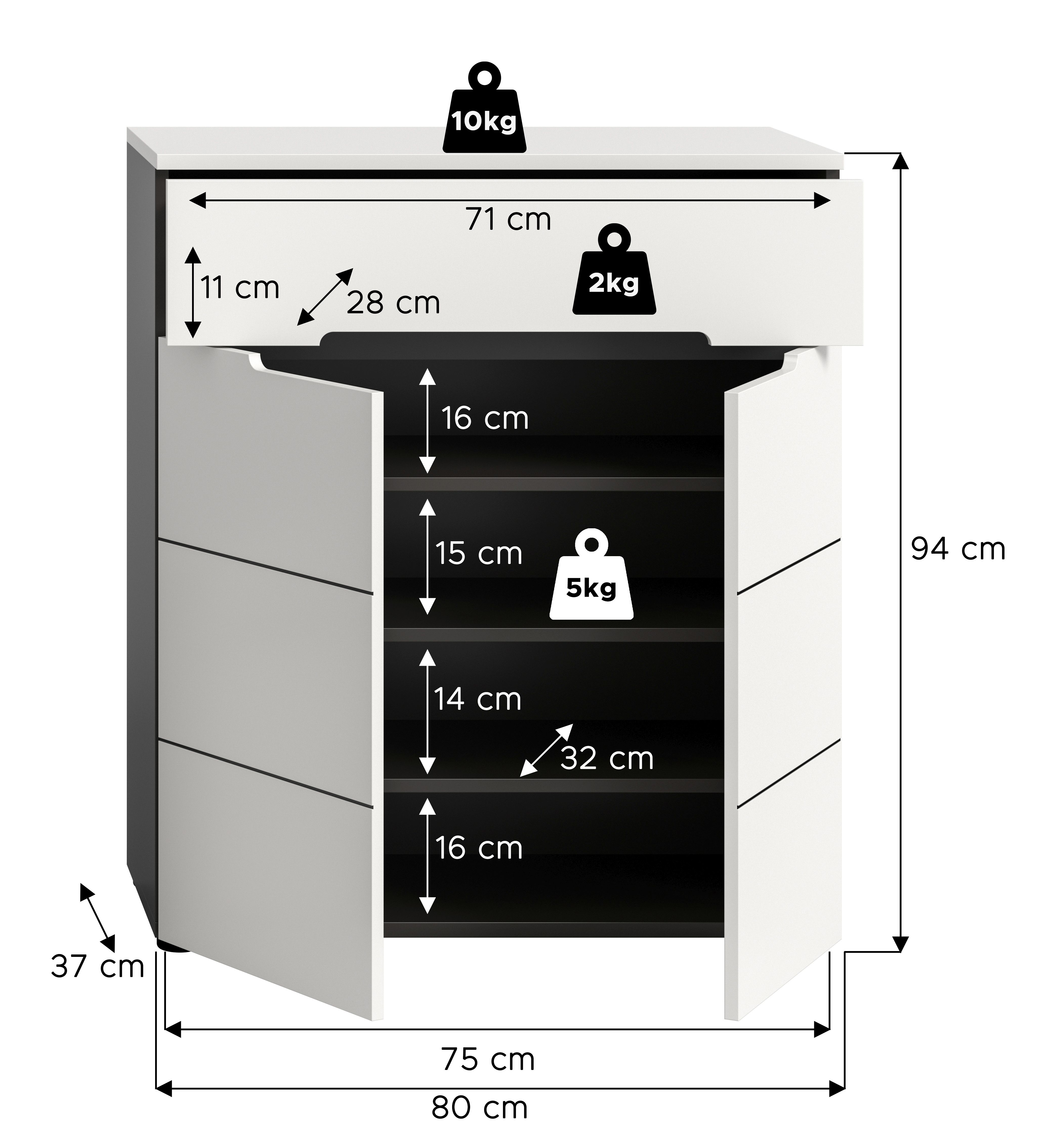Unsere Schuhkommode mit den Maßen 80x94x37 cm präsentiert sich in elegantem Basaltgrau Nachbildung und Weiß. Diese Kombination verleiht Ihrem Eingangsbereich einen modernen und stilvollen Look. Eine praktische und ästhetische Lösung für die Aufbewahrung Ihrer Schuhe.