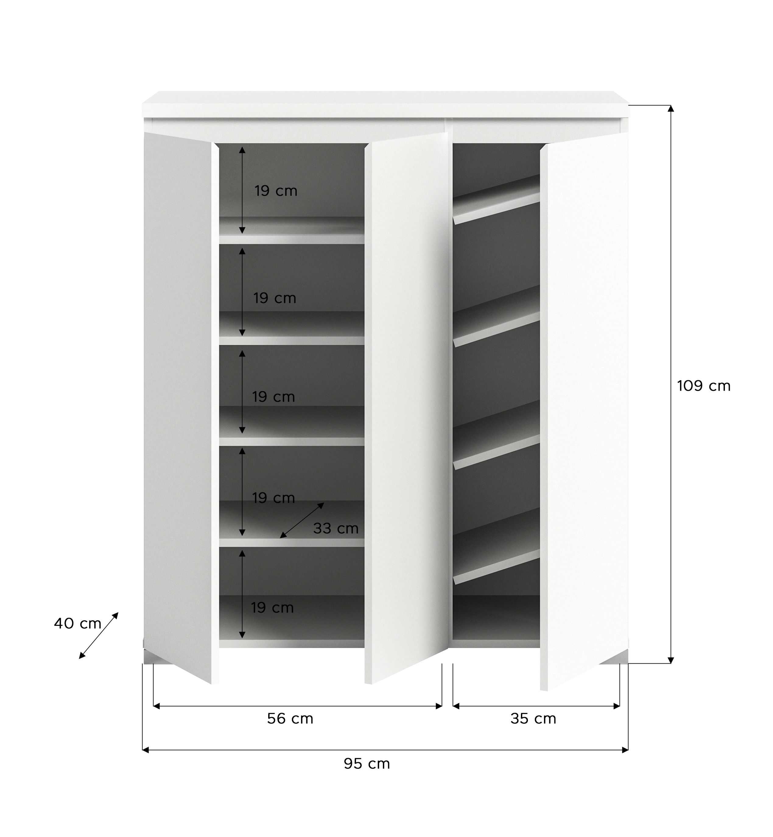 - Funktionalität: Mit seinen kompakten Abmessungen bietet der Schuhschrank ausreichend Stauraum für Schuhe und andere Accessoires, während er gleichzeitig Platz spart und den Raum optimal nutzt, was zu einer effizienten Organisation beiträgt.