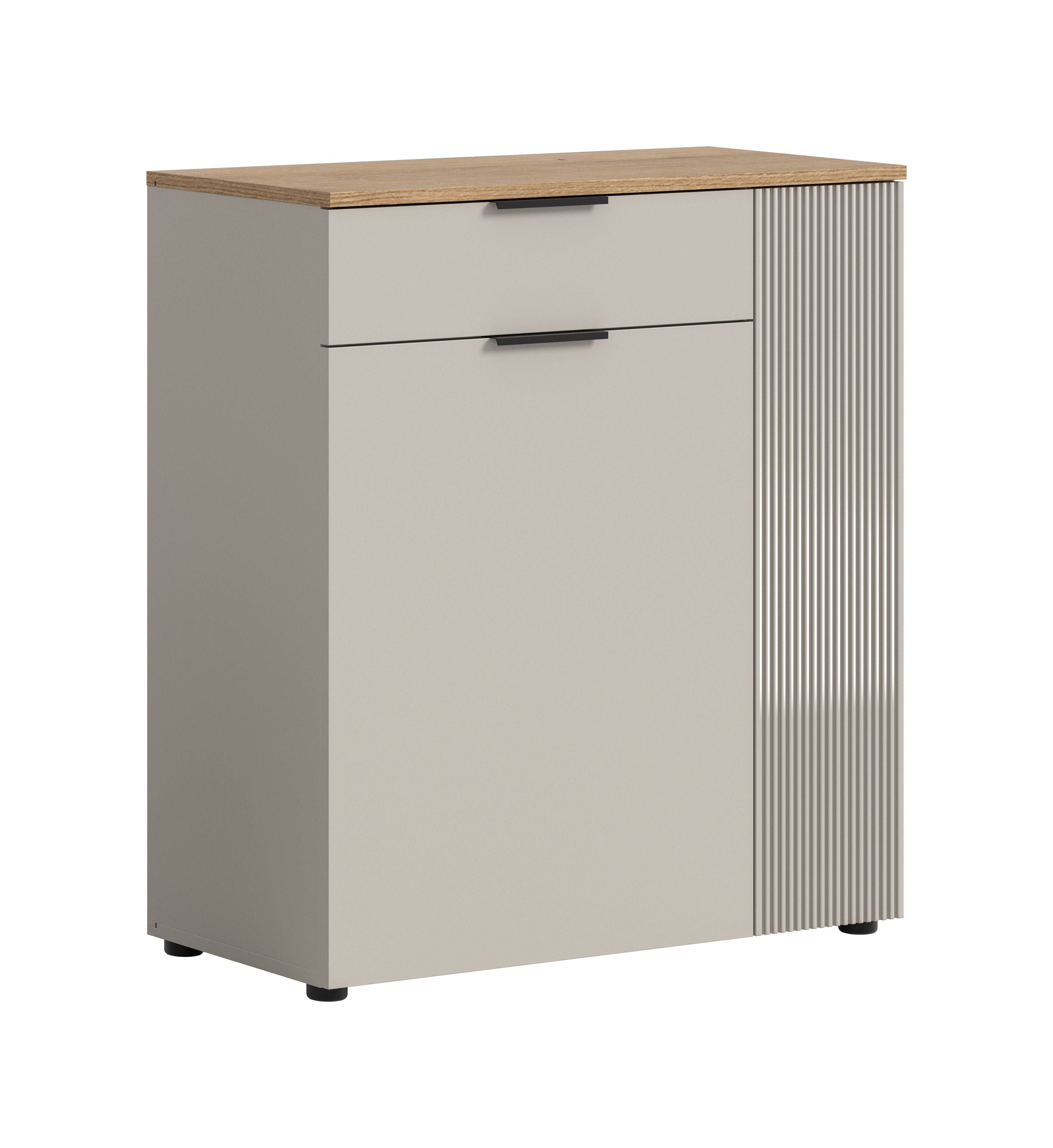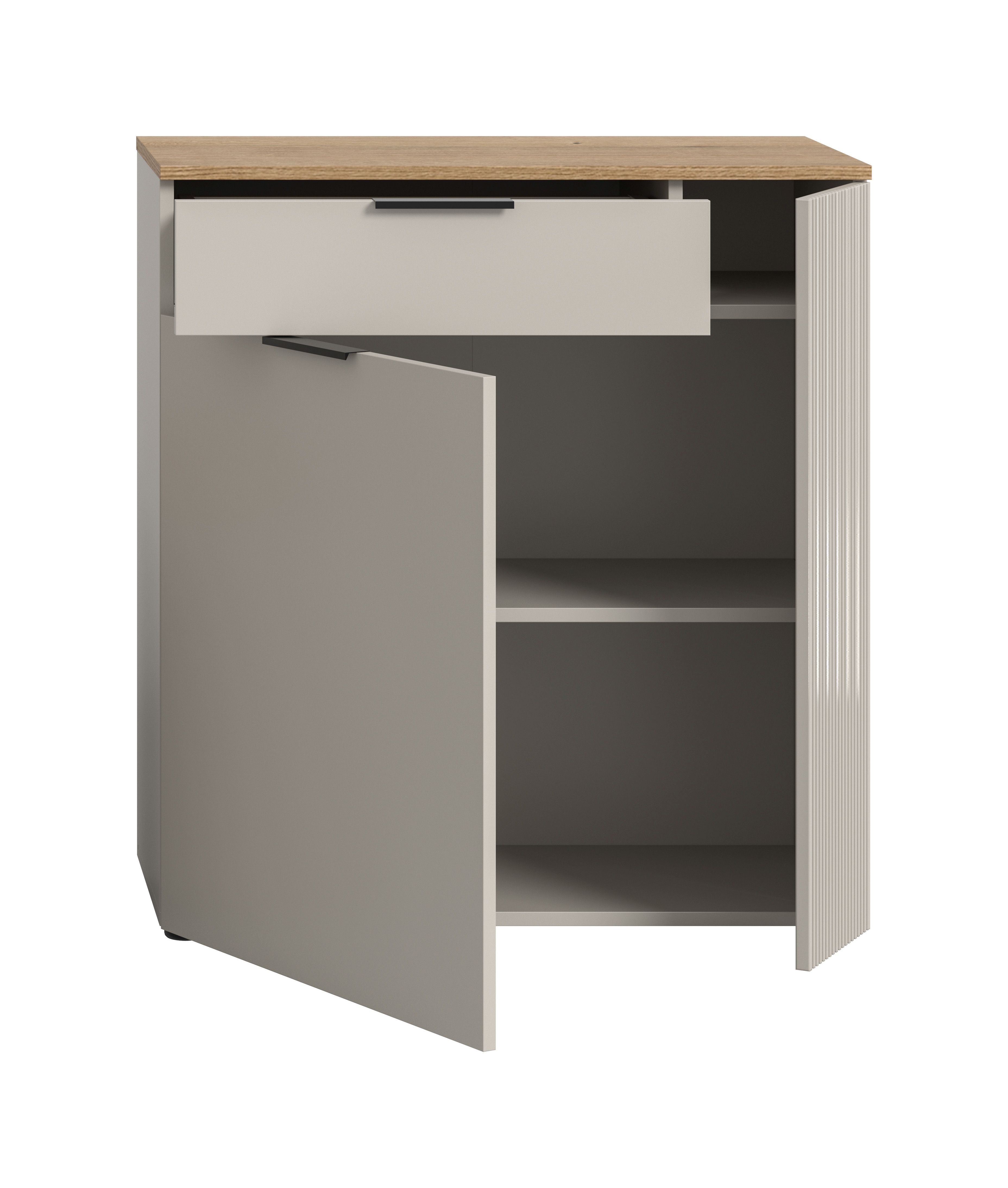 Die Garderobenkommode in Kaschmir-Nachbildung (80x88x36 cm) verbindet stilvolles Design mit praktischer Funktionalität. Mit zwei Türen, einem Schubkasten und einem herausnehmbaren Einlegeboden bietet sie vielseitigen Stauraum für bis zu sechs Paar Schuhe. Die Front mit eleganter Längstfräsung setzt dabei einen modernen Akzent und sorgt für ein aufgeräumtes Ambiente im Eingangsbereich. Robust und zugleich ansprechend – ideal für eine ordentliche und einladende Garderobe.