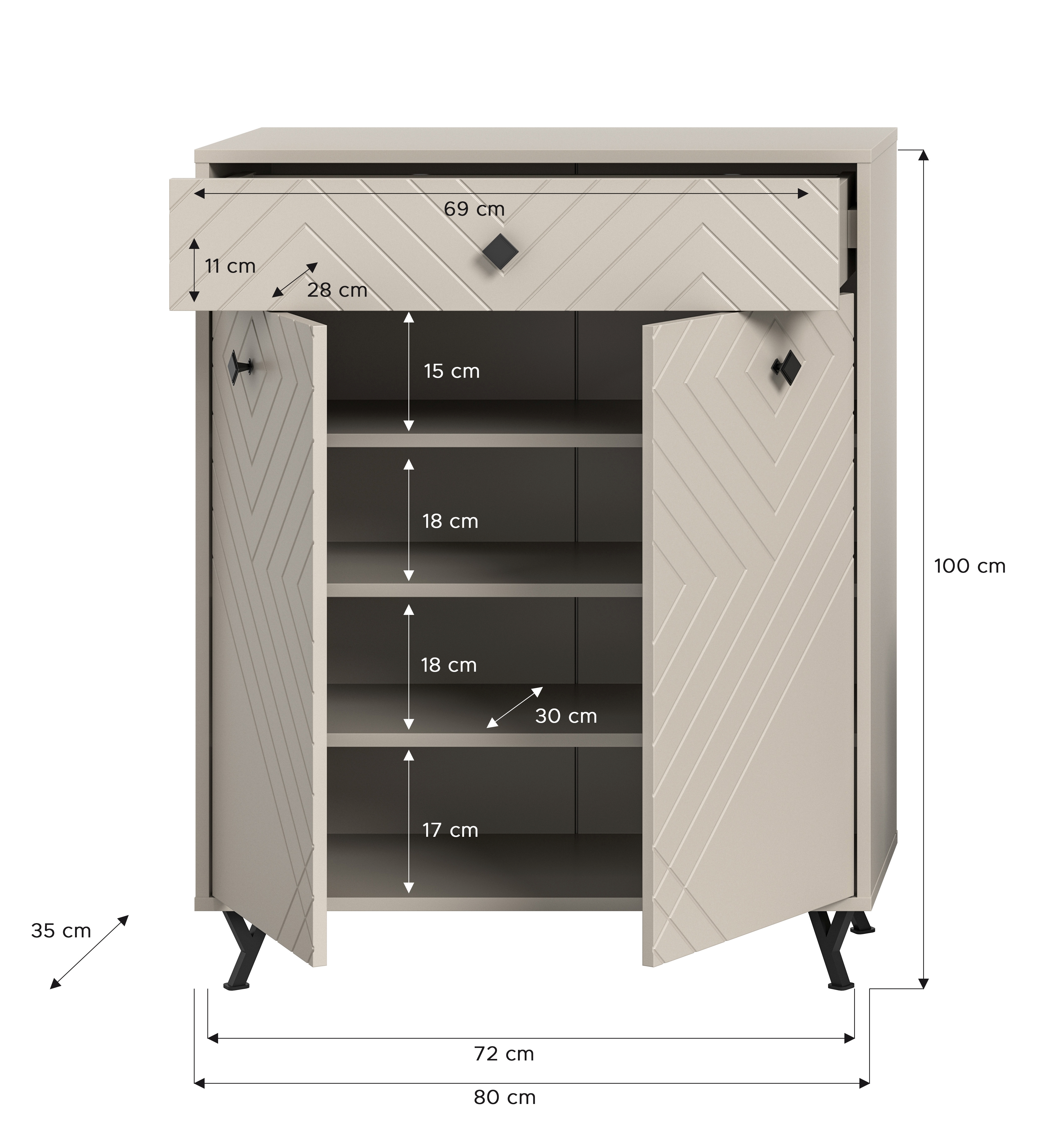 Entdecken Sie unsere praktische Schuhkommode für Flur, Diele oder Hauswirtschaftsraum, ausgestattet mit Maßen von 80x100x35 cm. Die sandbeige Melamin- und matt tiefgezogene Oberfläche verleiht Ihrem Raum ein warmes und einladendes Ambiente, während großzügiger Stauraum für Ordnung sorgt. Holen Sie sich jetzt dieses funktionale und stilvolle Möbelstück für Ihren Eingangsbereich.