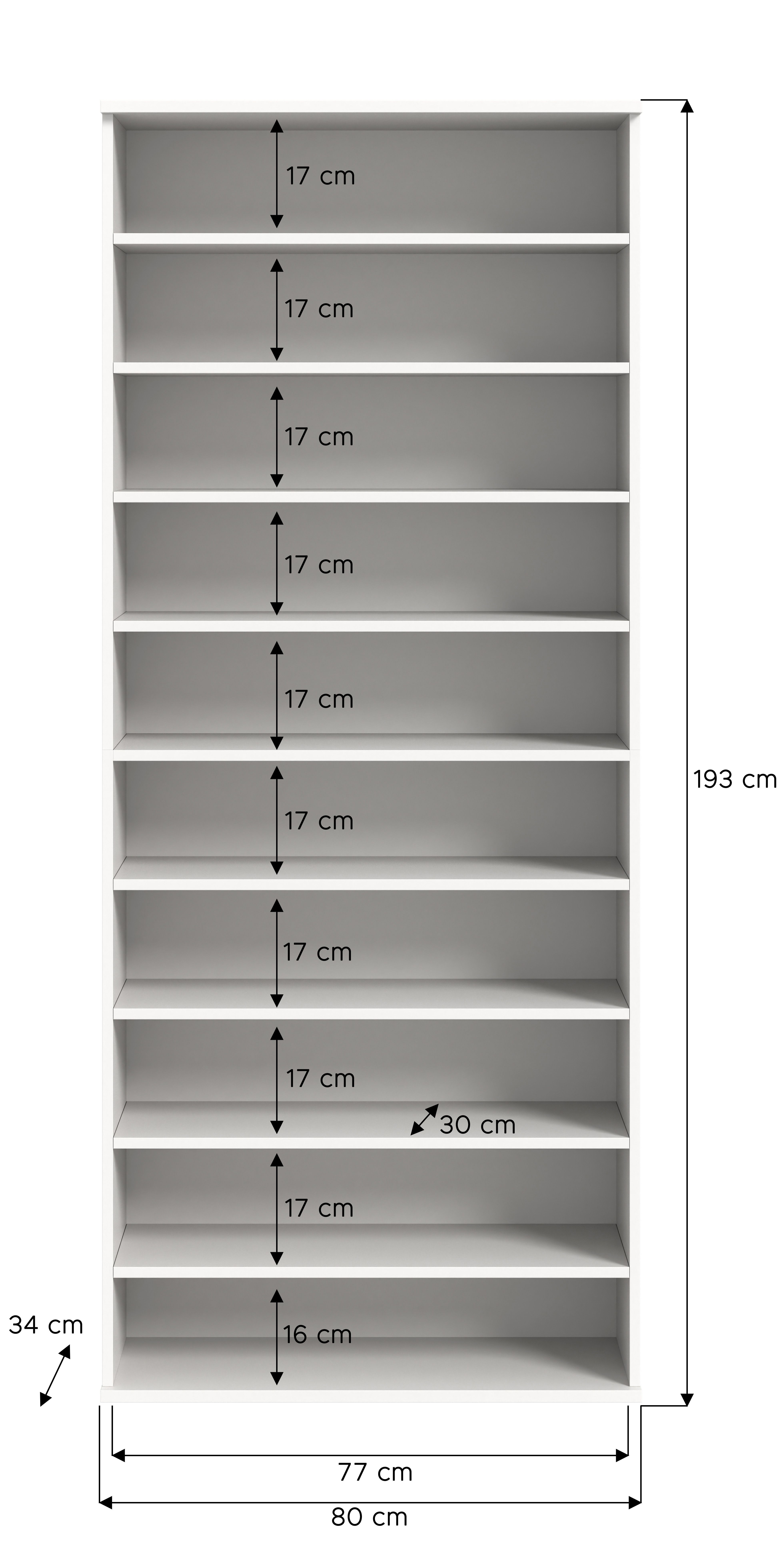 Entdecken Sie unser hohes Schuhregal in Weiß (B/H/T: 80x191x34 cm), die ideale Lösung für eine organisierte und stilvolle Schuhaufbewahrung. Mit neun Böden bietet dieses Regal ausreichend Platz für bis zu 33 Paar Schuhe – perfekt für jede Schuhliebhaberin und jeden Schuhliebhaber. Das moderne Design in zeitloser Weiß-Optik fügt sich harmonisch in jeden Raum ein, egal ob im Flur, Schlafzimmer oder Ankleidezimmer. Die offene Konstruktion ermöglicht Ihnen, Ihre Lieblingsschuhe mühelos zu präsentieren und gleichzeitig den Überblick zu behalten. Dank der robusten Bauweise ist das Schuhregal langlebig und optimal für den täglichen Gebrauch geeignet. Es ist nicht nur praktisch, sondern sorgt auch für eine aufgeräumte und einladende Atmosphäre in Ihrem Zuhause. Die einfache Montage ermöglicht eine schnelle Einrichtung, sodass Sie im Handumdrehen die Vorteile des Regals genießen können. Setzen Sie auf Stil und Funktionalität mit unserem hohen Schuhregal in Weiß und schaffen Sie Ordnung für Ihre gesamte Schuhkollektion!