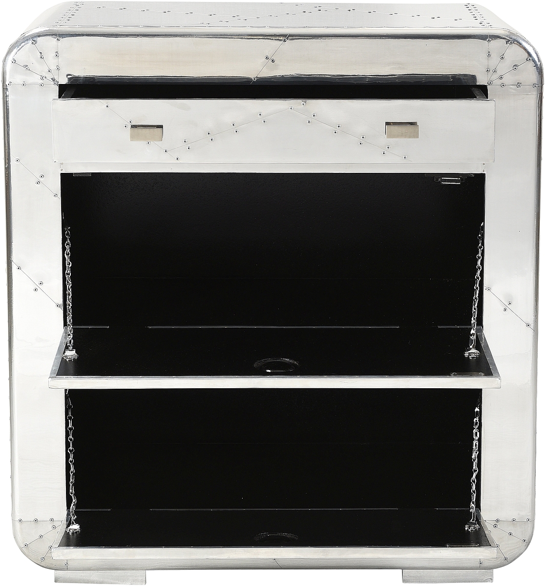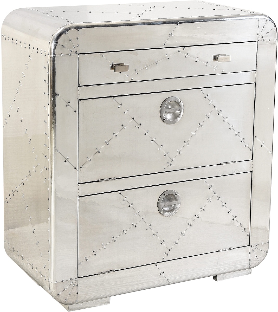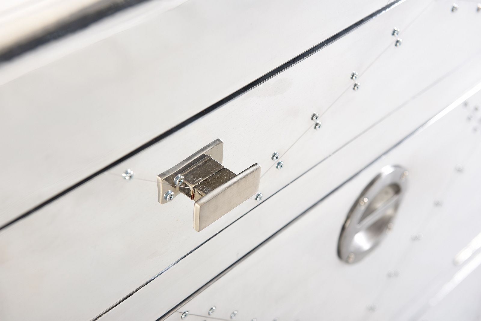 Mango massiv (Indien) kombiniert mit MDF (Mitteldichte Holzfaserplatte) mit Alubeschlägen in silberfarben