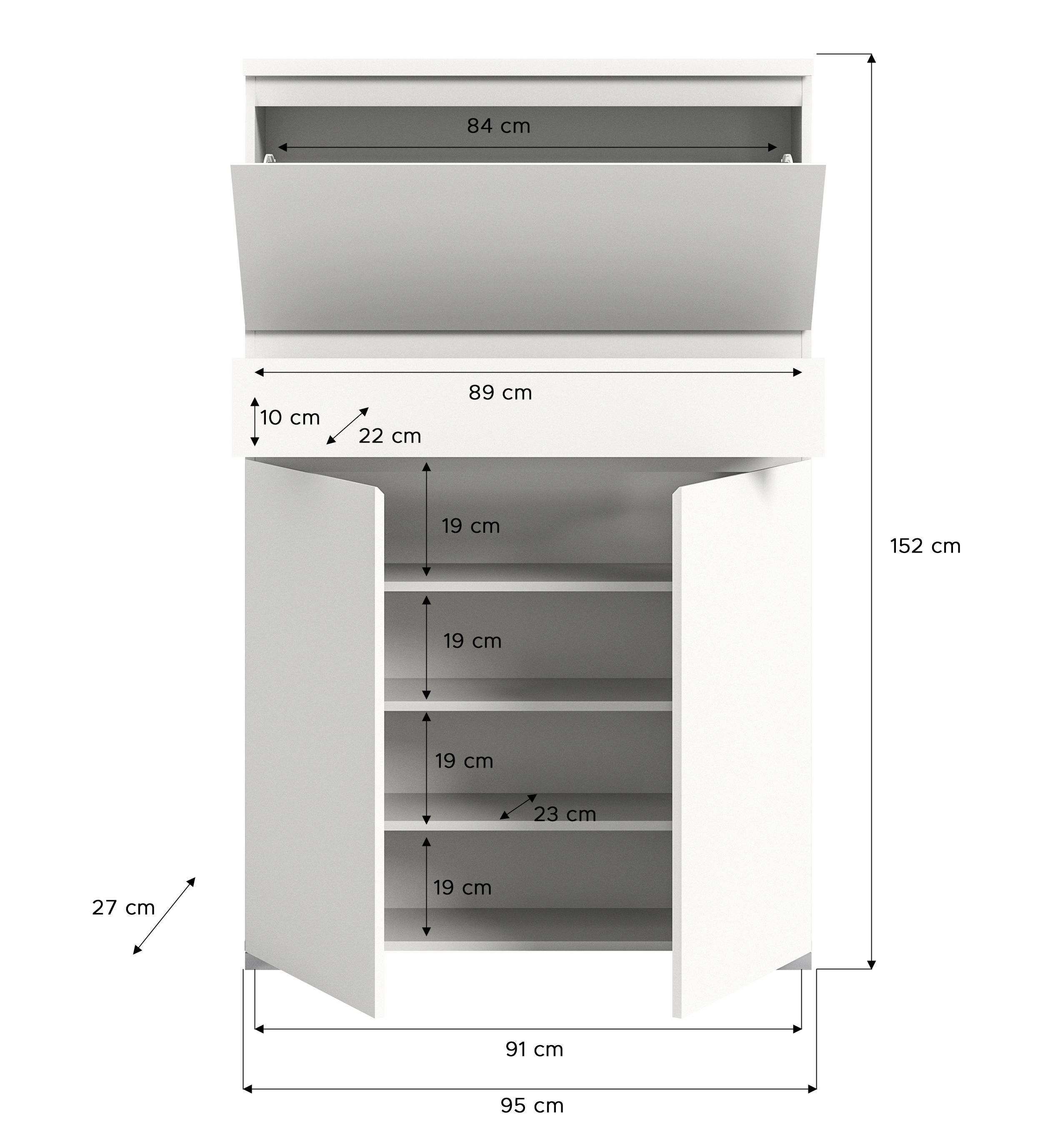 - Funktionalität: Mit seinen kompakten Abmessungen bietet der Schuhschrank ausreichend Stauraum für Schuhe und andere Accessoires, während er gleichzeitig Platz spart und den Raum optimal nutzt, was zu einer effizienten Organisation beiträgt.