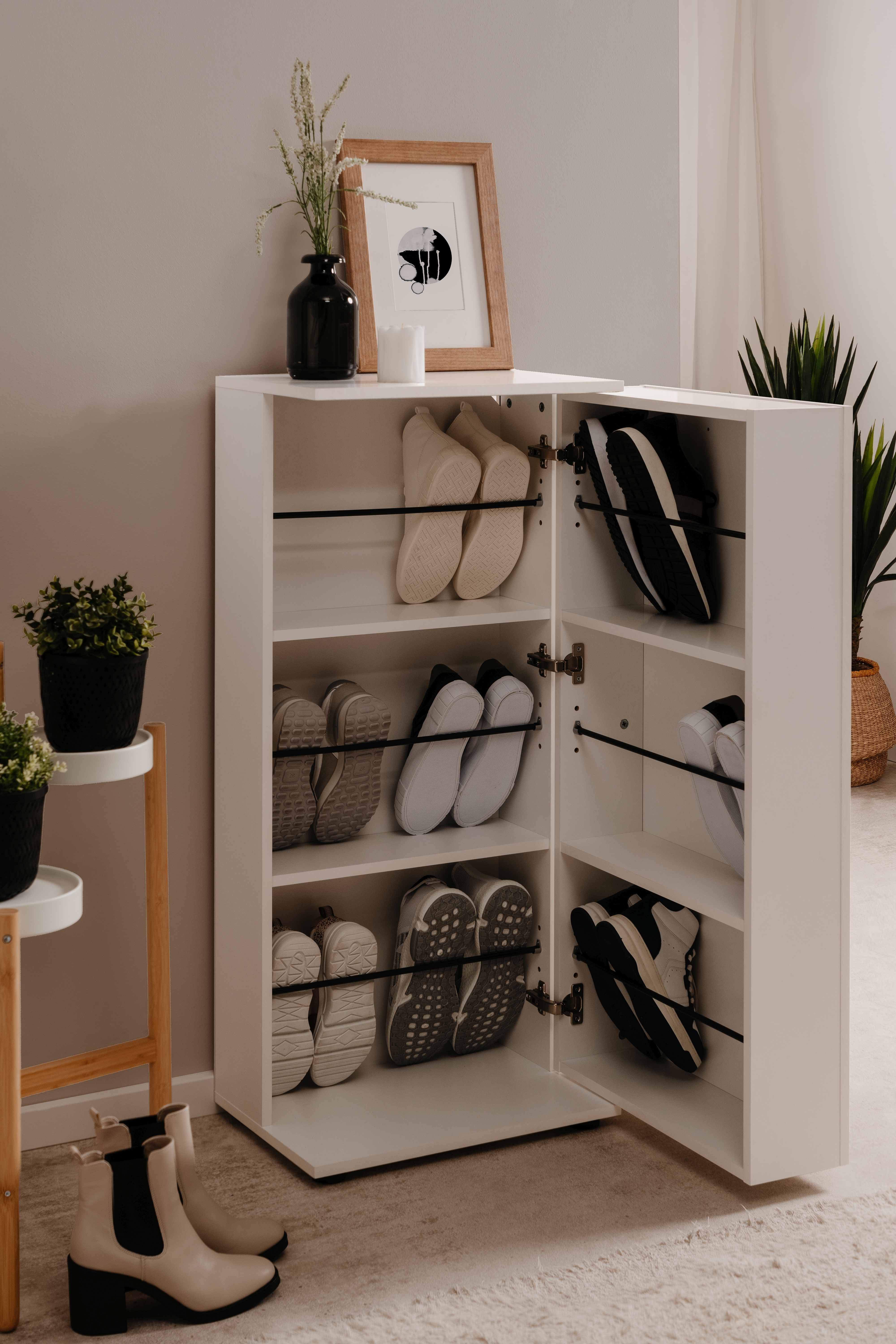 1 Tür mit 2 Einlegeböden und 3 Kunststoffstangen zur Schuhfixierung