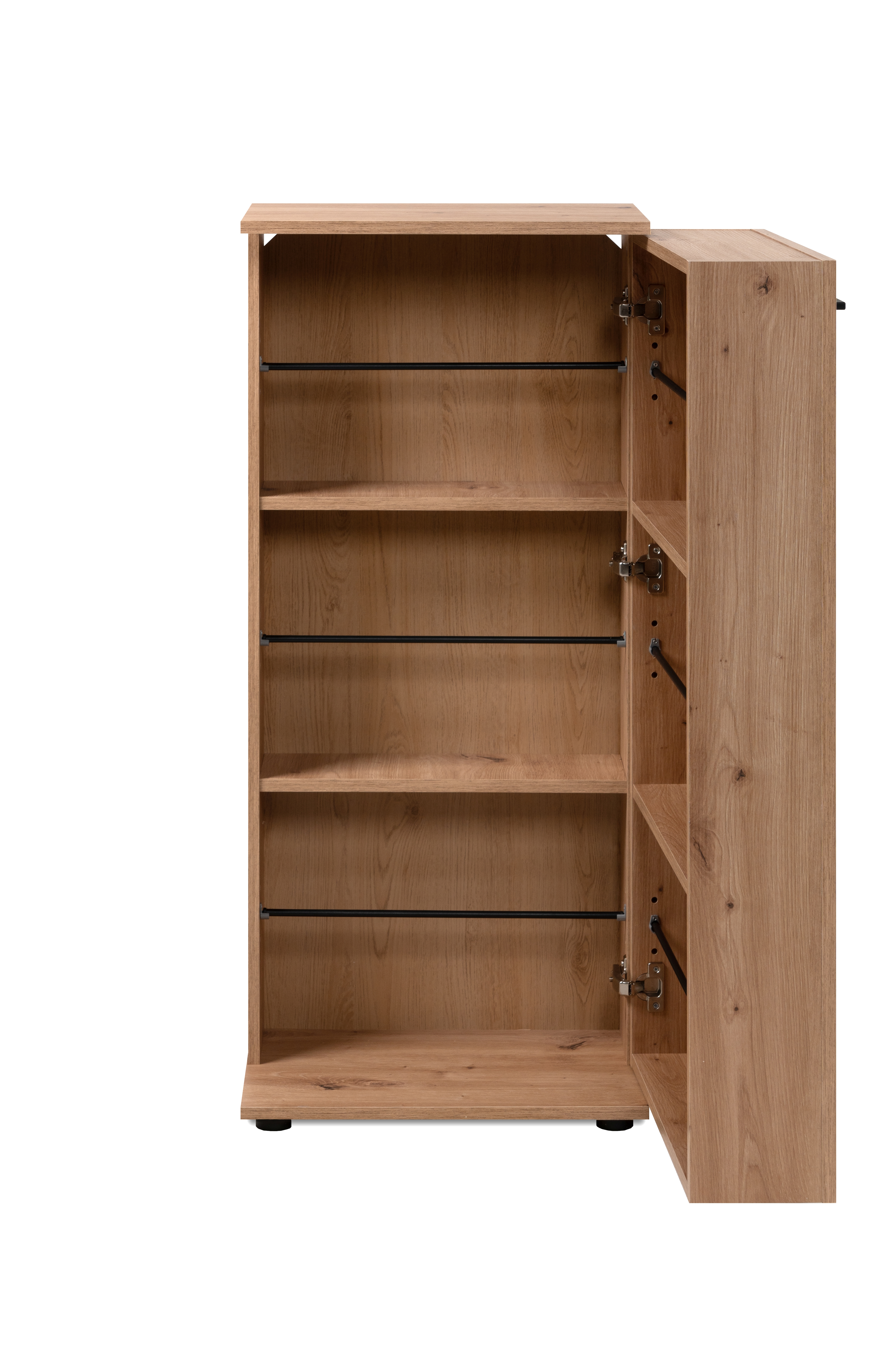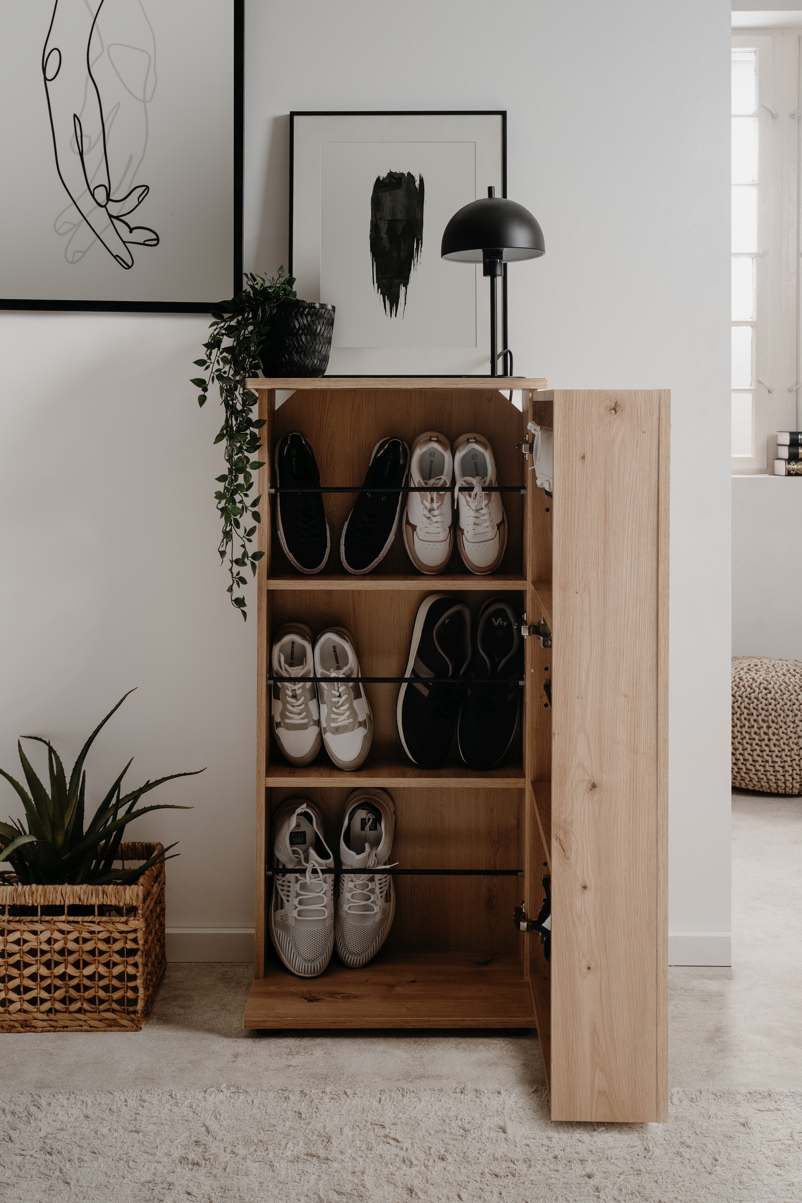 1 Tür mit 2 Einlegeböden und 3 Kunststoffstangen zur Schuhfixierung