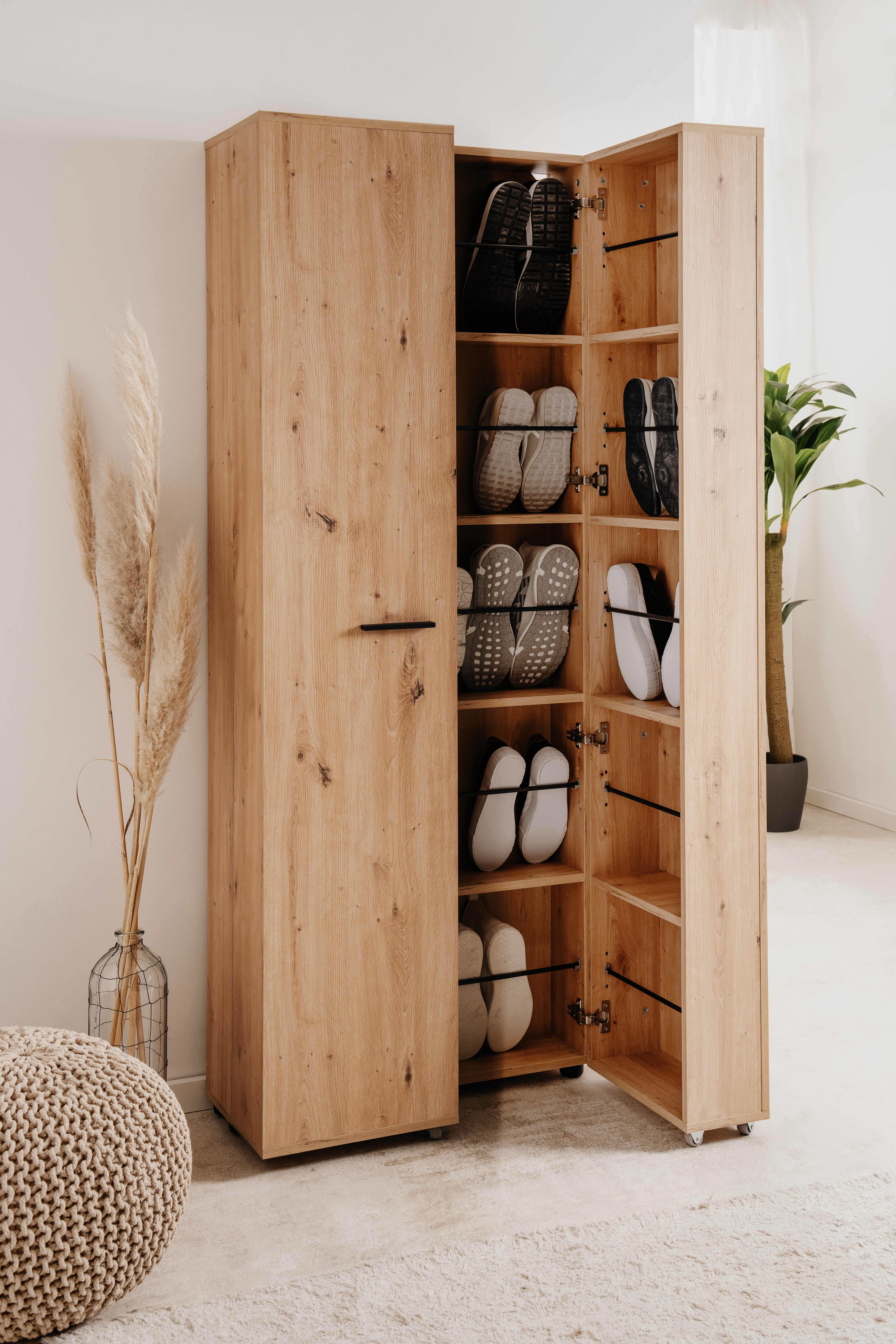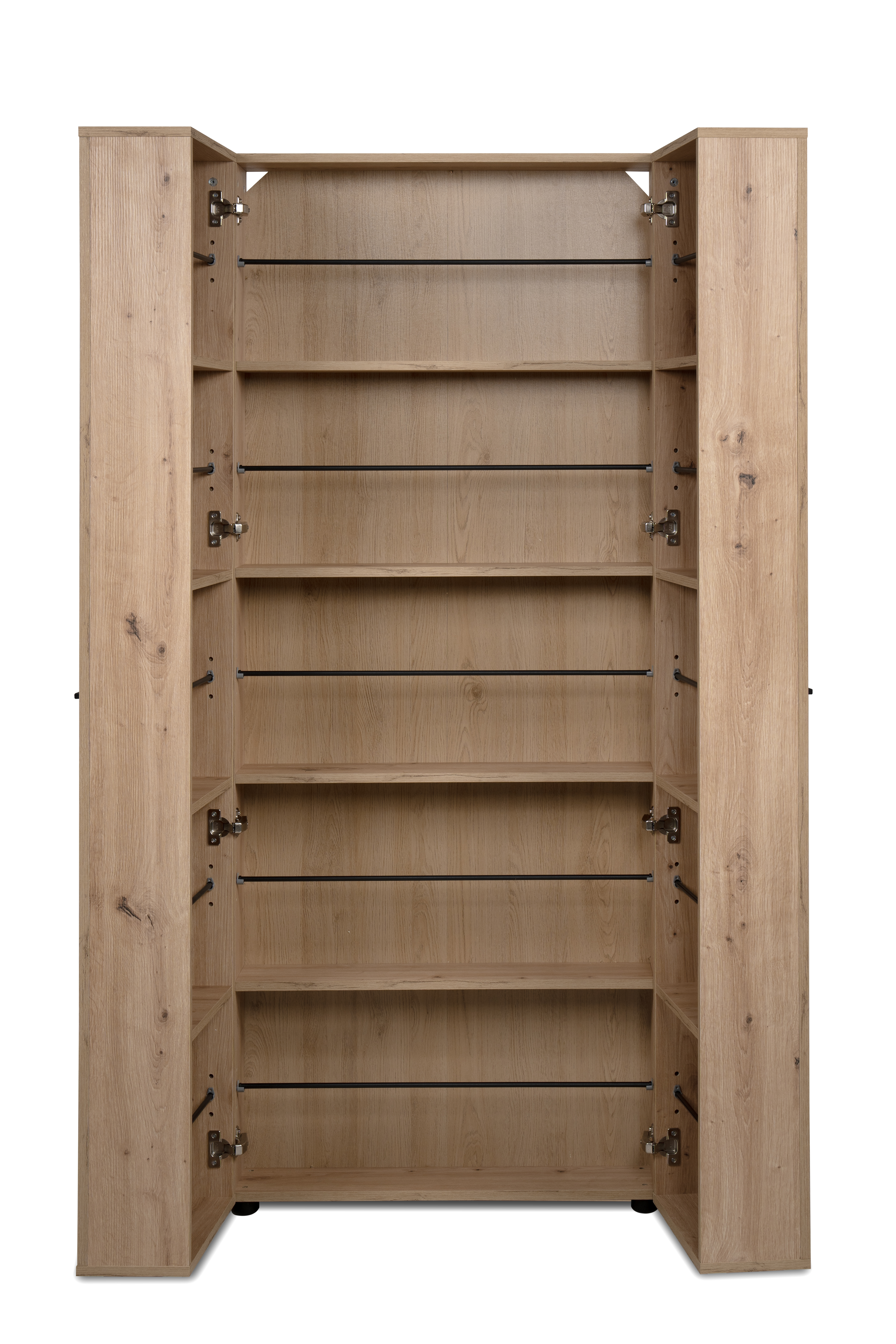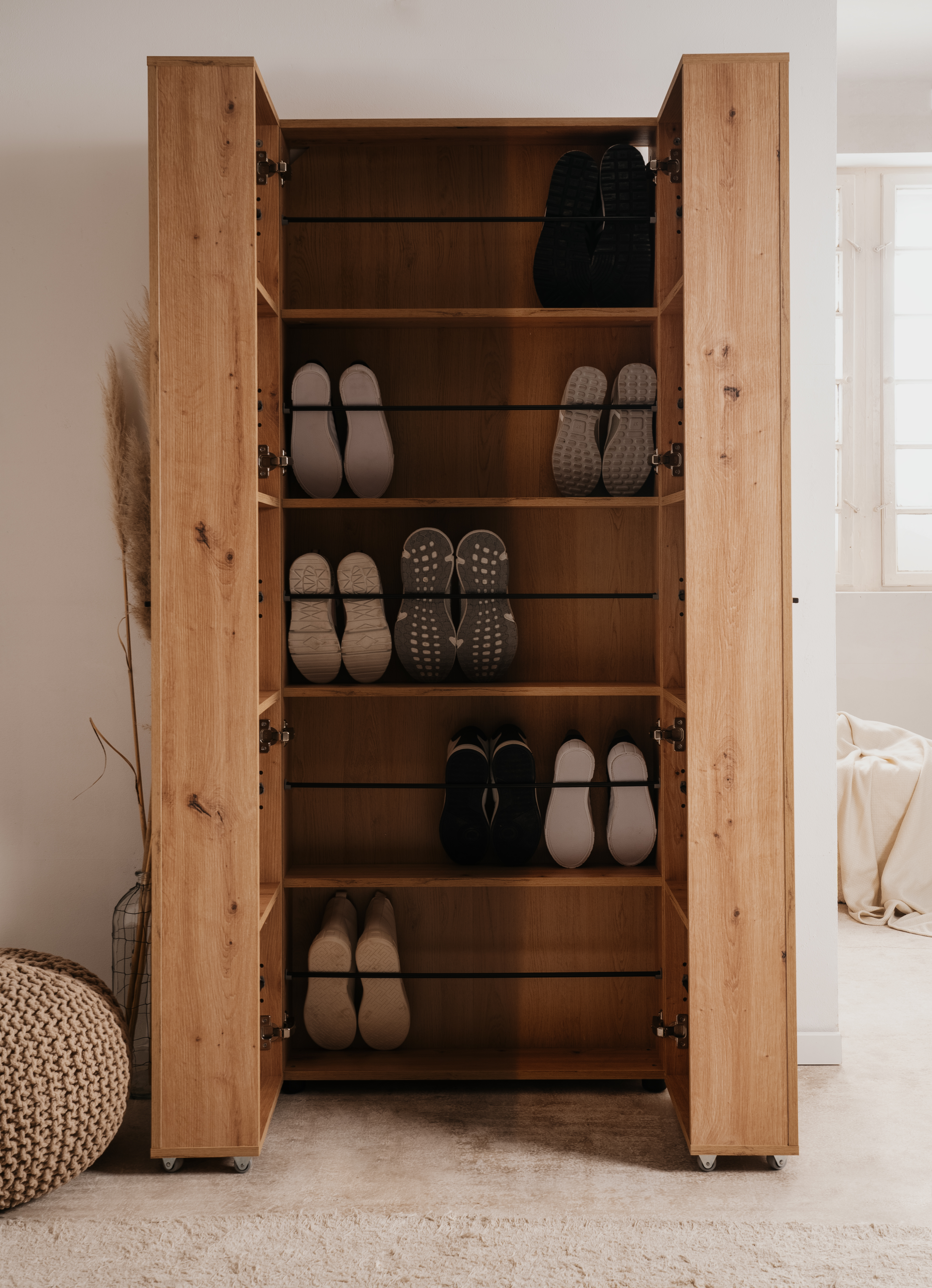 2 Türen mit Rollen und jeweils 4 Einlegeböden und 5 Kunststoffstangen zur Schuhfixierung